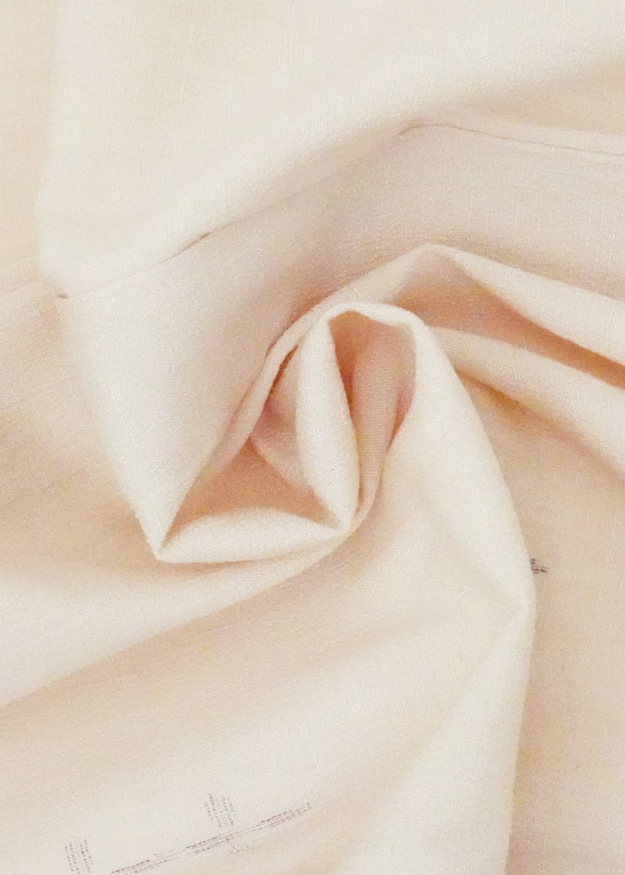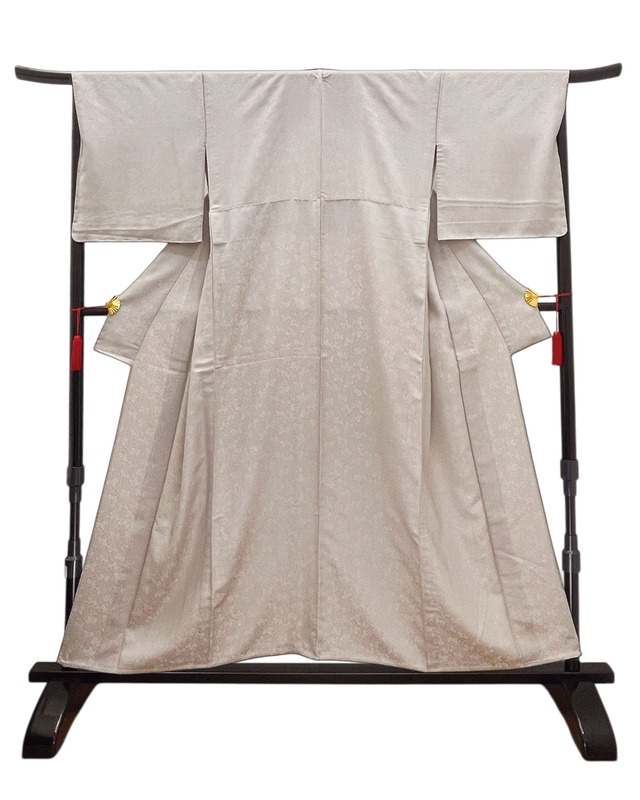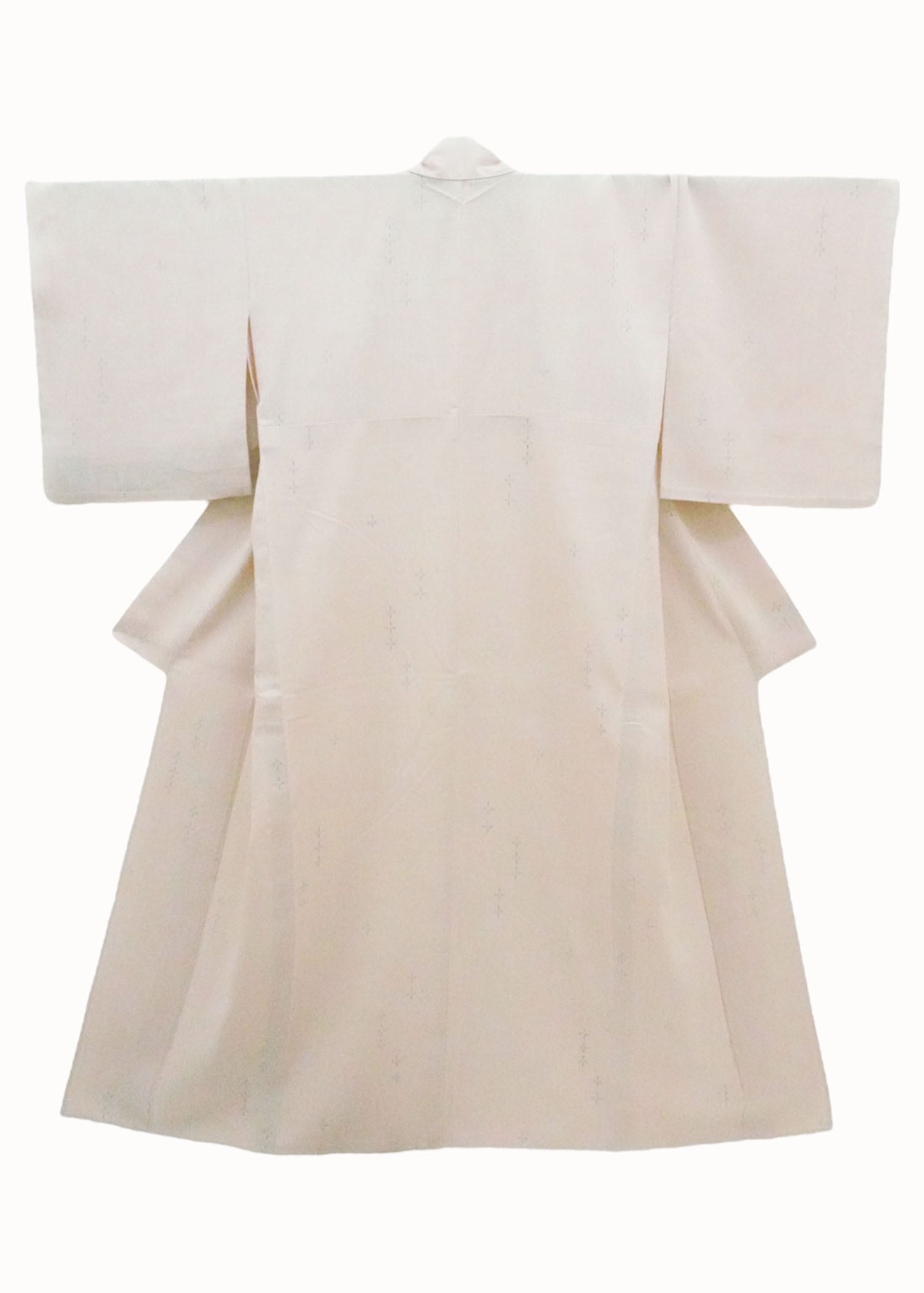 結城市を代表する織元さんである奥順の結城ちぢみです。デリケートなクリームピンクに非常に上品な十字絣が織り込まれています。結城ちぢみは本場結城紬の一種で、経糸に無撚糸、緯糸に強撚糸を使用して織られる織物です。湯通しして糊を落とすと、撚り糸が元に戻る作用で表面に細かなシボ(凹凸)が現れ、さらりとした清涼感のある肌触りが特徴です。結城紬の柔らかさと異なり、軽やかで涼しい着心地が人気で、特に単衣(ひとえ)の時期に最適な着物とされています。