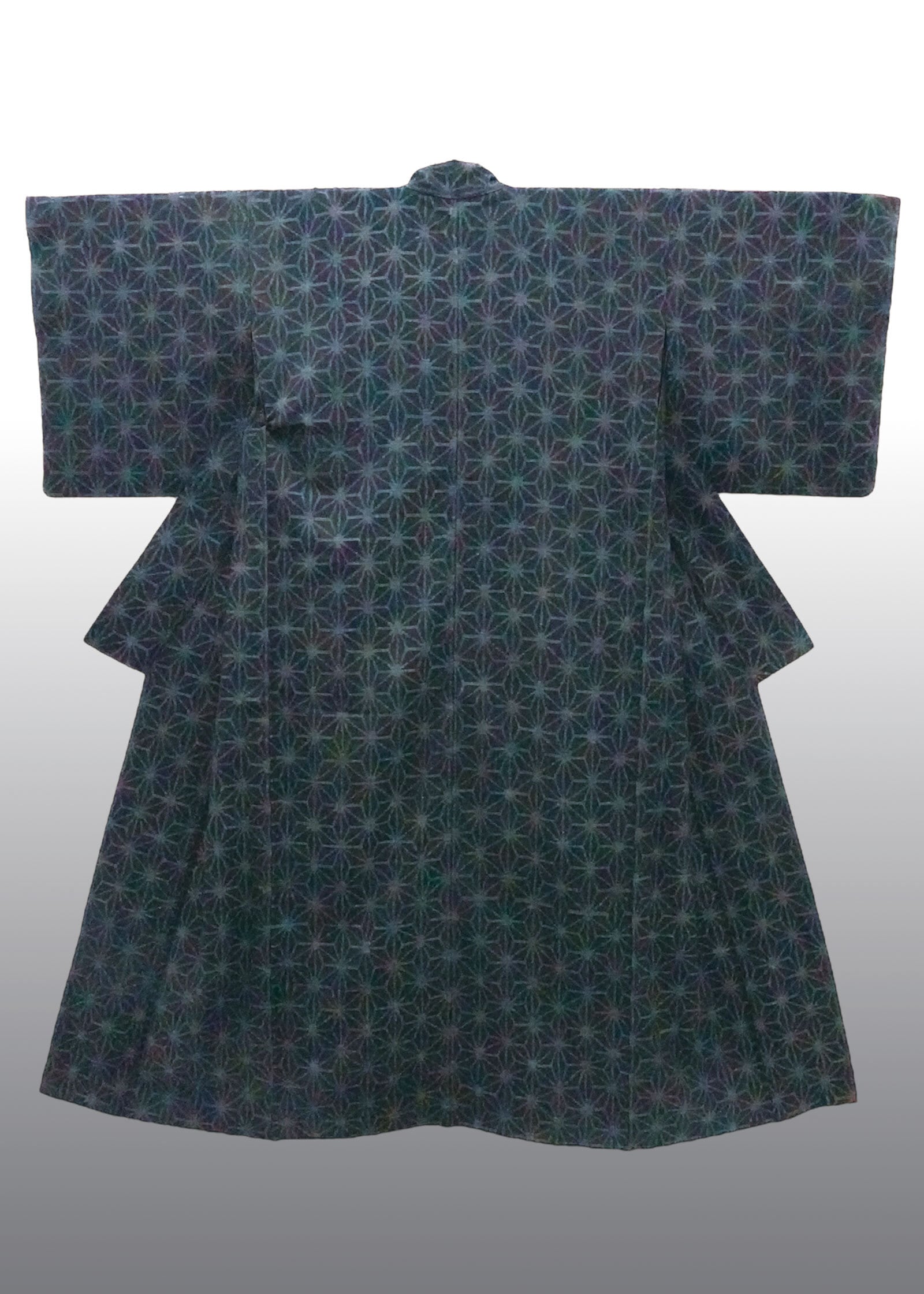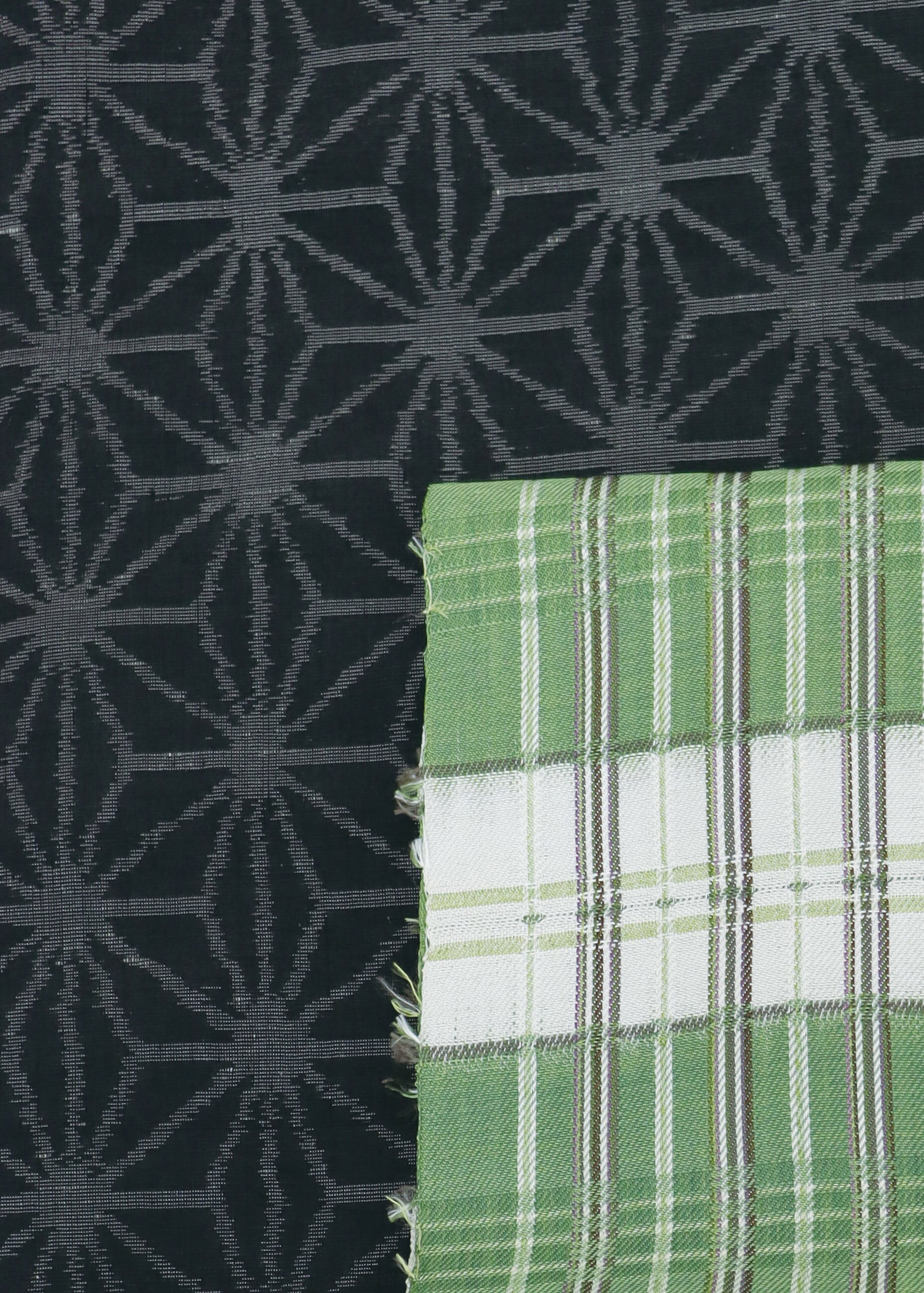 結城ちぢみは結城紬の織りの一種で、横糸に強撚糸(強く撚りをかけた糸)を用いることで、湯通し・糊付け処理後に表面に細かな凹凸(シボ)が生まれるさらりとした風合いが特徴です。結城紬が「軽くて暖かい」のに対し、結城縮は「軽くて涼やか」で、単衣(ひとえ)の着物として単衣の時期に好まれます。今回ご紹介するのは大きな麻の葉柄を持つ濃紺のちぢみです。重厚な中に繊細さを併せ持つ品格のある紬です。