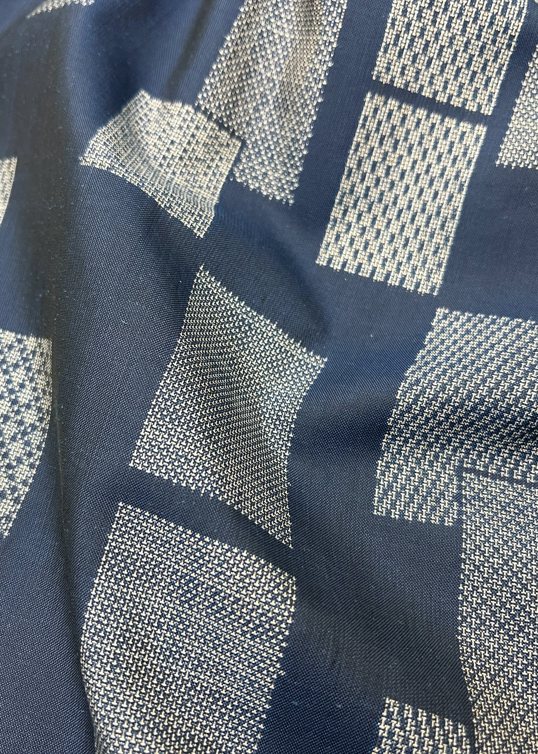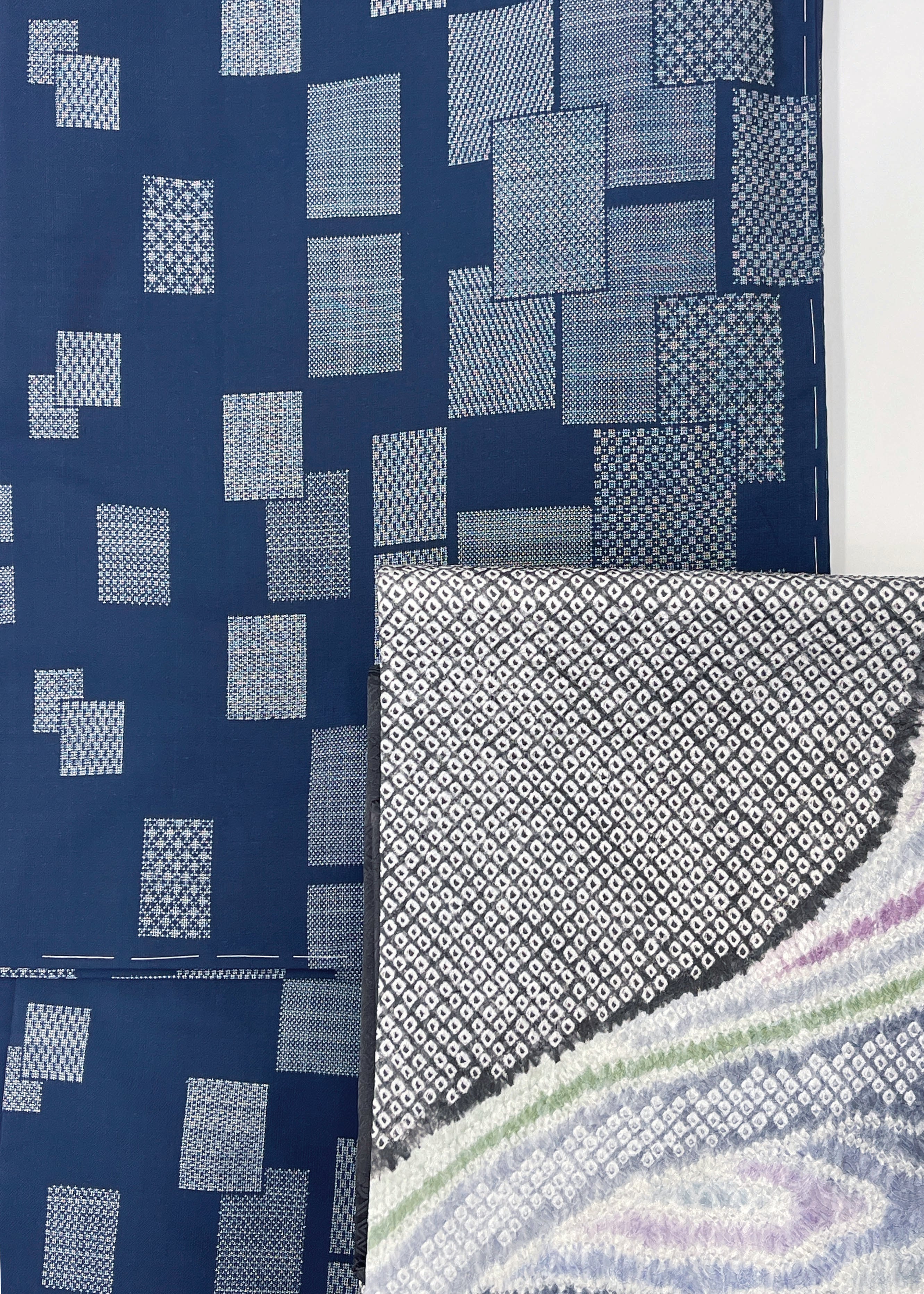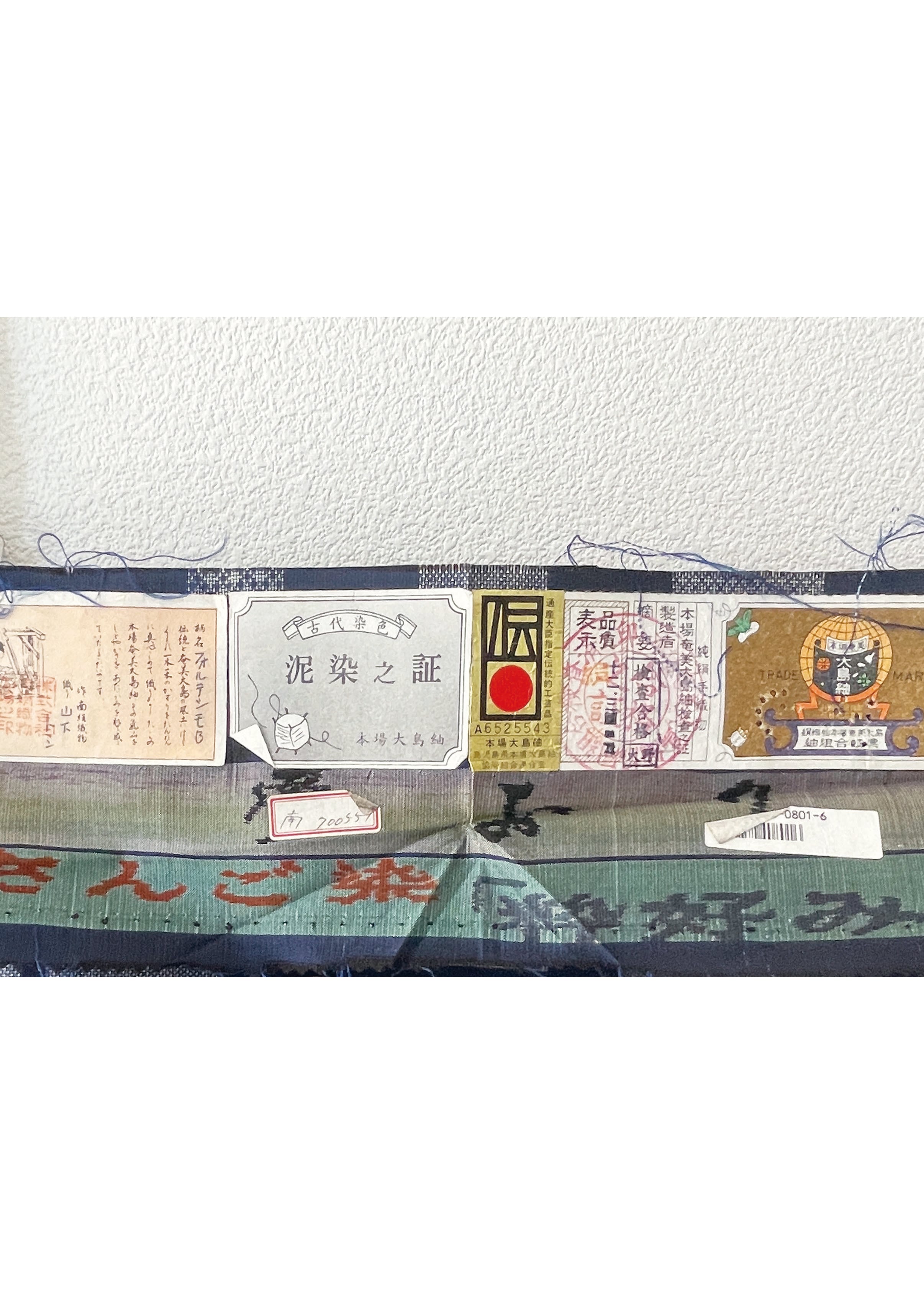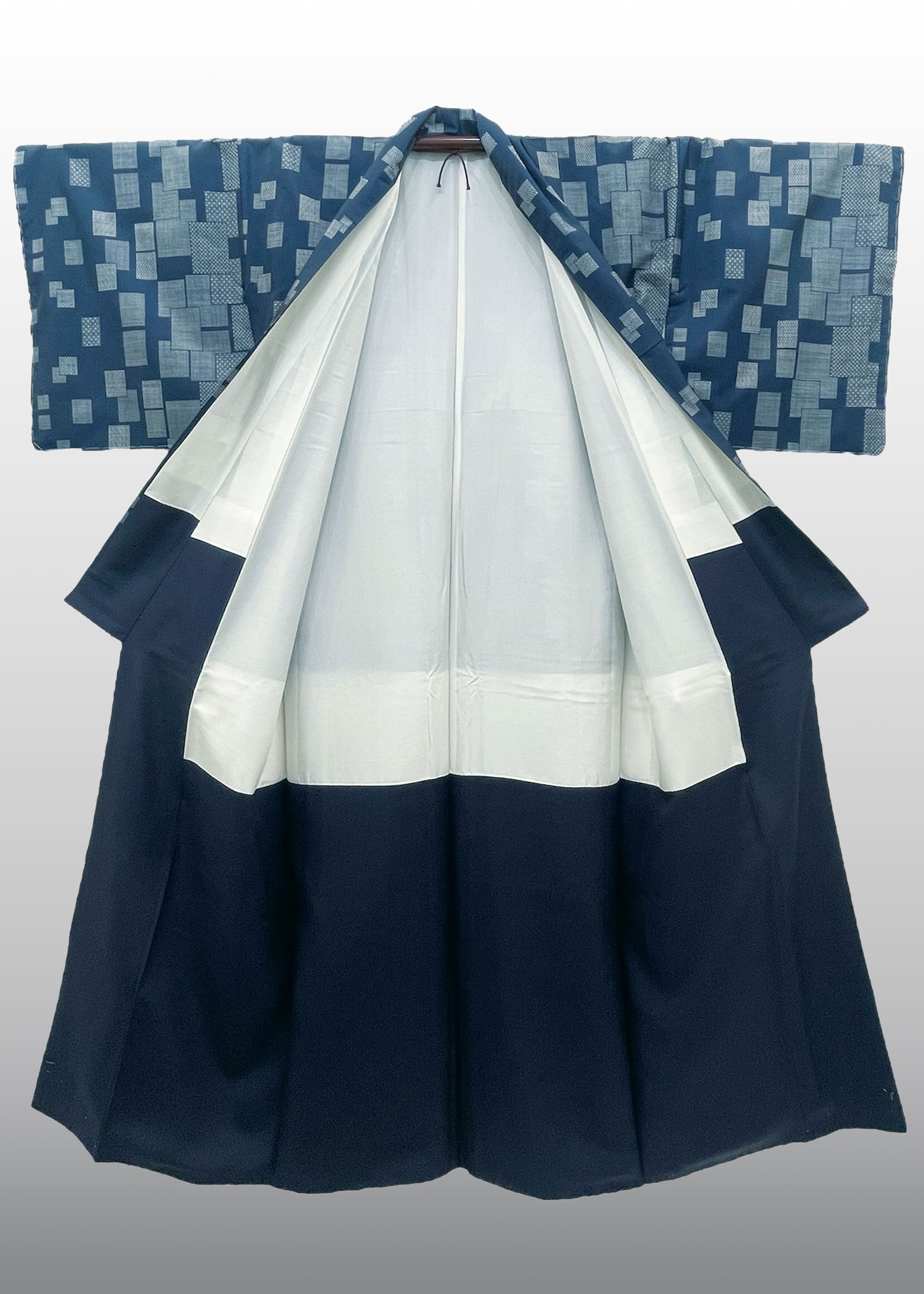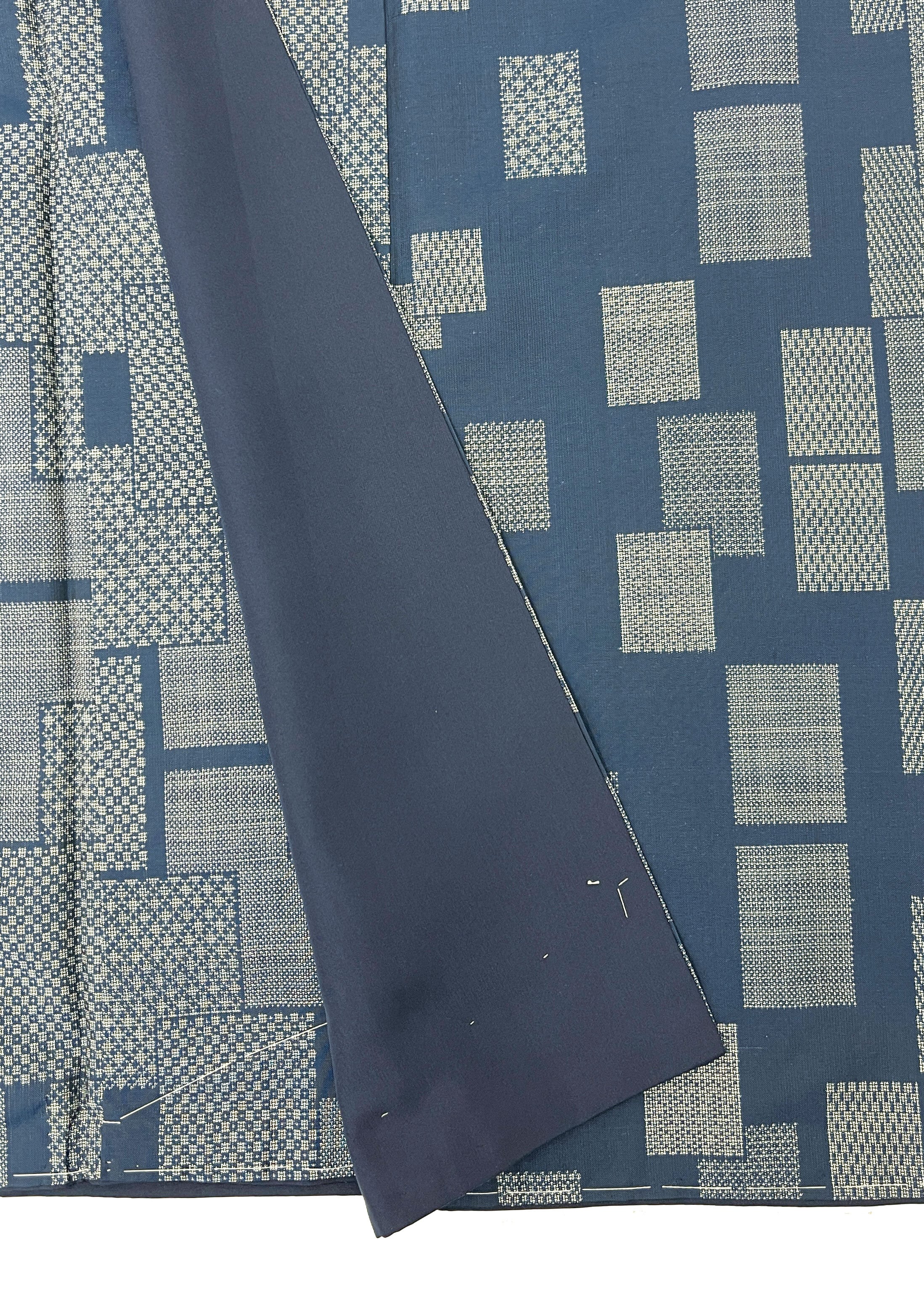 藍大島とは大島紬の一種で植物藍で藍染めした糸を用いて柄(絣模様)を織り出したものです。現在ではあまり作られなくなりました。今回ご紹介する藍大島は様々な織り方が混在し12マルキにも相当するかの様な細かさ持つ非常に珍しい大島です。しつけ糸付き。