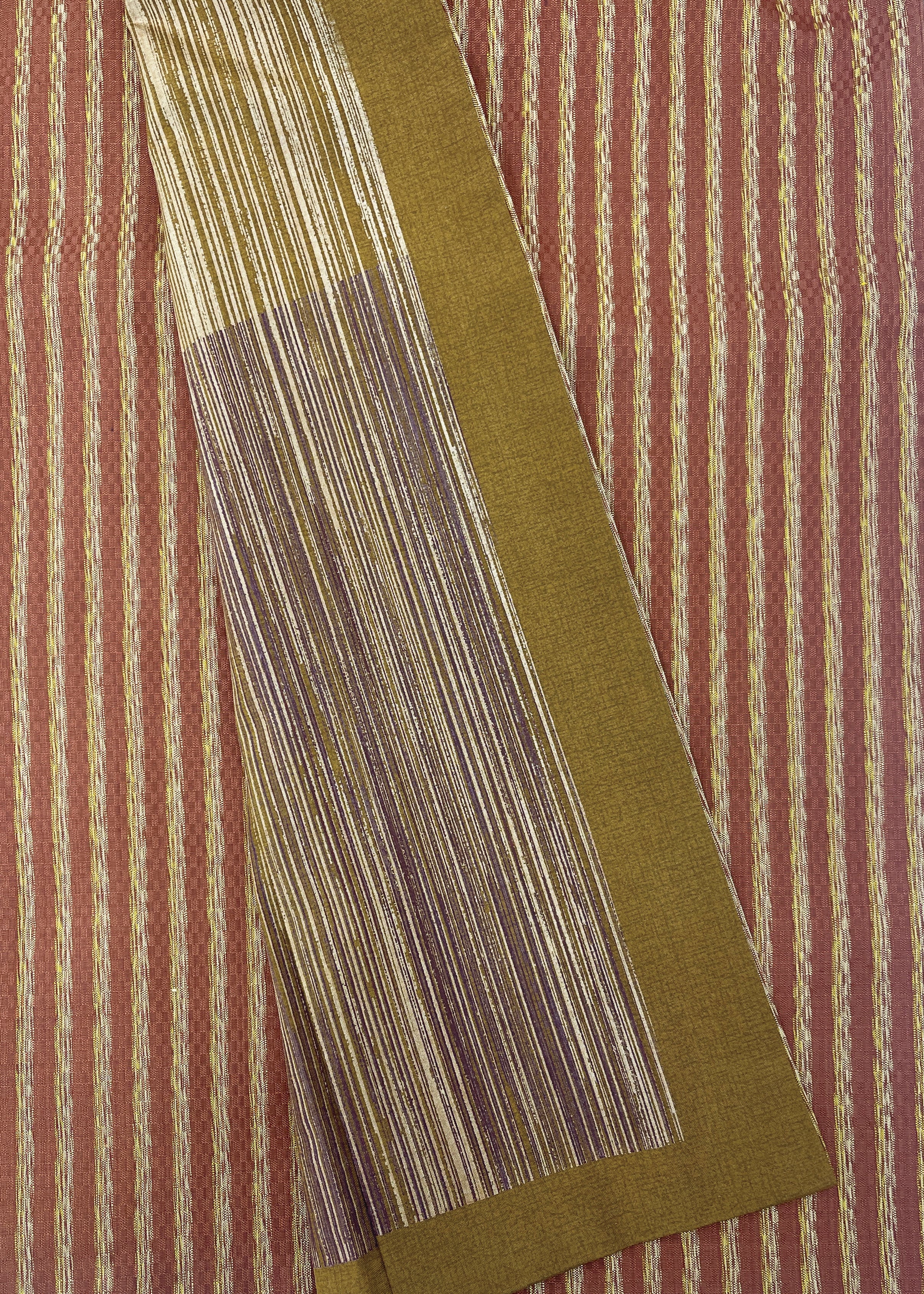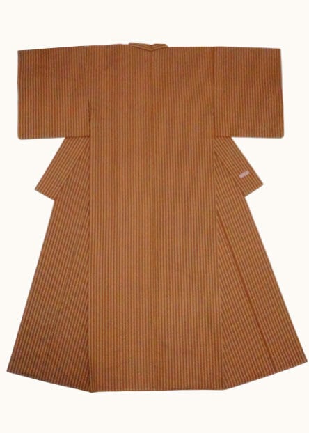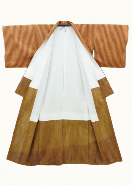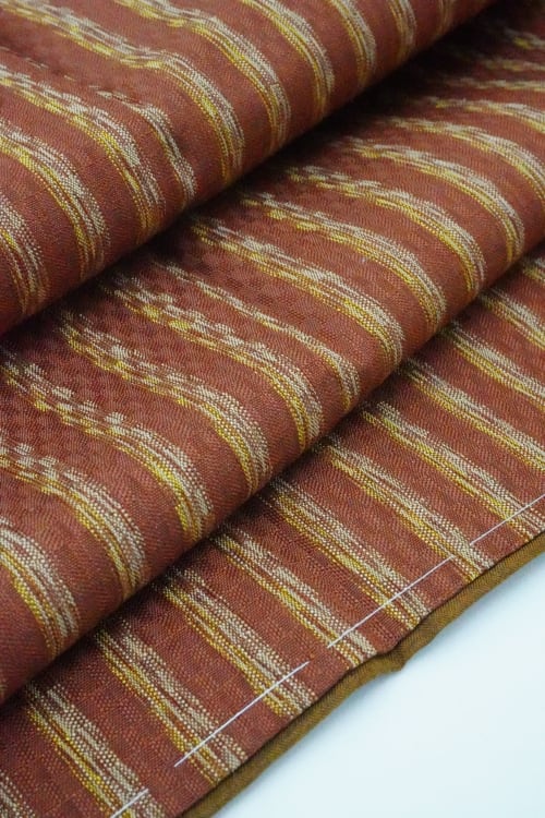 今回ご紹介するお着物は従来の黄色に加え、樺色はマダミ(タブの木)の樹皮、黒色は椎の木の樹皮と沼浸けで染めて行きます。染色と乾燥を何度も繰り返して定着させたものです。非常に珍しい縞が表現されています。