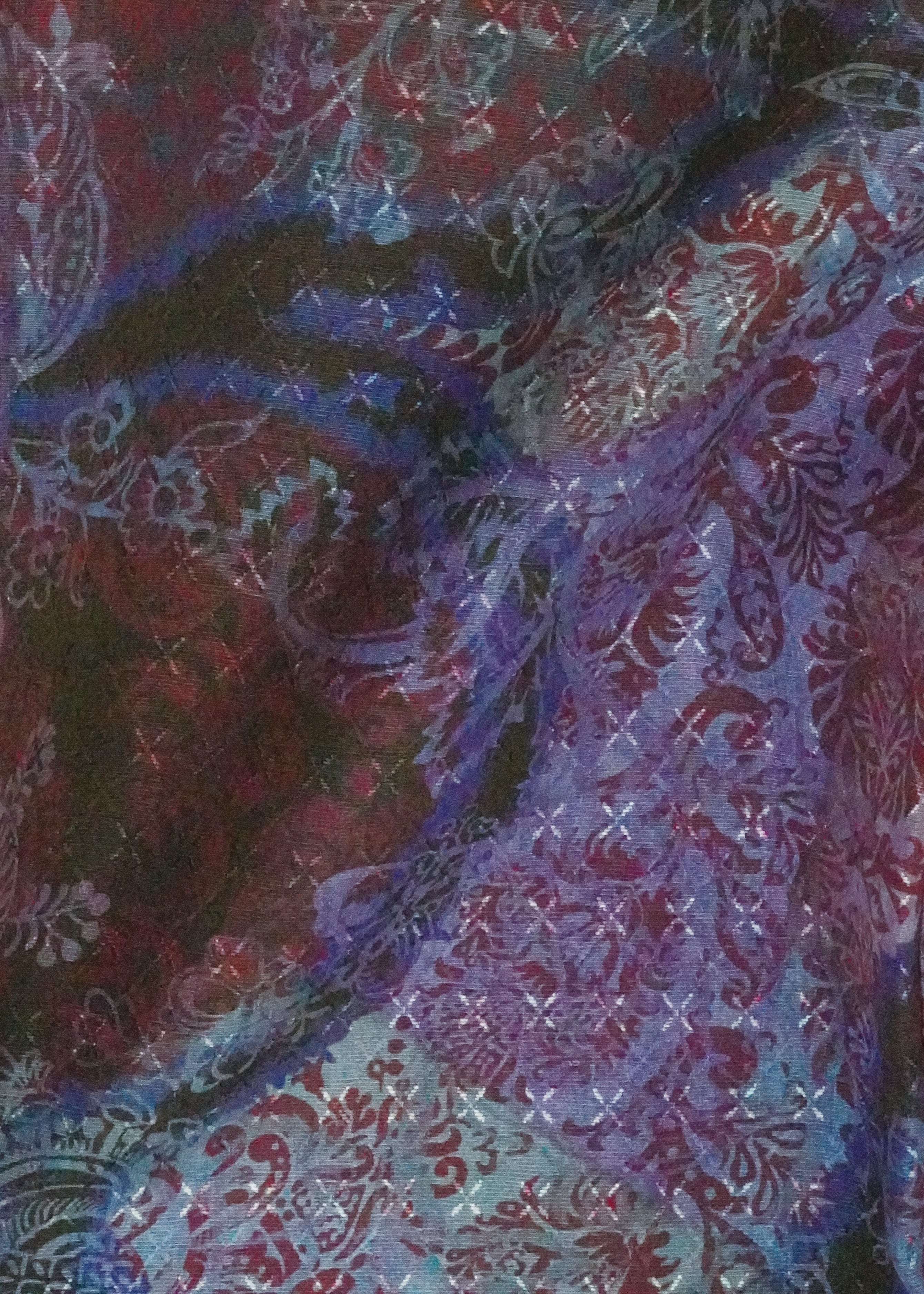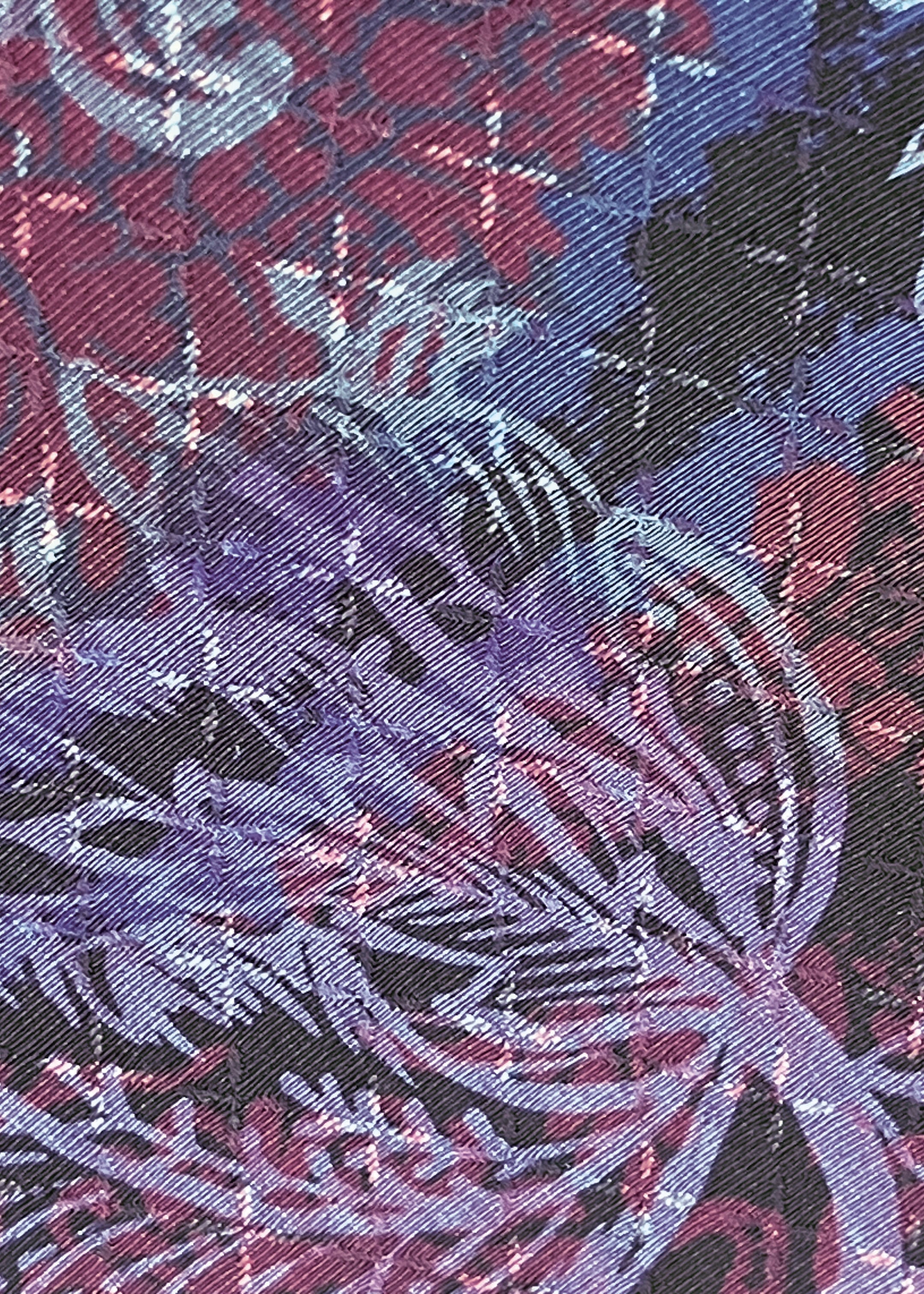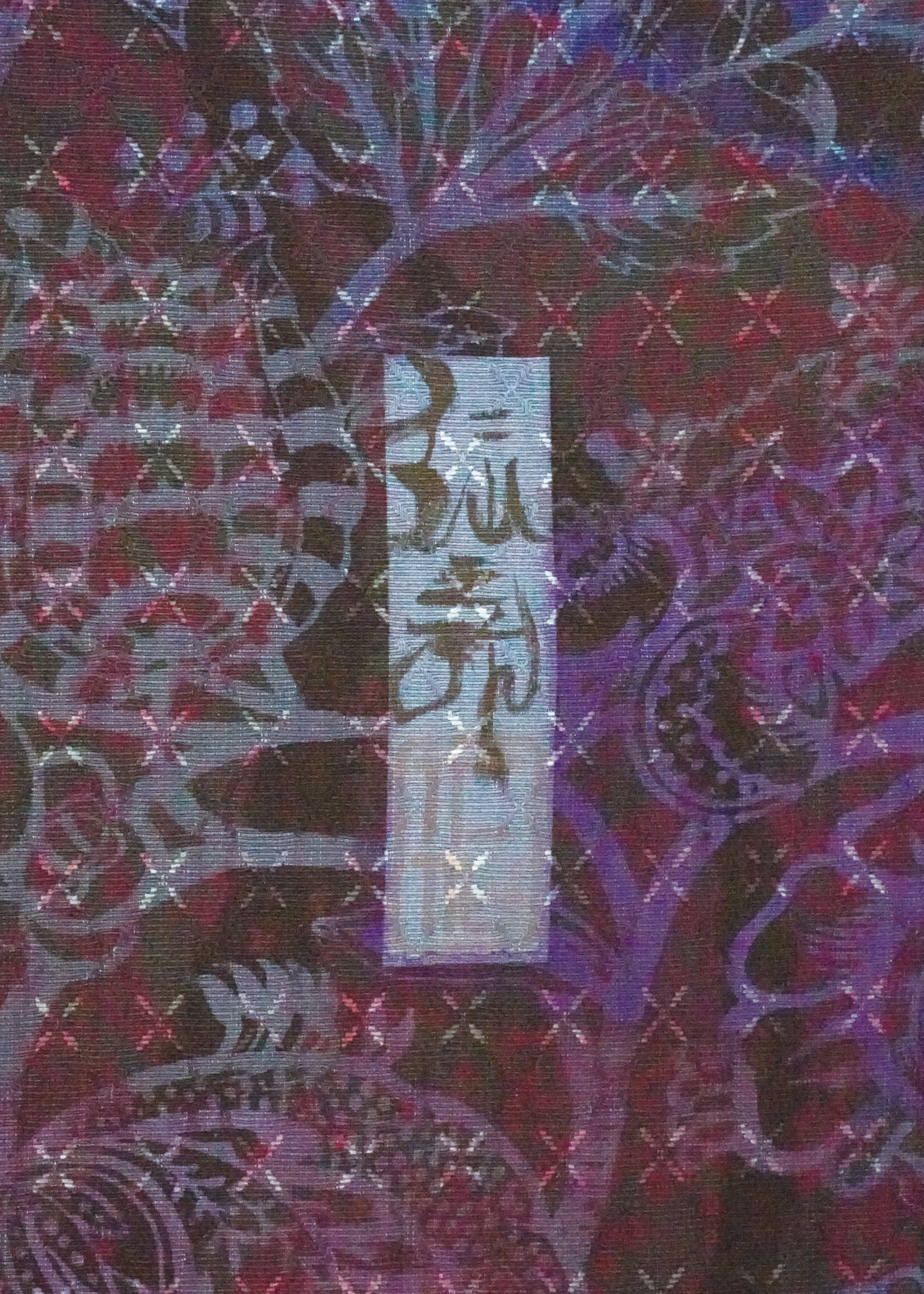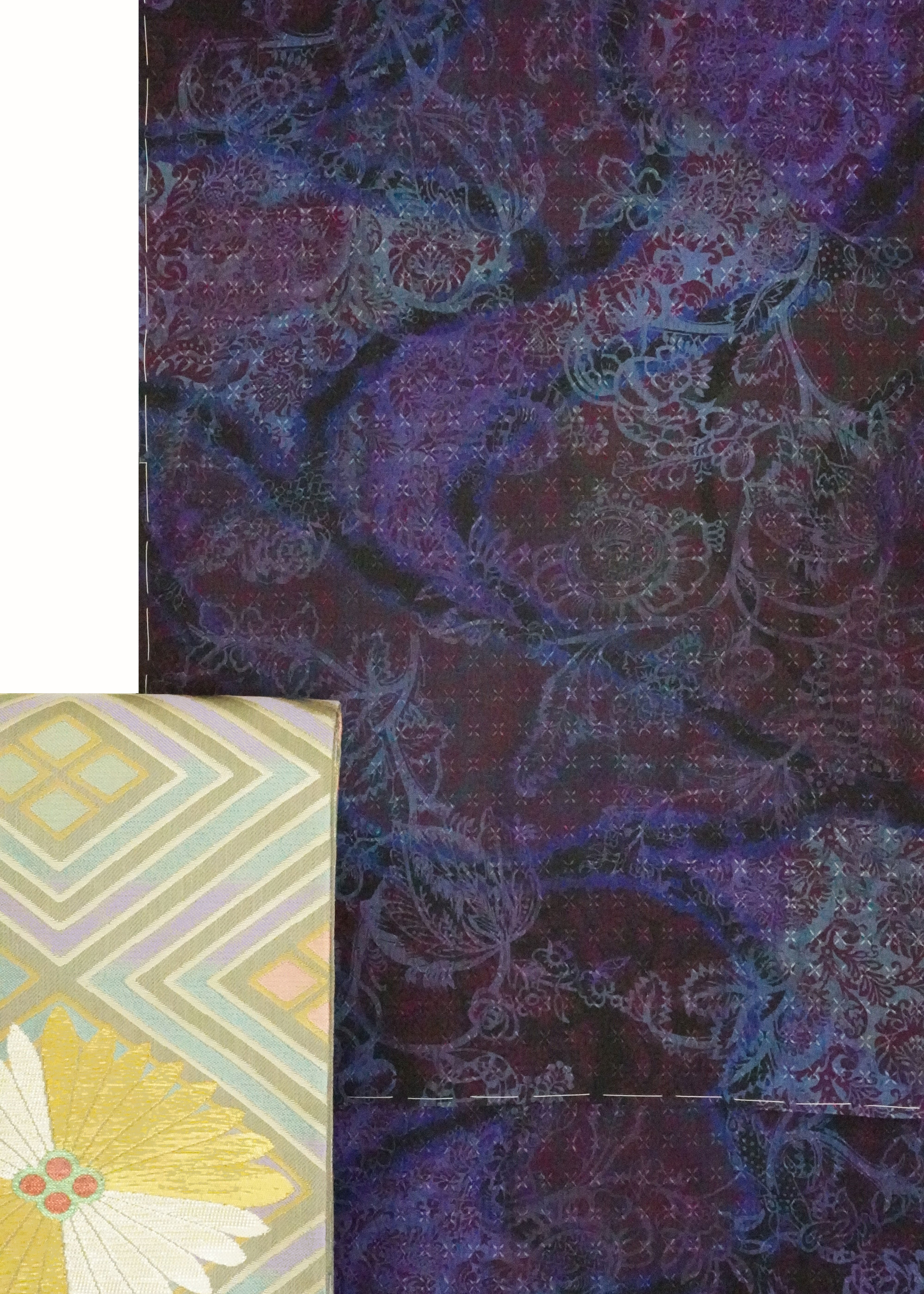 タッサーシルクはインド原産の野蚕糸で沙羅双樹やアルジュンという樹の葉で育った野蚕から採取した絹糸です。 また一般的な家蚕糸より光沢があり繊維が太く独特なシャリ感があるのが特徴。 天然の繭から作られる織物としては最高級の品質といわれる貴重なお品物です。作家の前田仁仙(まえだ じんせん)」とは京都の京友禅のブランドでありまたその創始者の名前でもあります。伝統にとらわれず洋風のデザインやインド・ジャワの更紗など多様な文化から影響を受けたモダンでお洒落な着物や帯を制作しています。今回ご紹介するお着物はそのジャワ更紗を強く意識したデザインと地紋模様のクロス地がマッチして素晴らしいイメージを出しています。