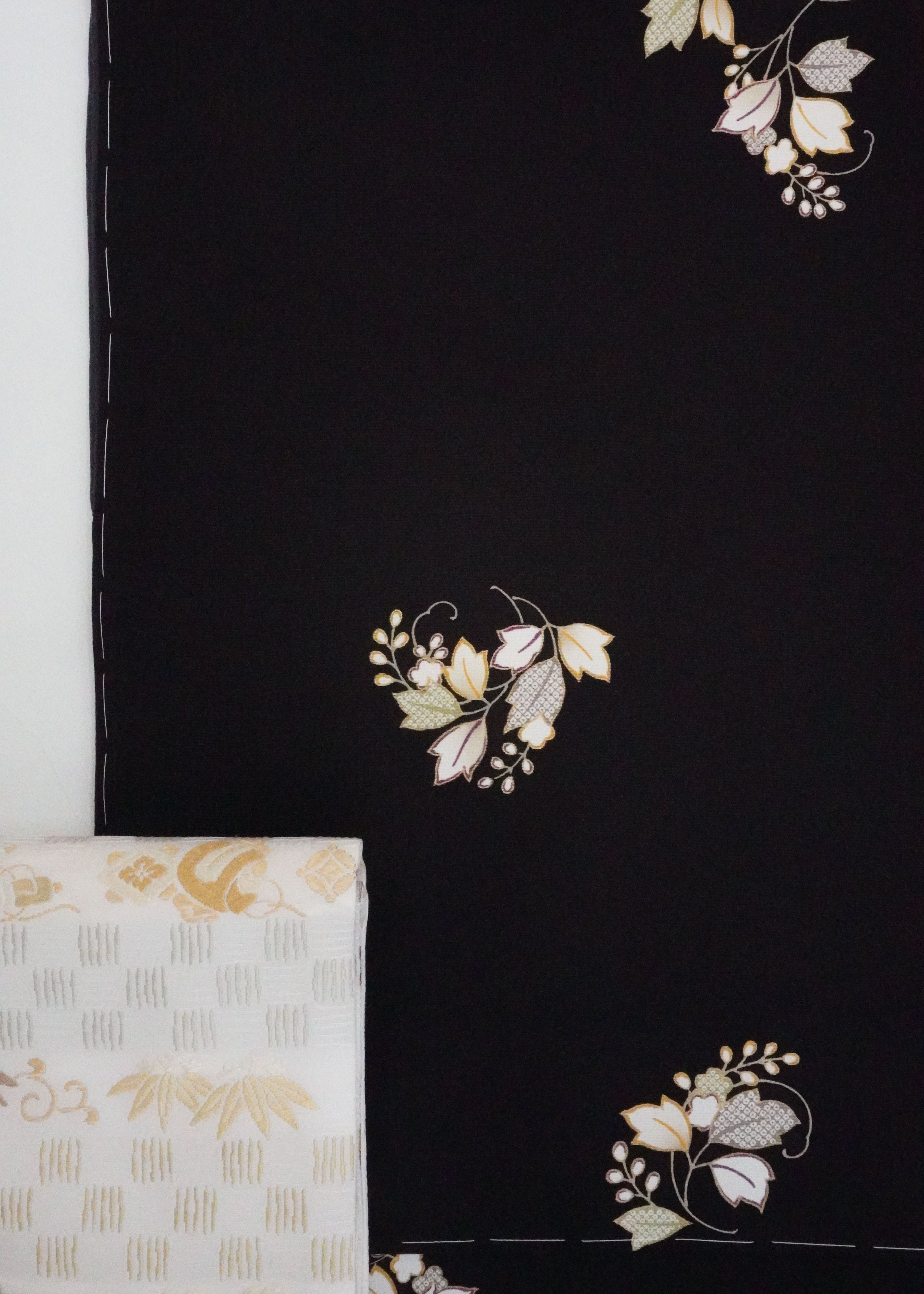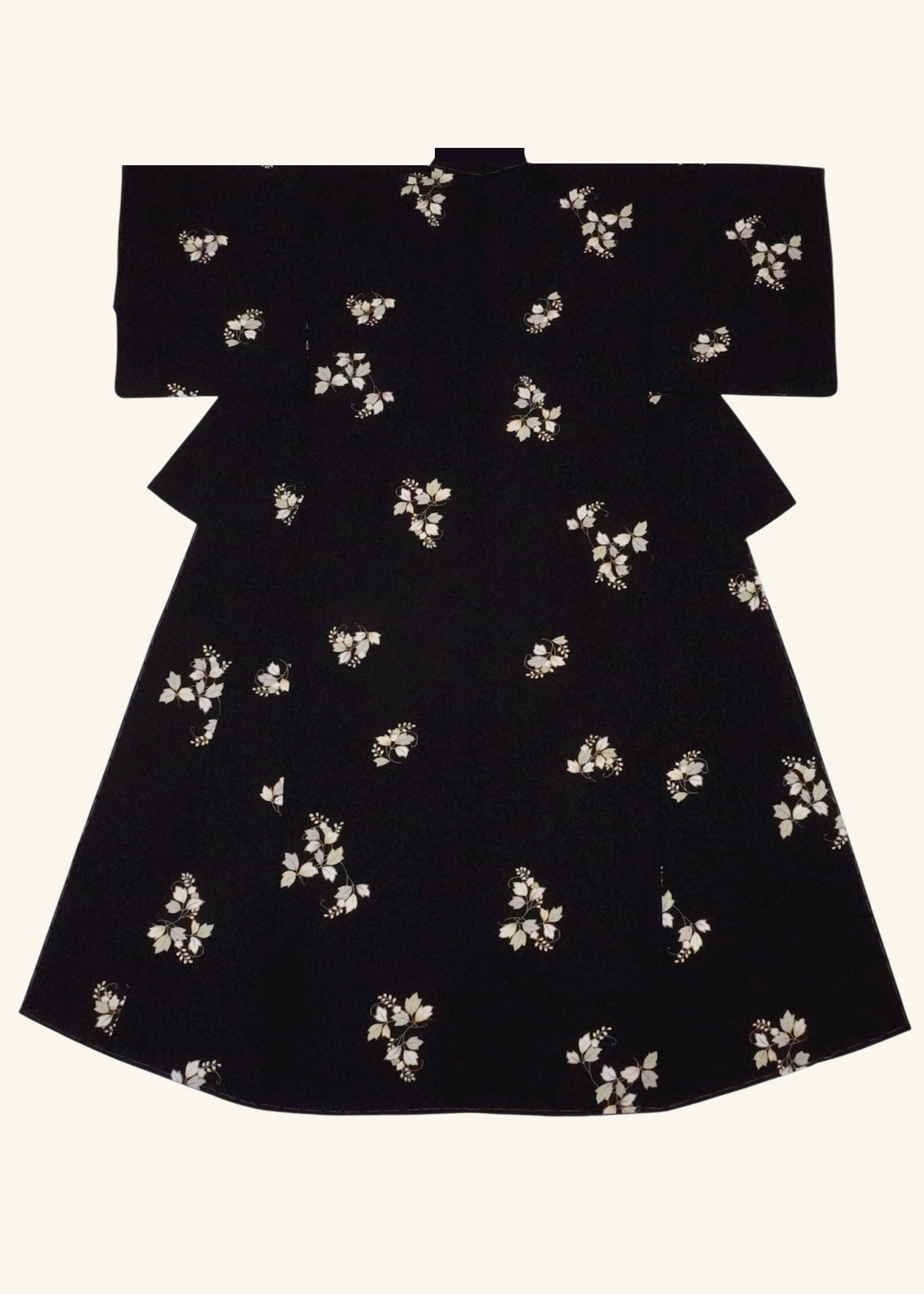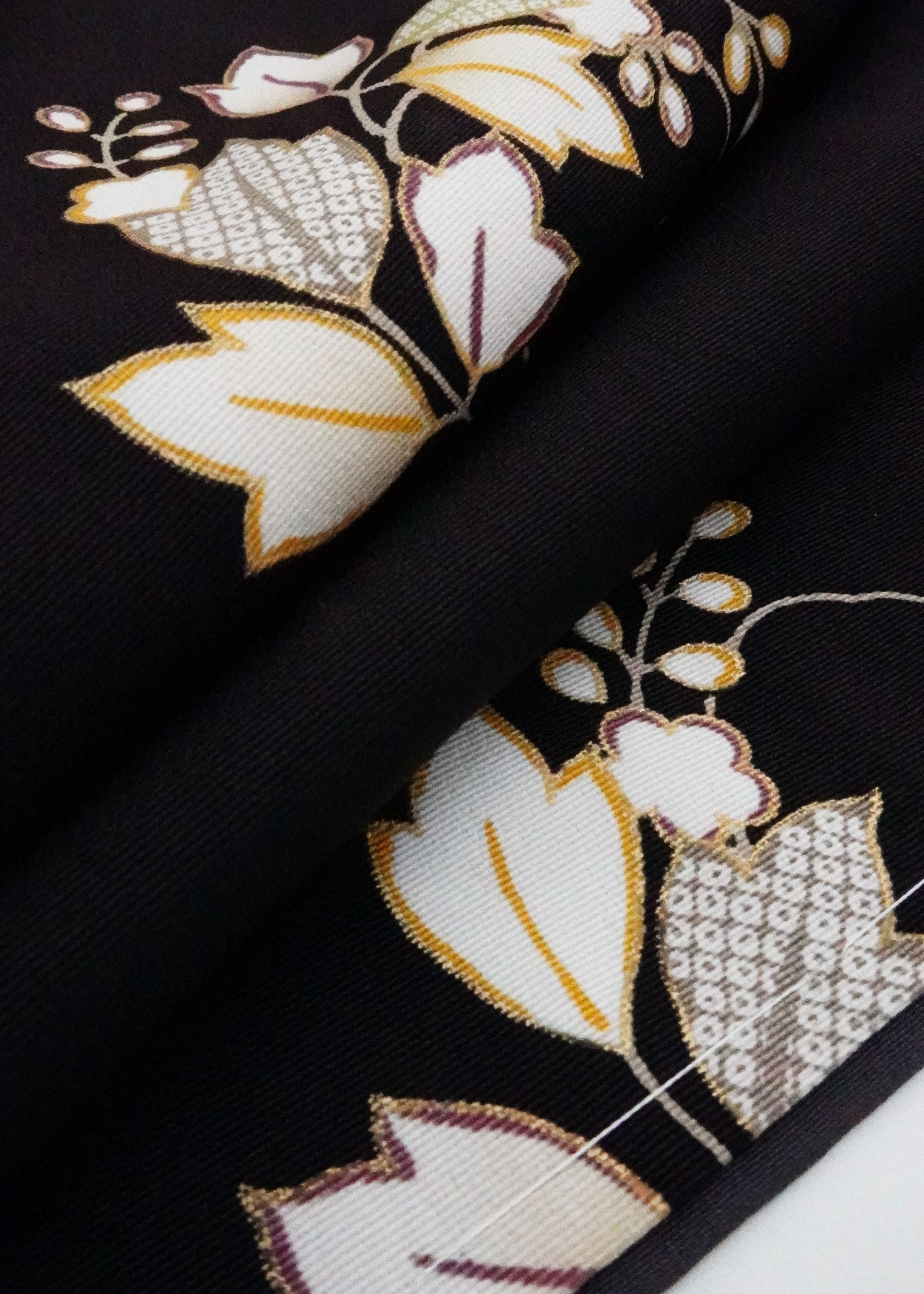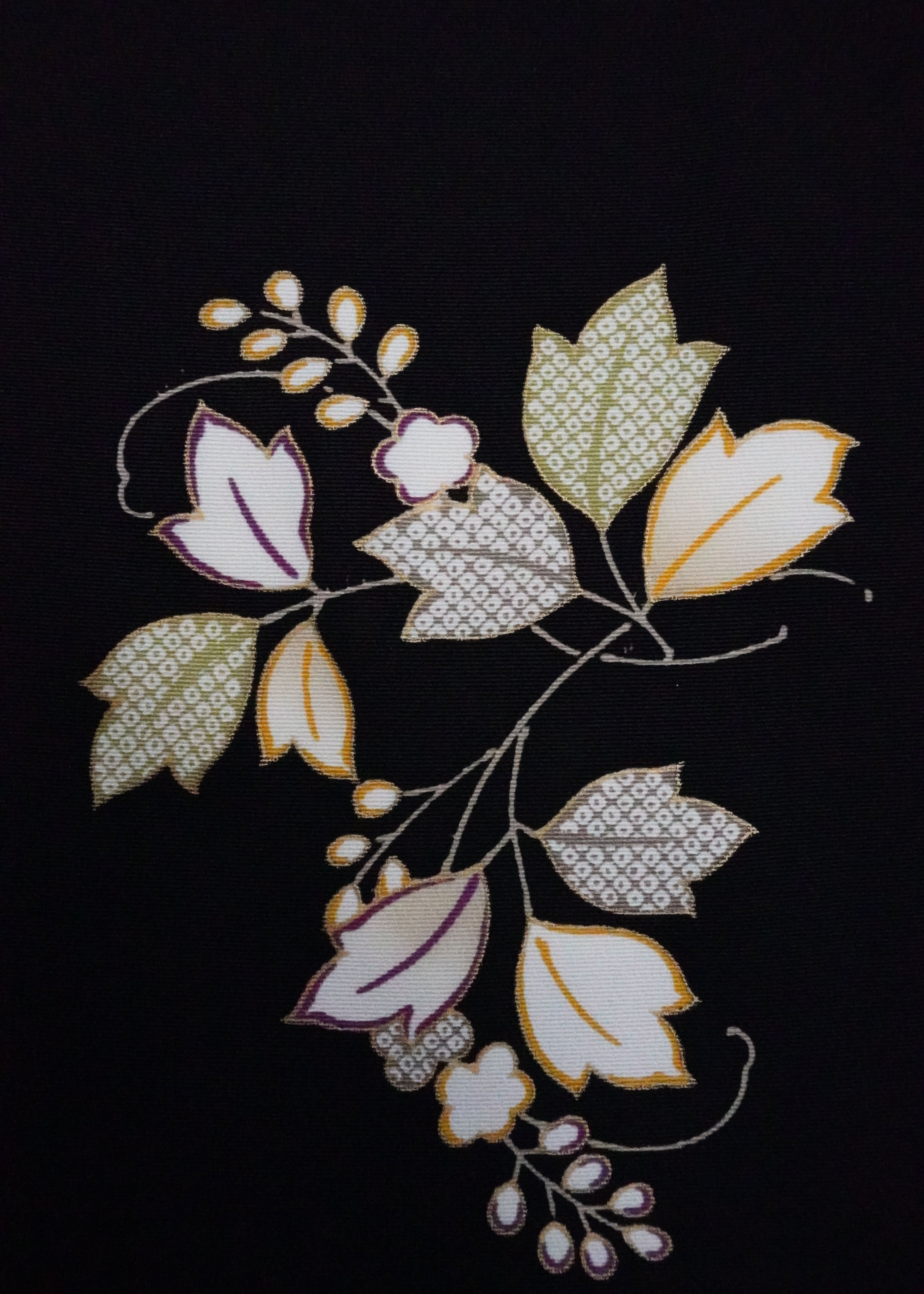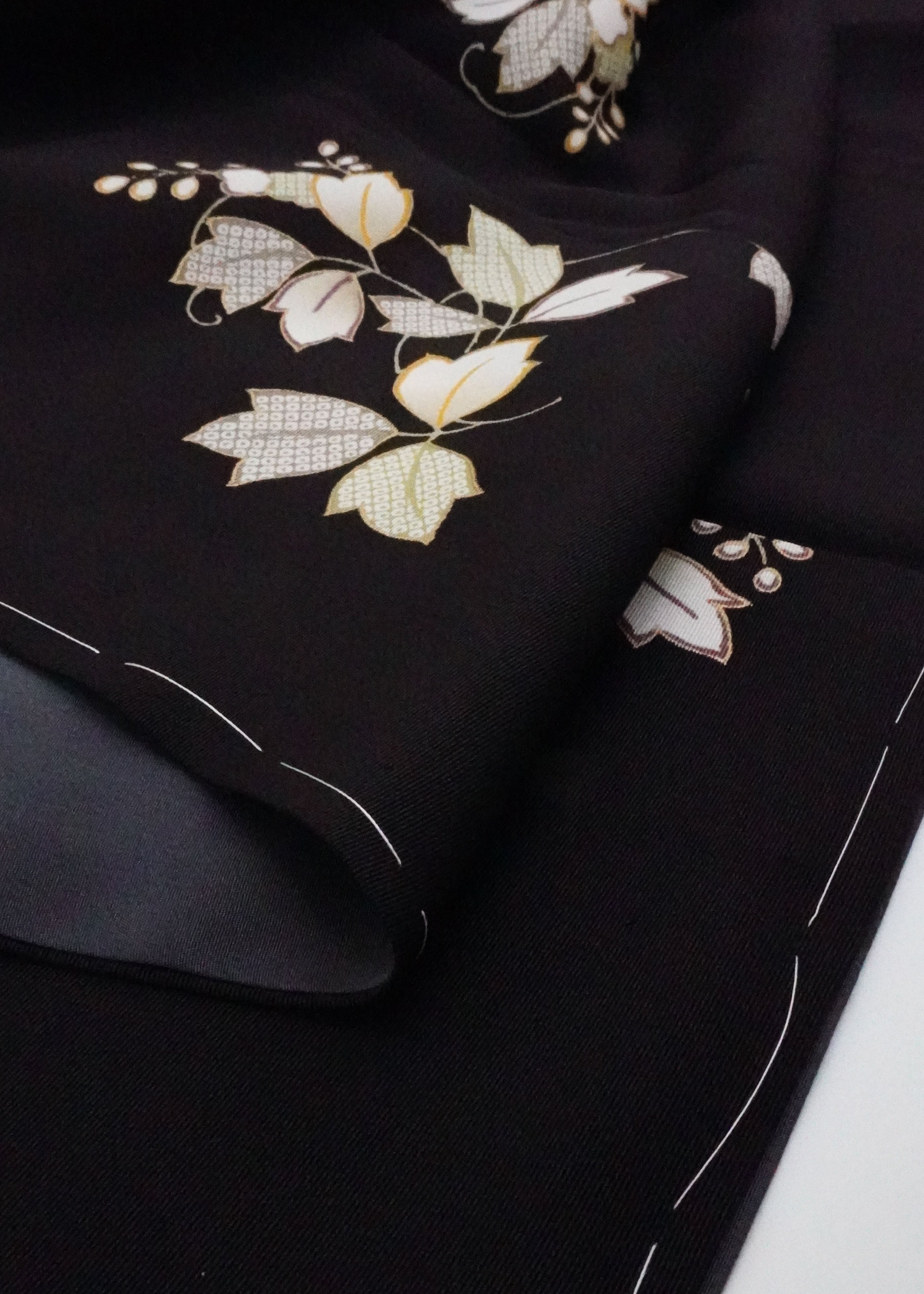 糸目友禅とゆう手描友禅の代表的な技法を駆使し模様の輪郭に糸のように細く糊を置いて色の滲みを防ぎ完成した着物に描かれた模様の縁に糸を引いたような白い線が残ることを表現しています。今回ご紹介するお着物は黒地に季節が特定出来ない小花を描いた小紋着物です。