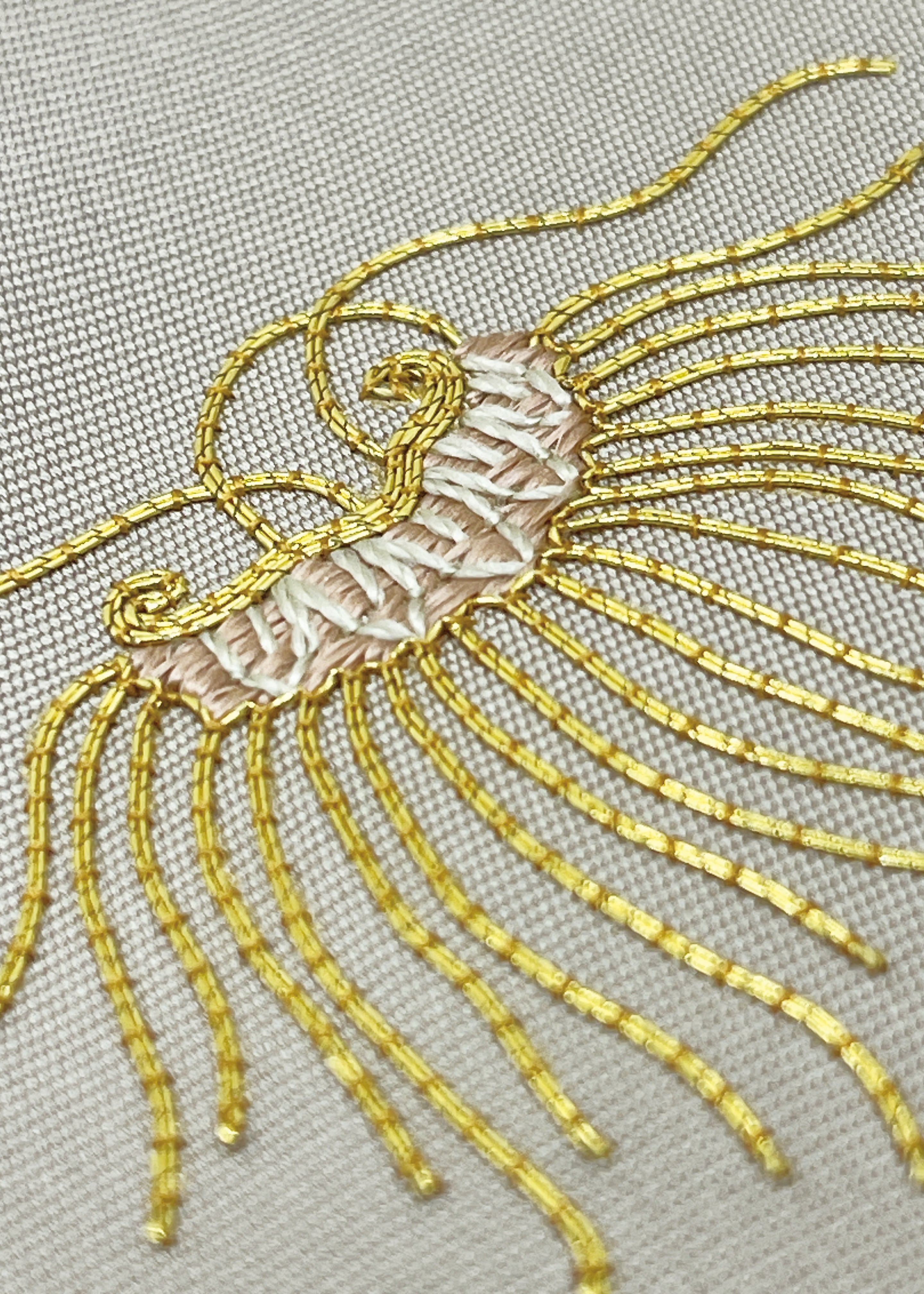 繍司長艸は京繍として長い歳月手刺繍の美しさを伝えてきました。その一つ一つの確かな技術とセンスにため息がでます。今回ご紹介する帯は上品な宝尽くしが上質な塩瀬生地の上に刺繍されています。今回はハイセンスな大島紬に合わせてみましたが色無地や江戸小紋などフォーマル色を出していただいても素敵だと思います。まさに上級なお茶の席にぴったりな名古屋です。状態には問題なく未着用です。
