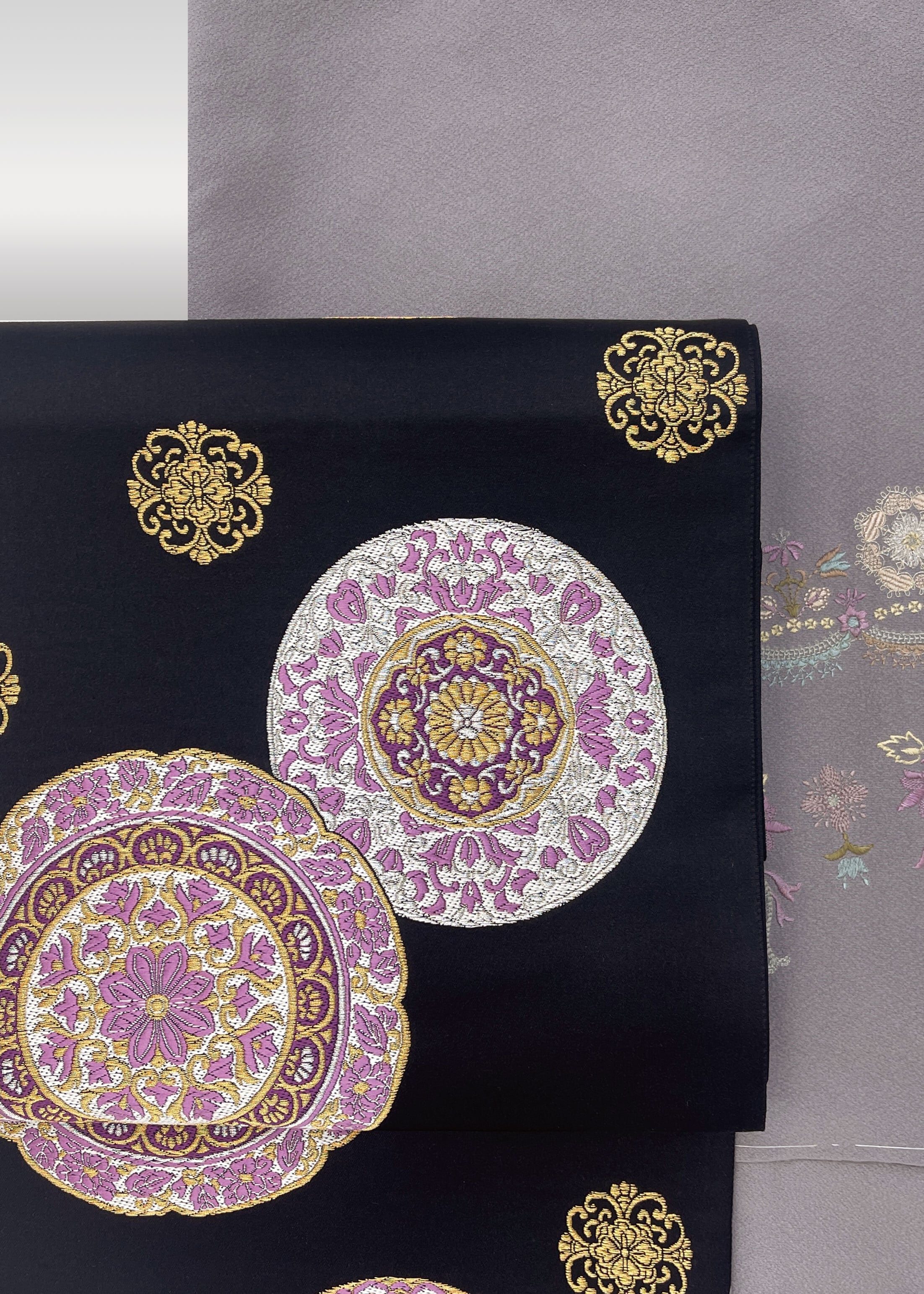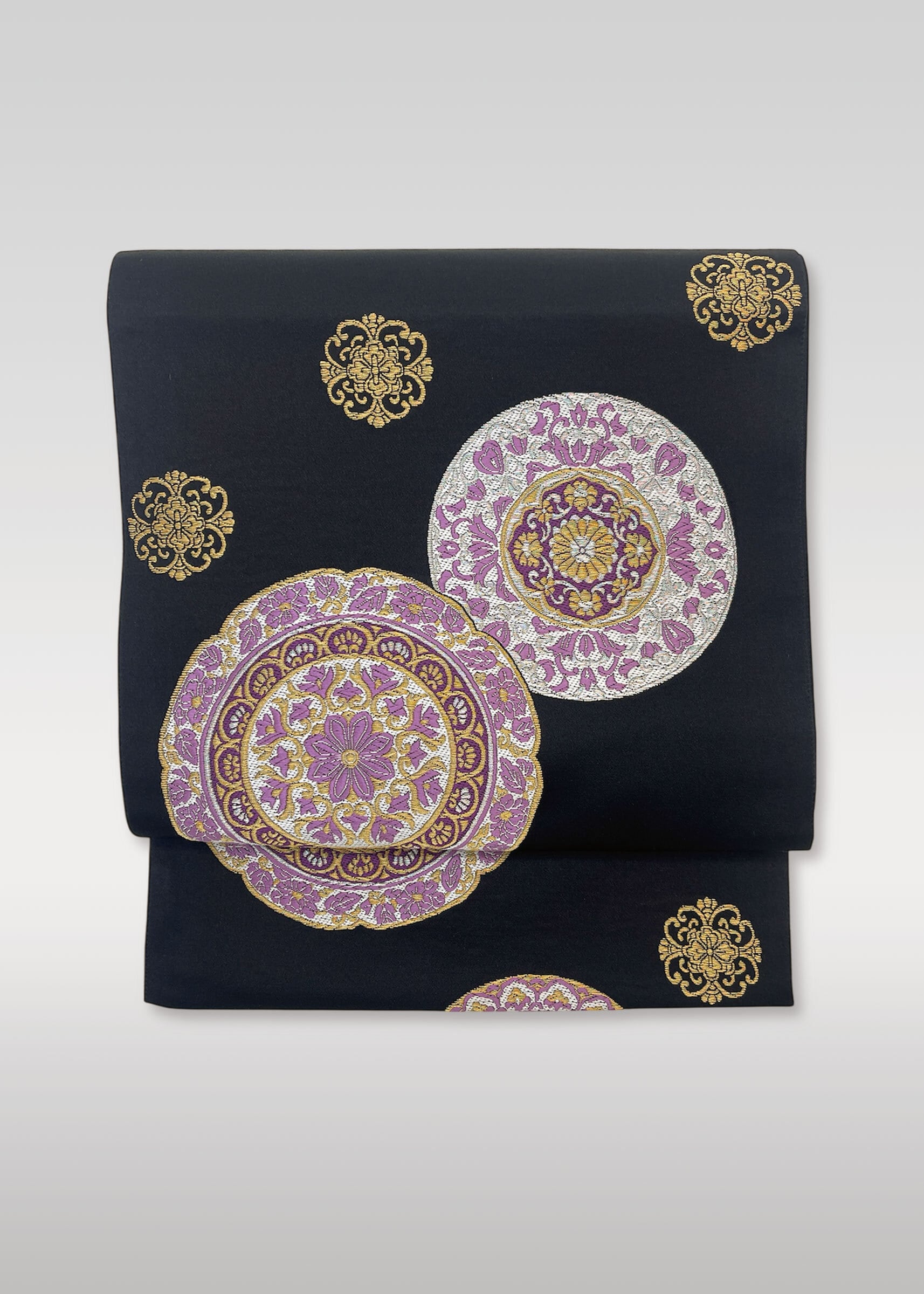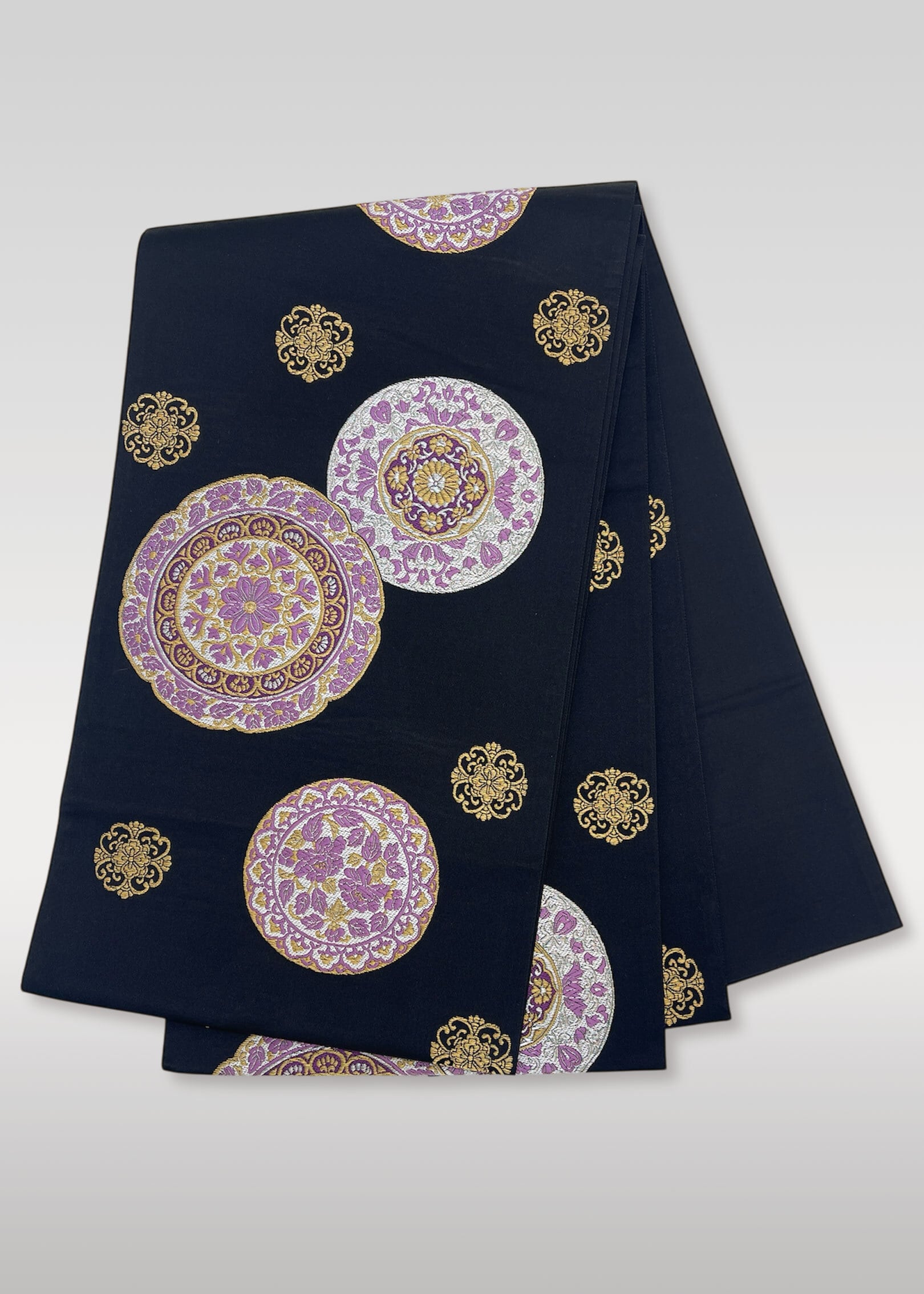 漆黒に充分に紫が使われた古代の鏡を彷彿させる模様が浮かび上がる凛としたフォーマル帯です。黒という強い色ゆえに上品に着物とのバランスで季節感を出すことが可能になると思います。様々な格のお茶会にもお召いただける帯です。