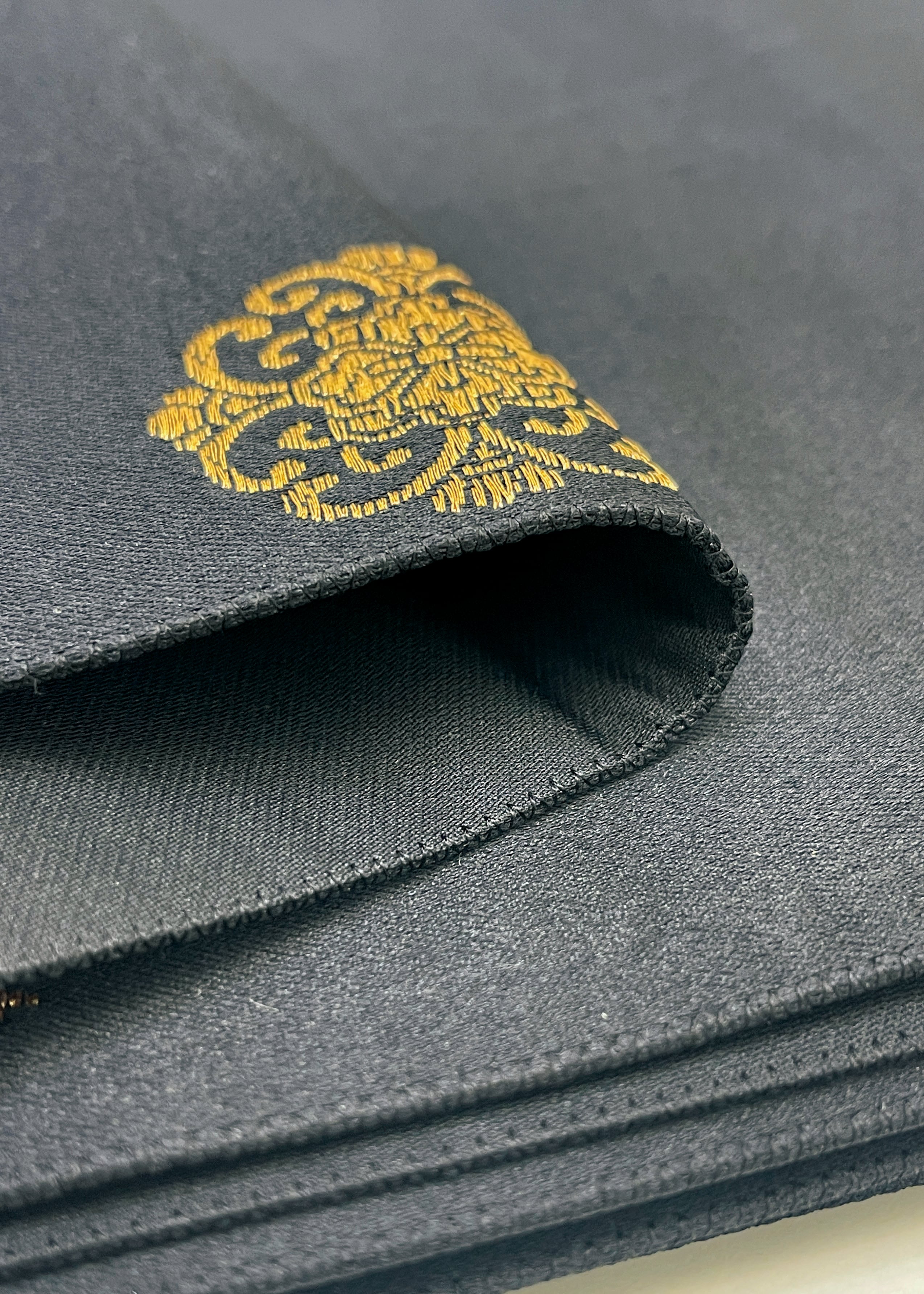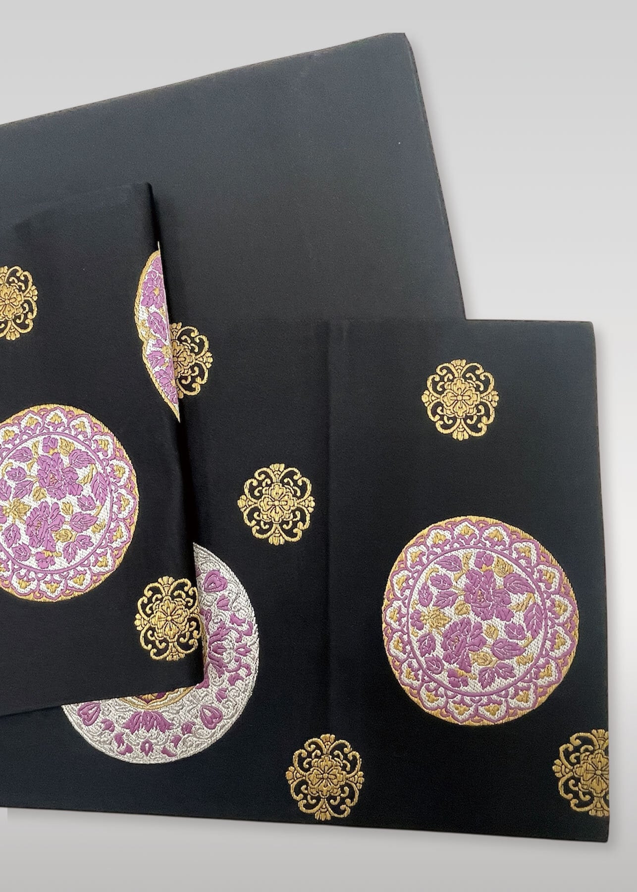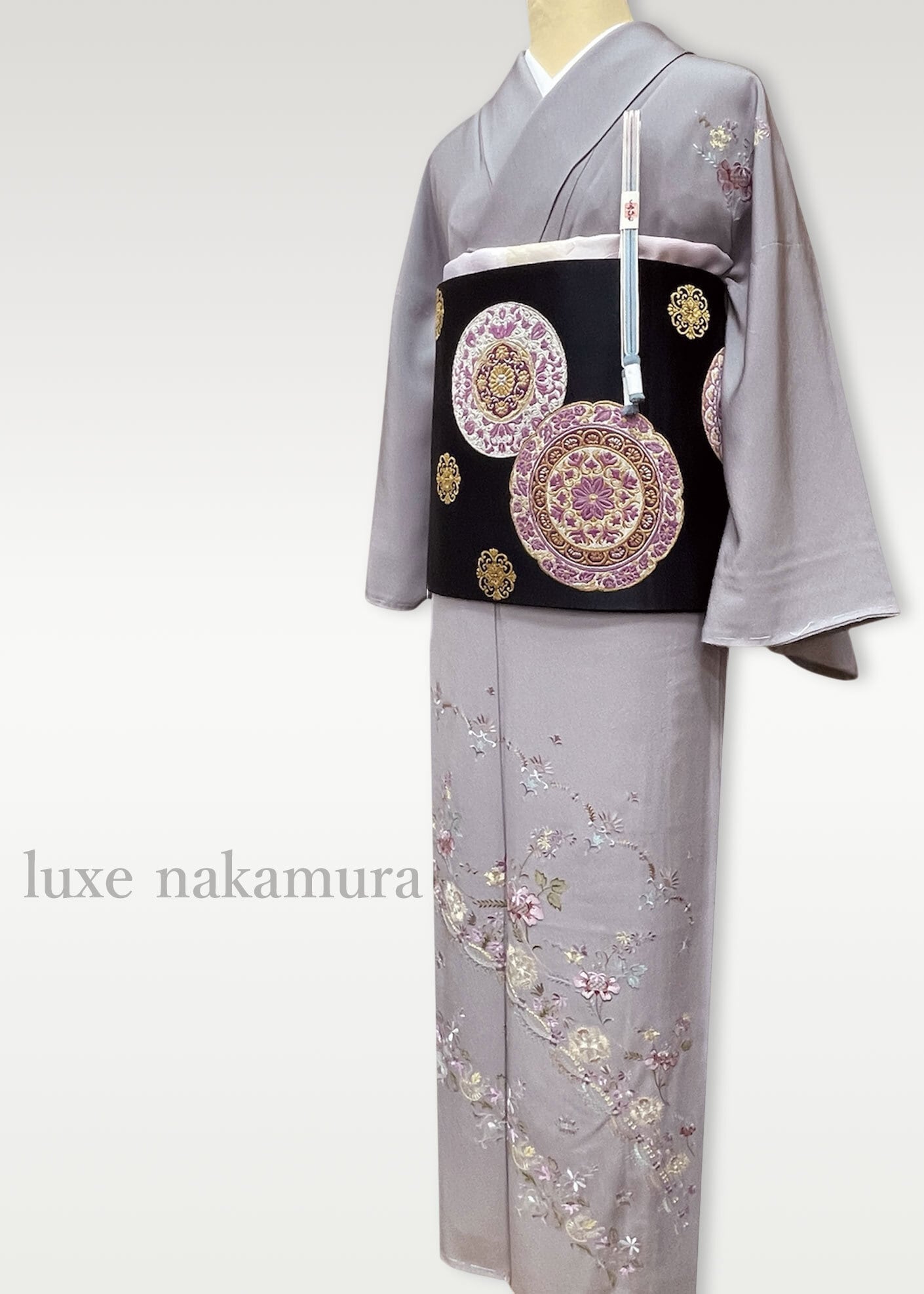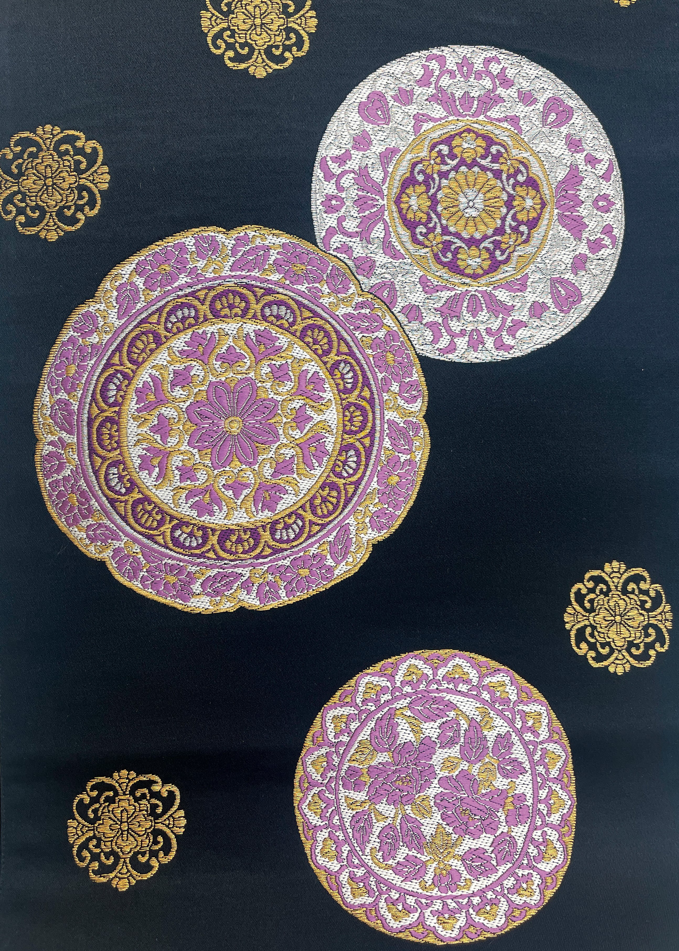 漆黒に充分に紫が使われた古代の鏡を彷彿させる模様が浮かび上がる凛としたフォーマル帯です。黒という強い色ゆえに上品に着物とのバランスで季節感を出すことが可能になると思います。様々な格のお茶会にもお召いただける帯です。