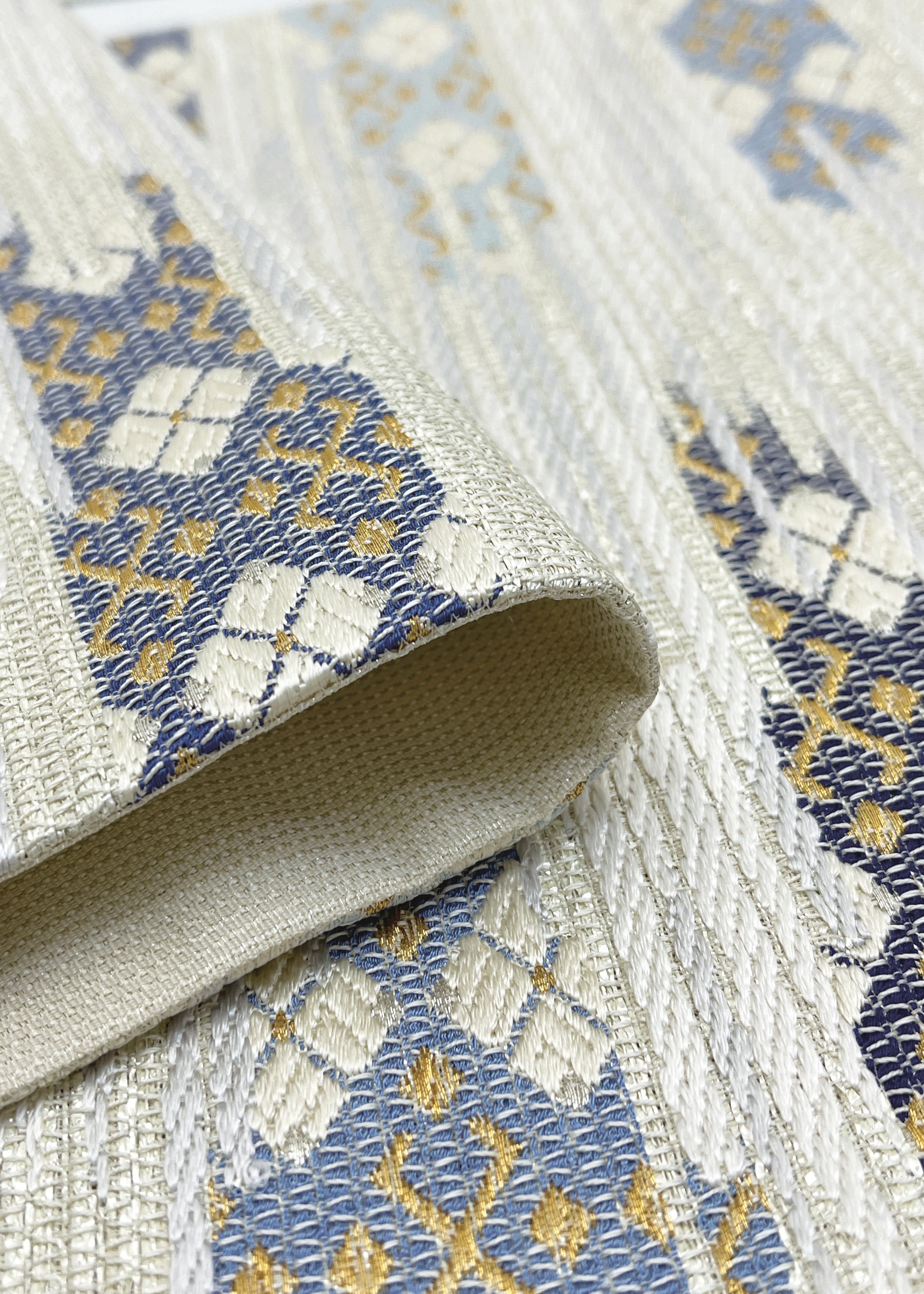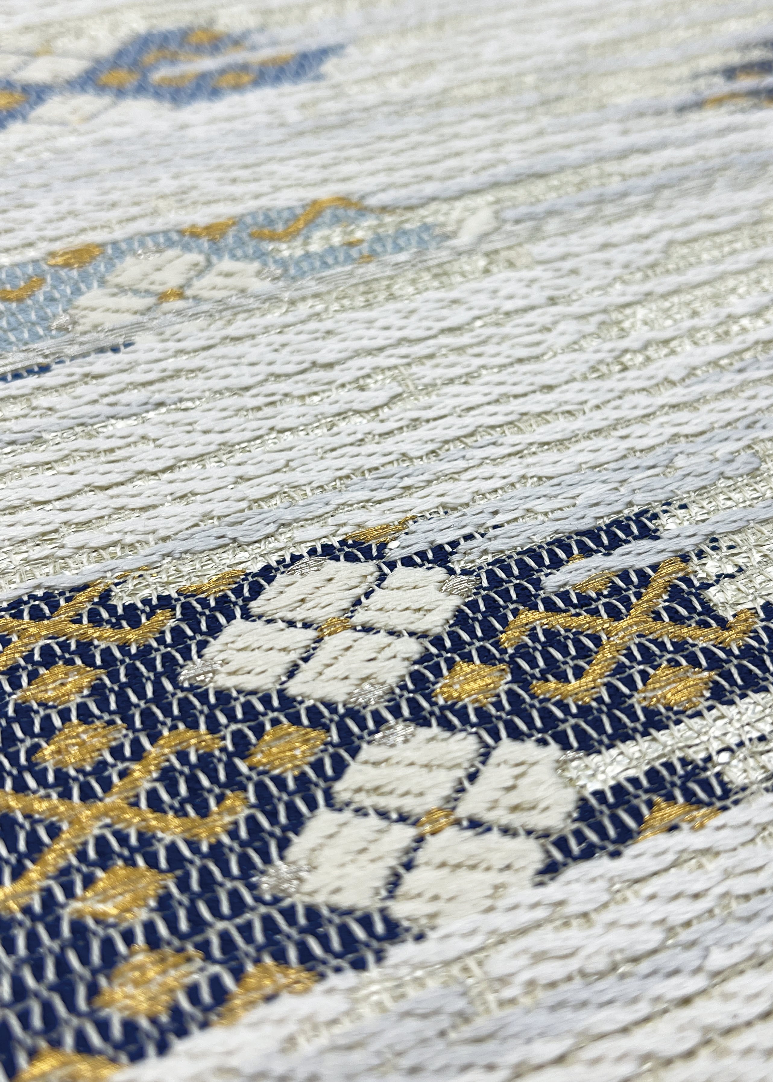 霞に織り上げられた部分に四つ菱が配置されたフォーマルな袋帯です。上品で合わせるお着物によってはフォーマルからセミフォーマルまで様々な表情を見せる優れ帯です。どんな格式あるお茶会にも締めていただけると思います。
