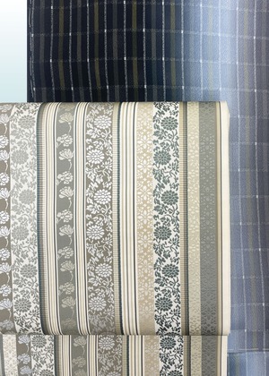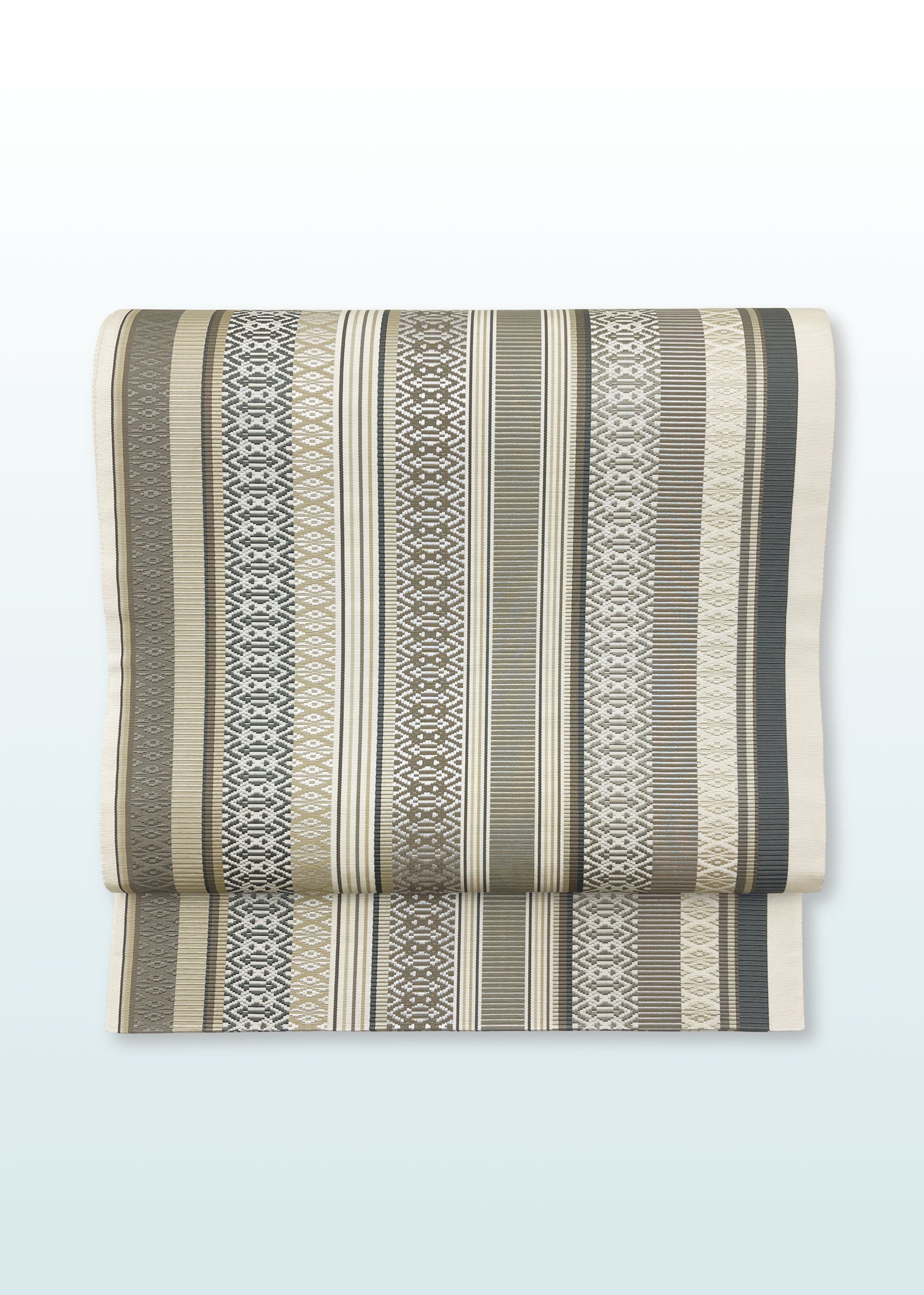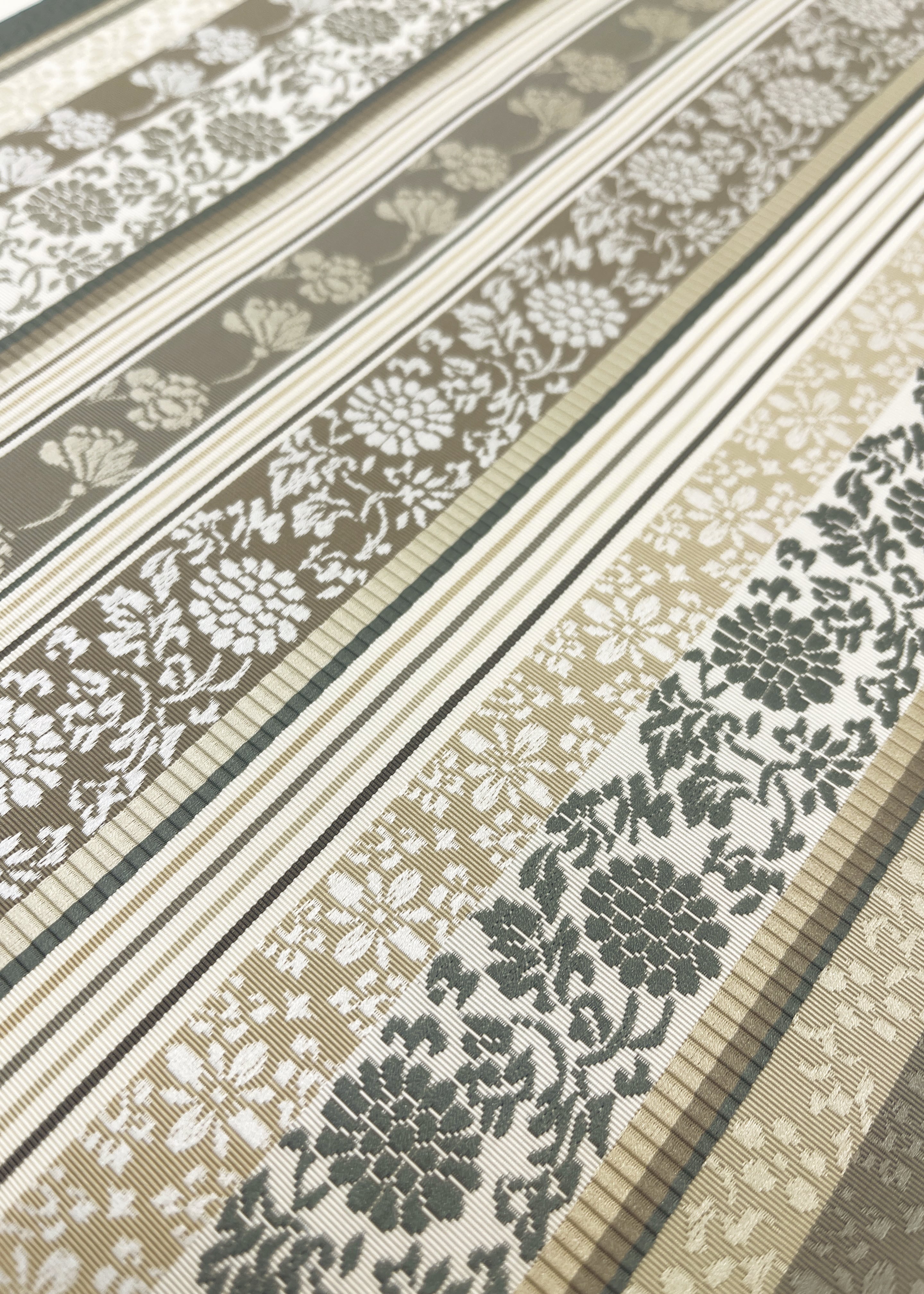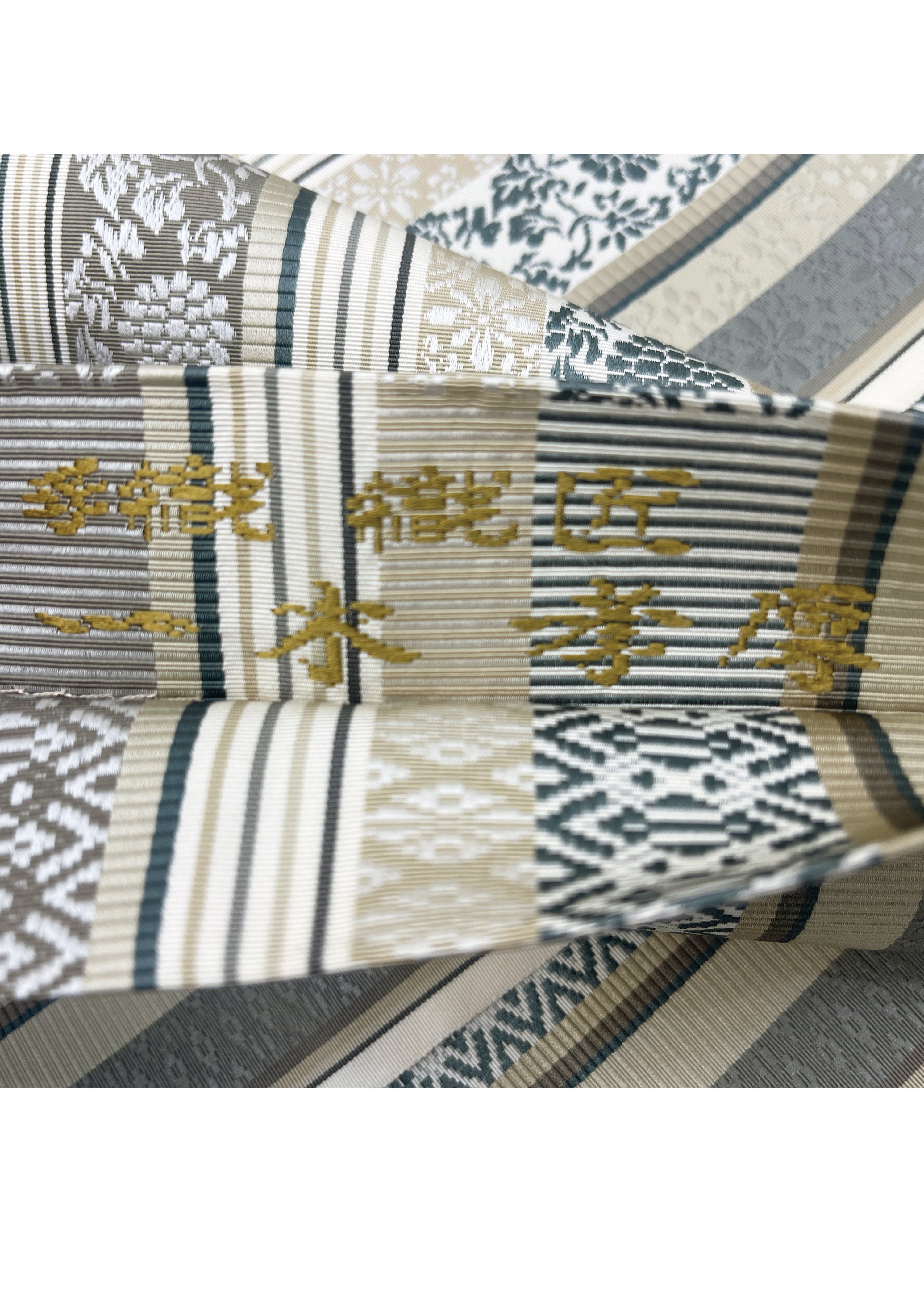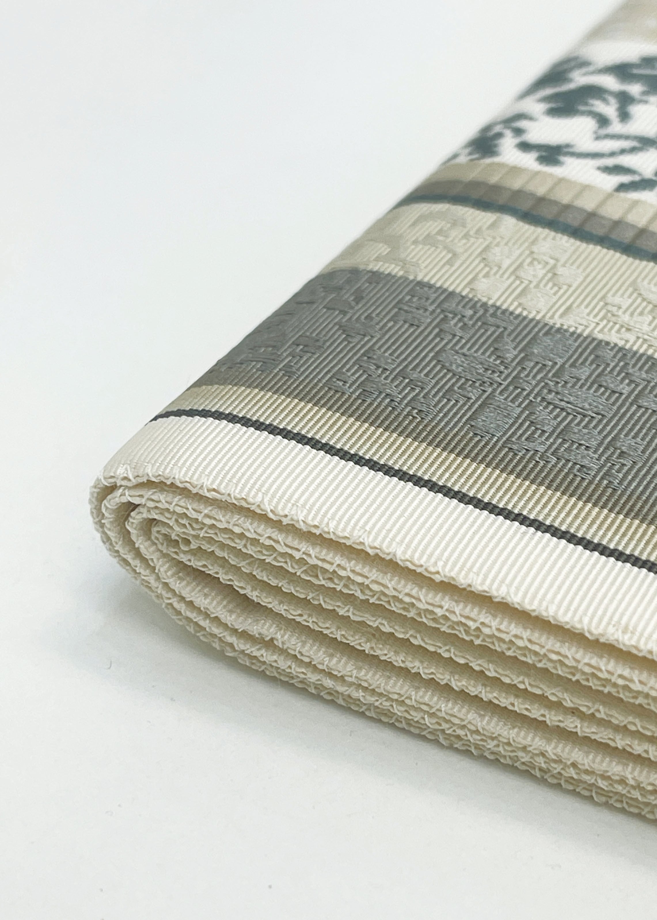 博多織の柄として代表的な献上柄と花唐草文様などの植物をモチーフにした連続文様が縦段に織り込まれた両面お使いいただける袋帯です。献上柄とは江戸時代福岡藩が将軍家に献上したことから名づけられた文様でその両面が個性を競うように配されています。同じ色目でありながら一方は静かに古典的、もう一方は華やかさがただようふたつの表情を持ちます。はかた匠工芸さんのお仕事となります。