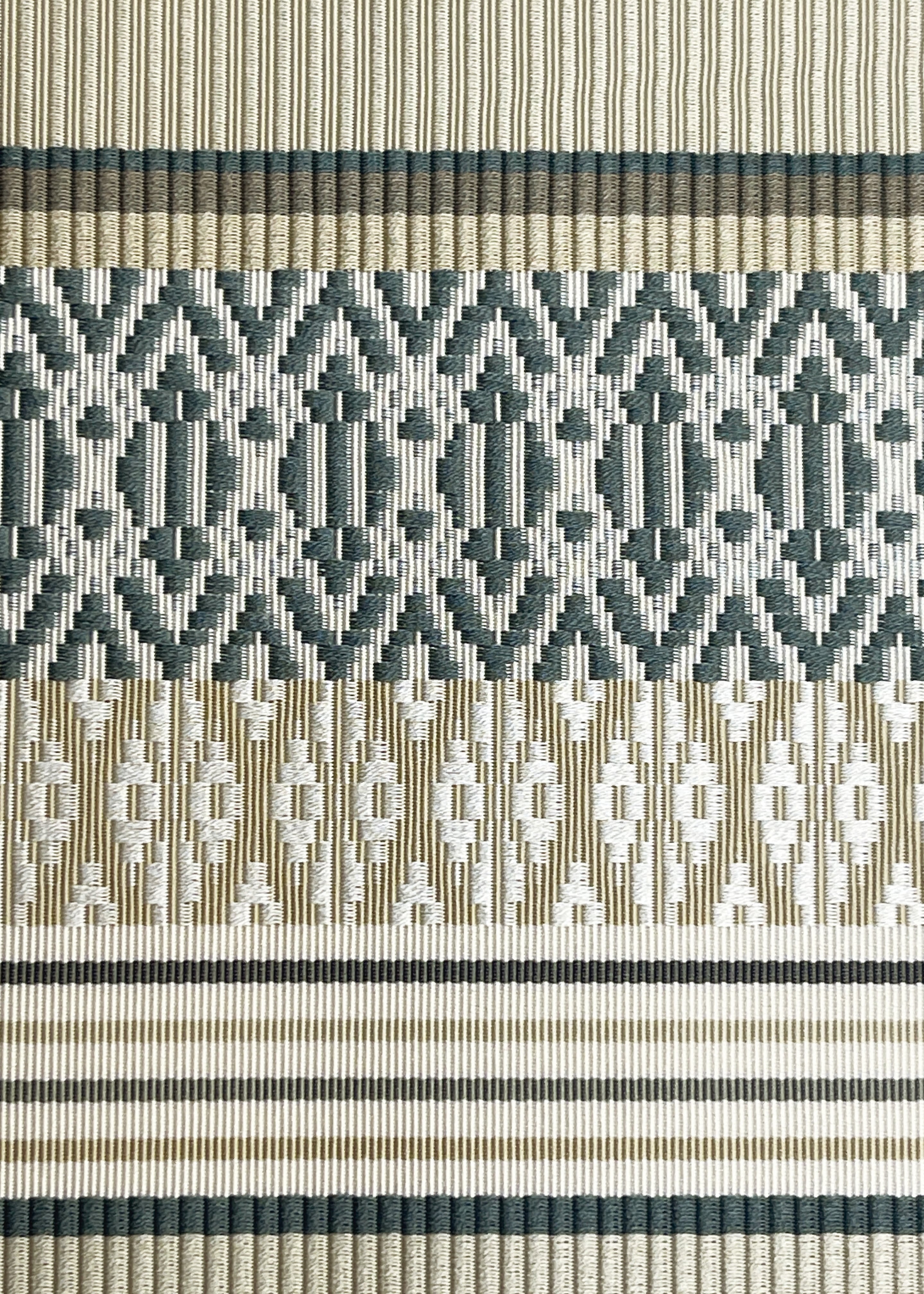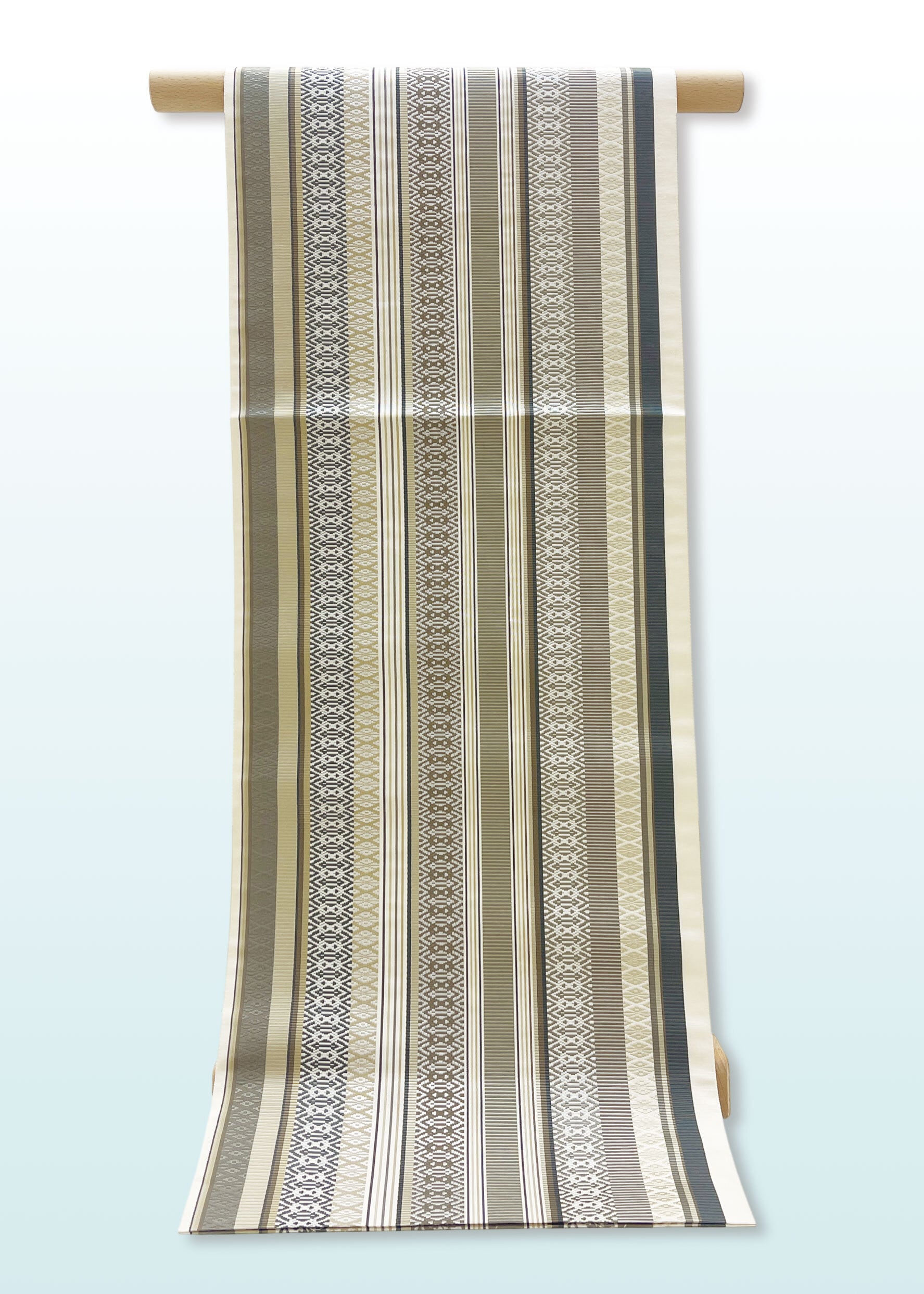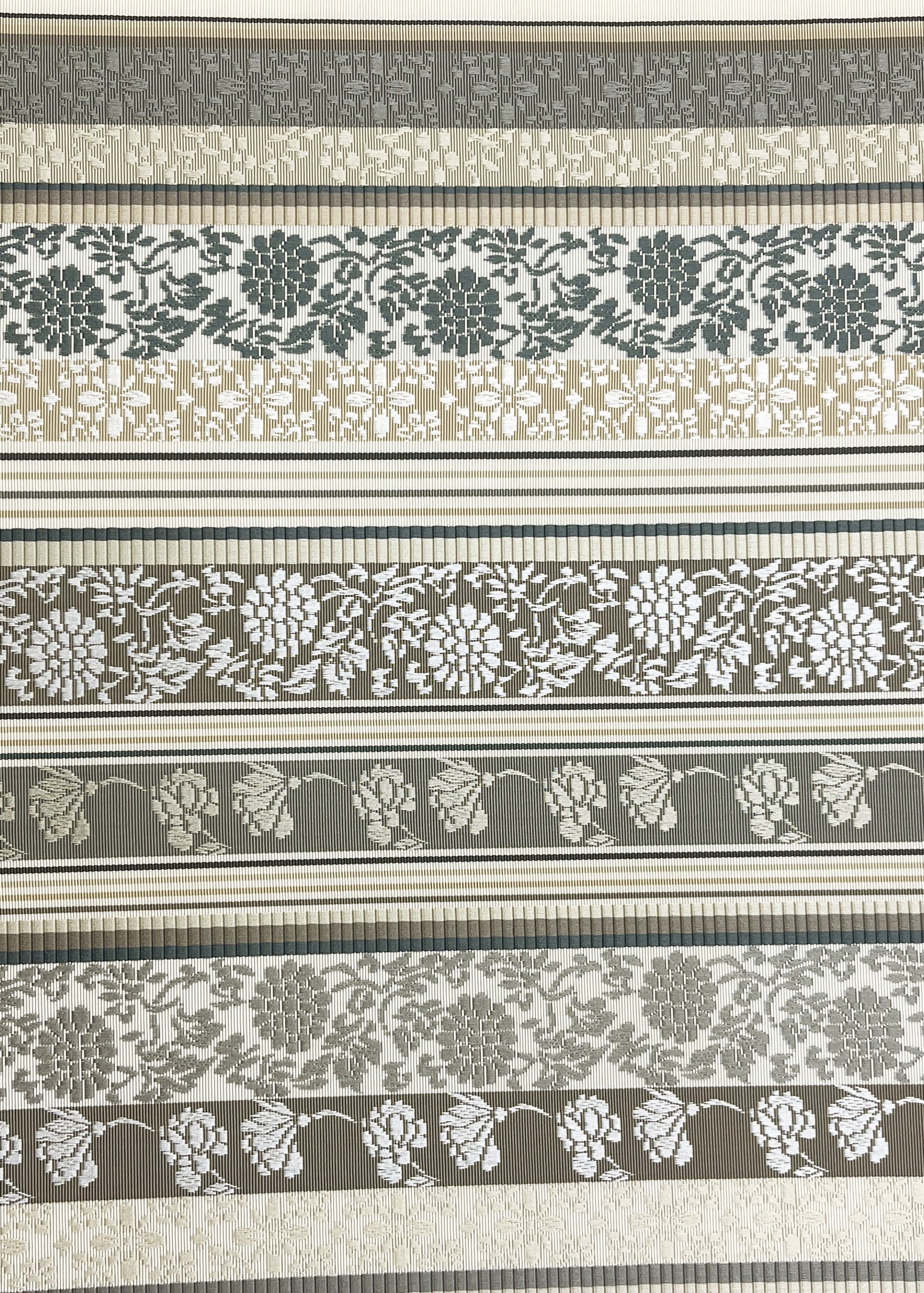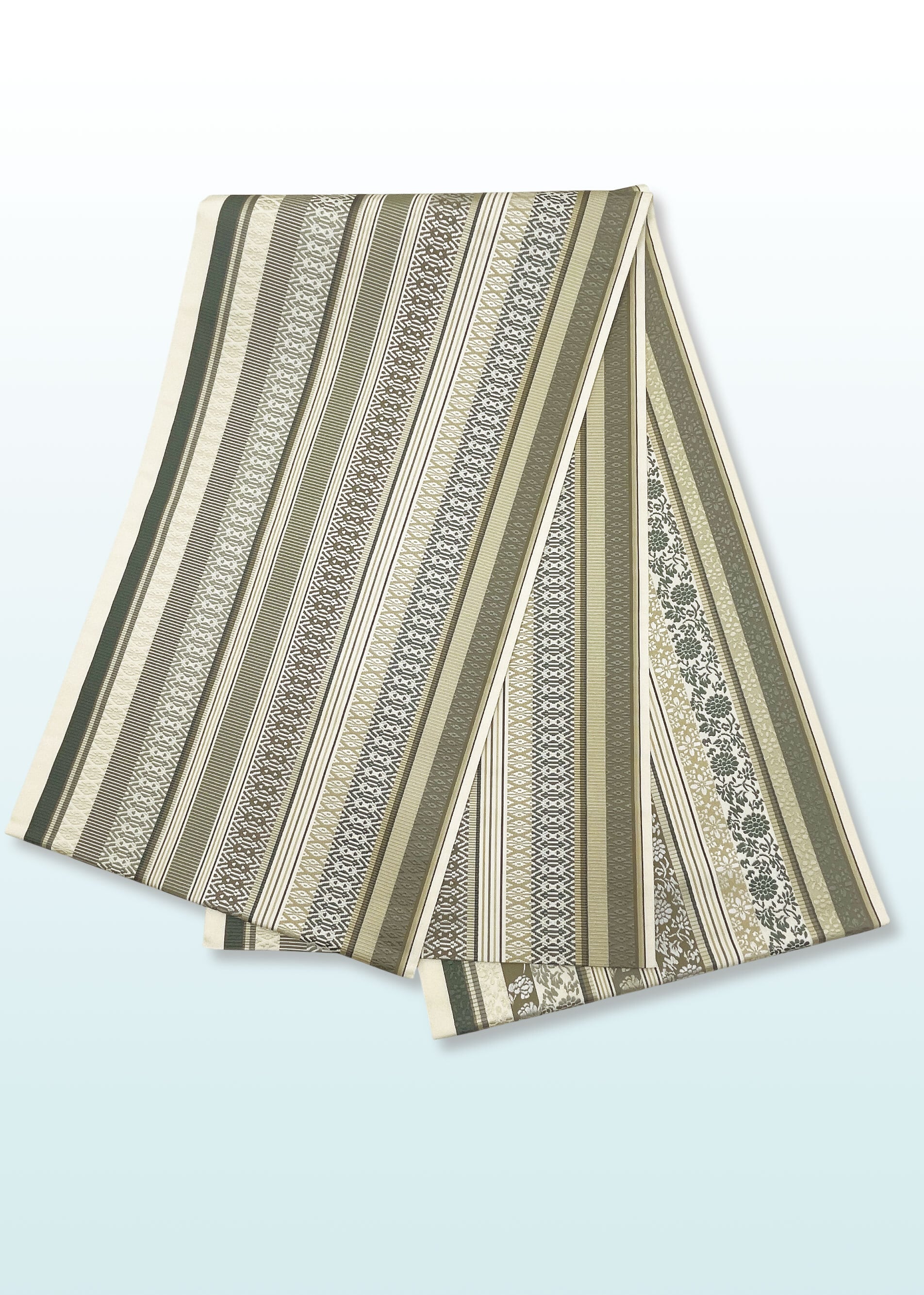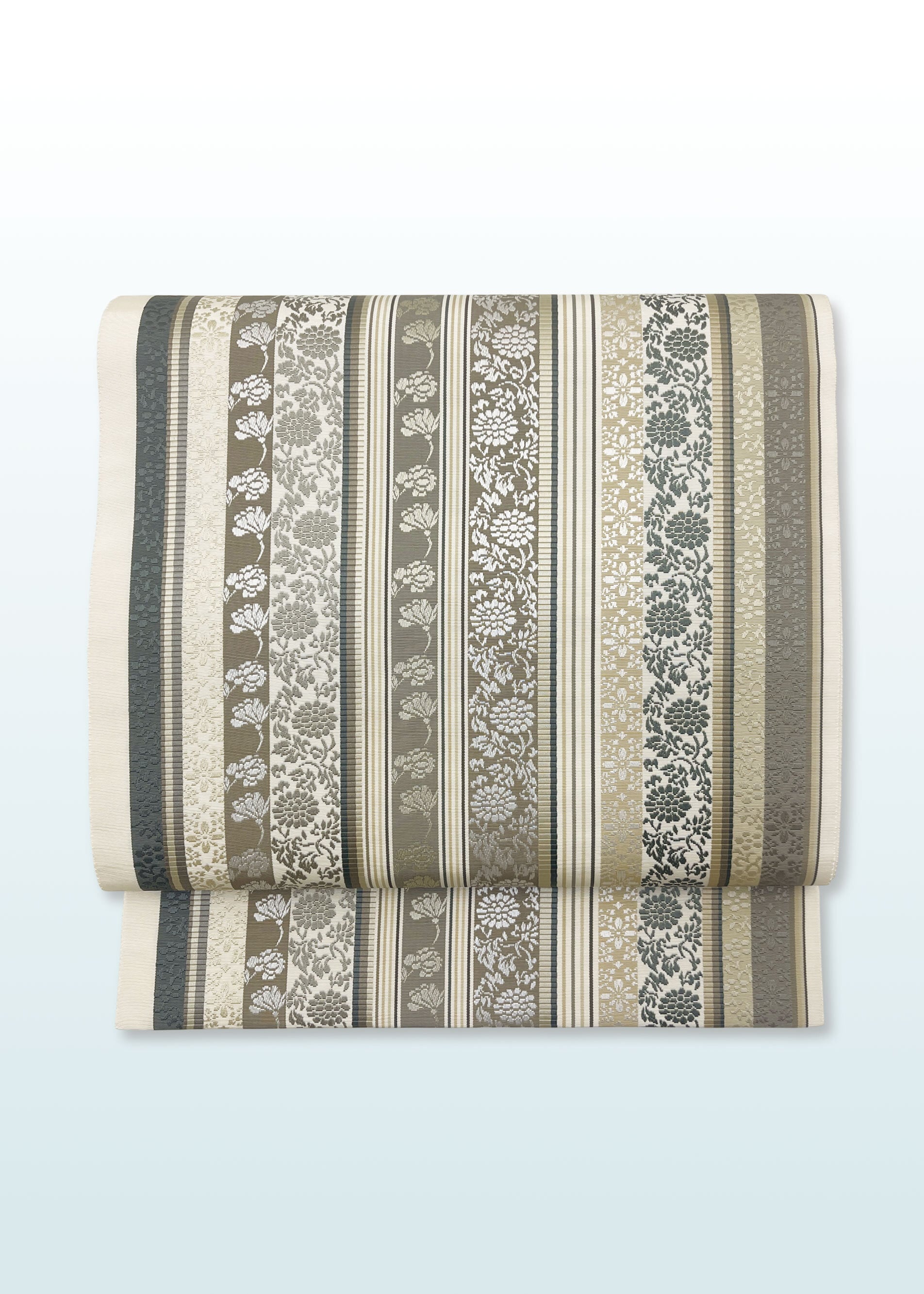 博多織の柄として代表的な献上柄と花唐草文様などの植物をモチーフにした連続文様が縦段に織り込まれた両面お使いいただける袋帯です。献上柄とは江戸時代福岡藩が将軍家に献上したことから名づけられた文様でその両面が個性を競うように配されています。同じ色目でありながら一方は静かに古典的、もう一方は華やかさがただようふたつの表情を持ちます。はかた匠工芸さんのお仕事となります。