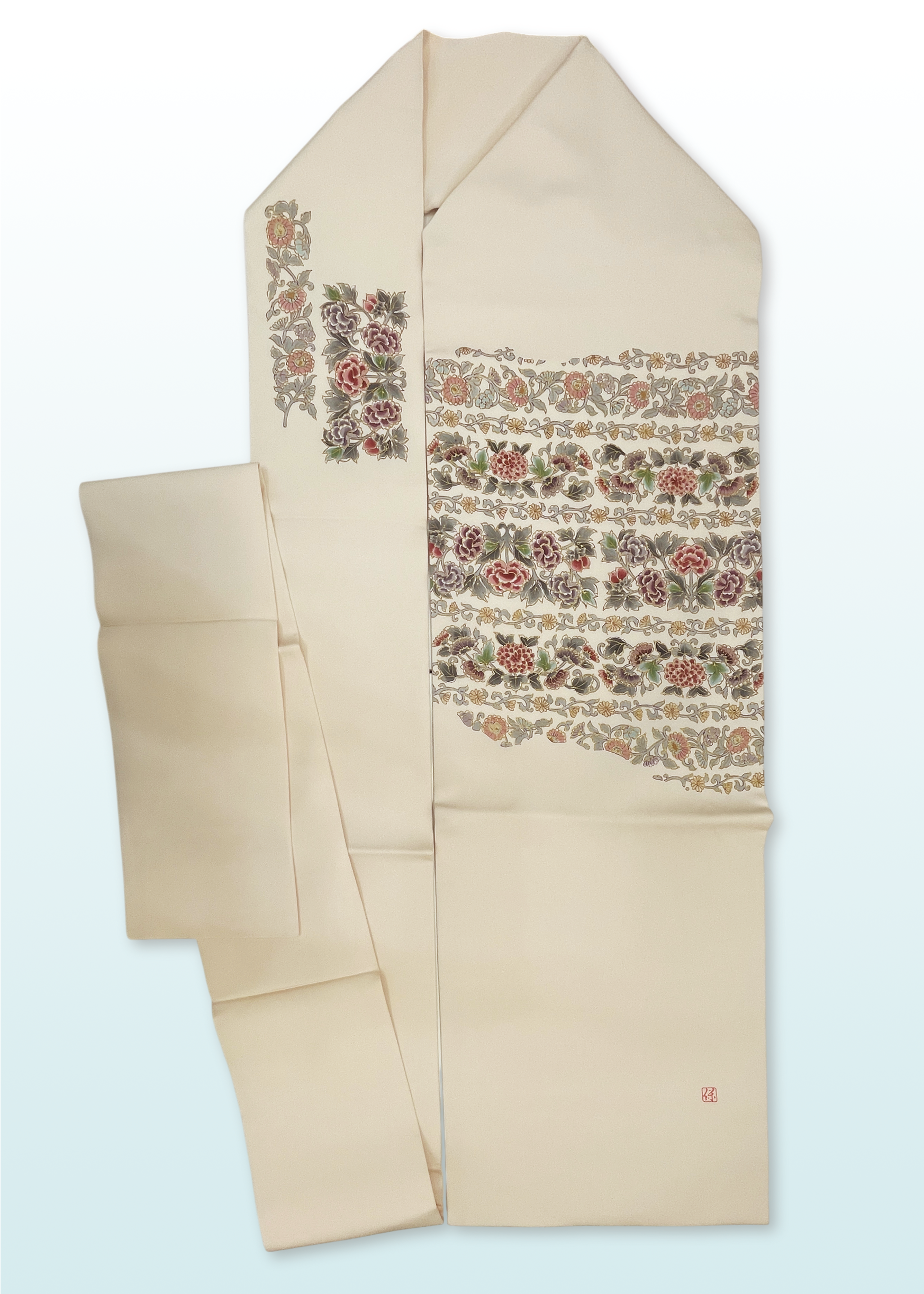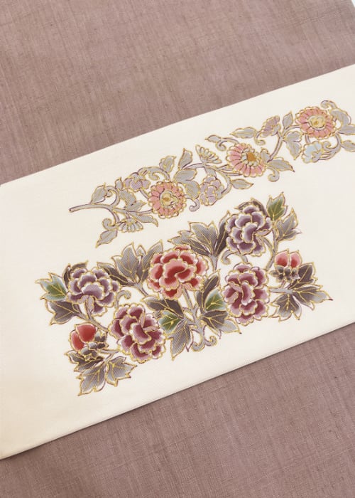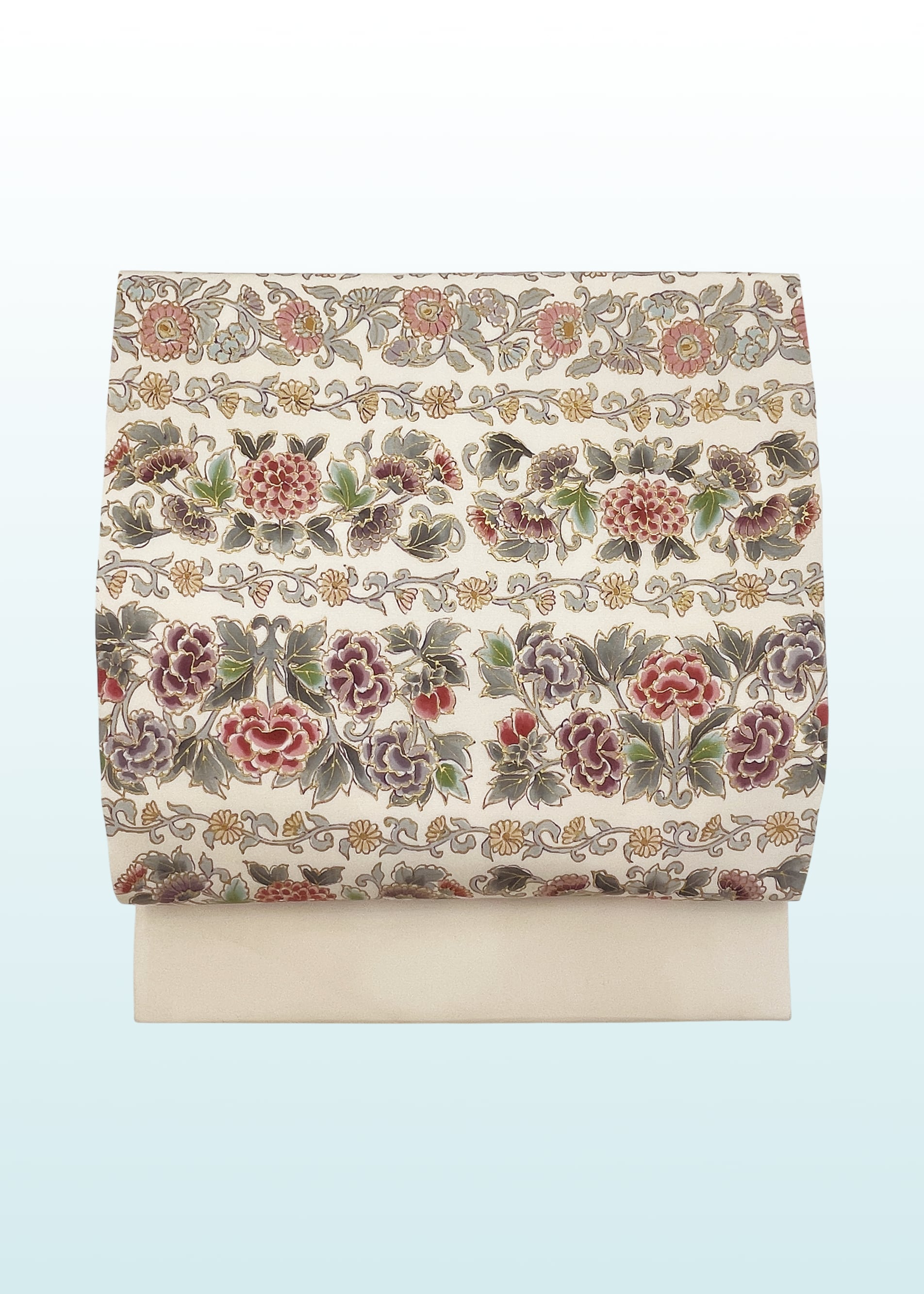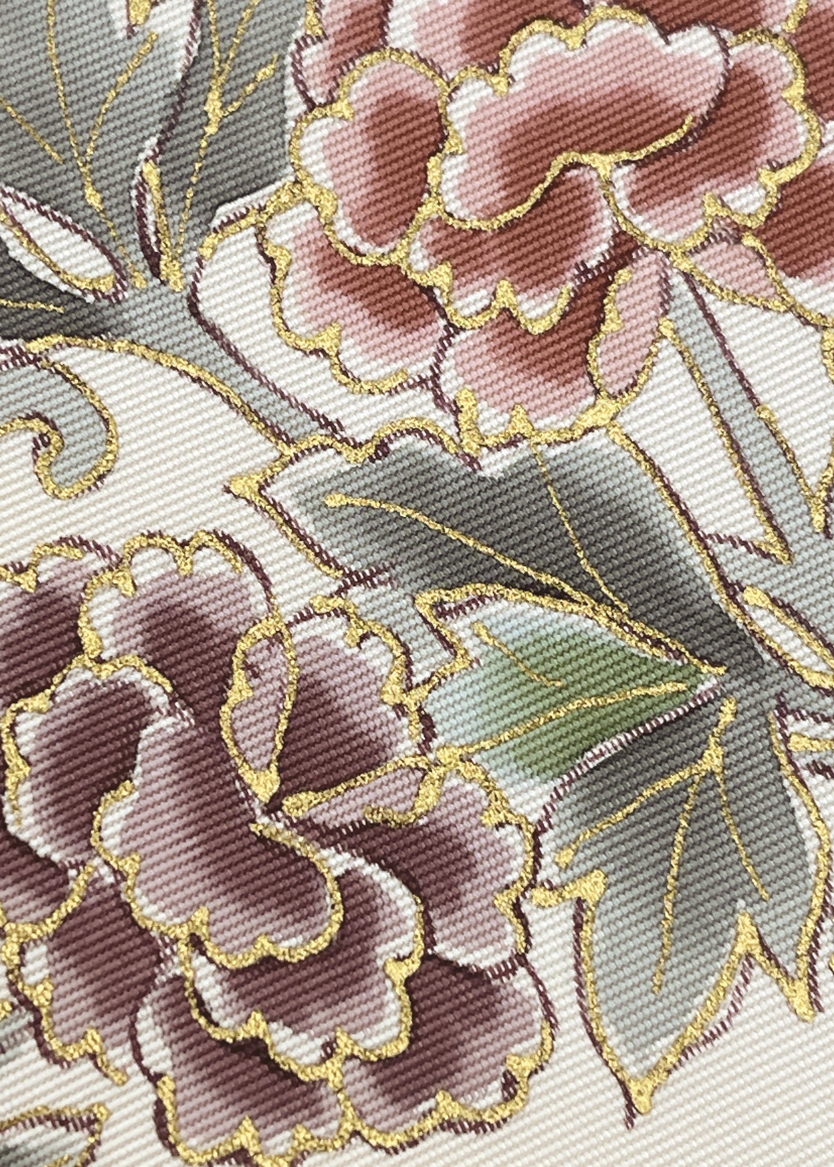 白地に更紗を連想させる花唐草が染められその上に金更紗風の染の本加工がなされています。染られた柄の輪郭を金で描き出しています。更紗には特別に定義はないようですが、主にはインドが起源で、木綿地に多色で文様を染めた布を指して呼ばれました。塩瀬の帯とは塩瀬羽二重という生地を使った染め帯でしなやかで光沢がありながらも表面に横畝(よこうね)があるのが特徴です。軽くて締めやすく季節の柄も豊富でお洒落着から付下げまで幅広く合わせることができる表情豊かな優れた気品漂う一品です。