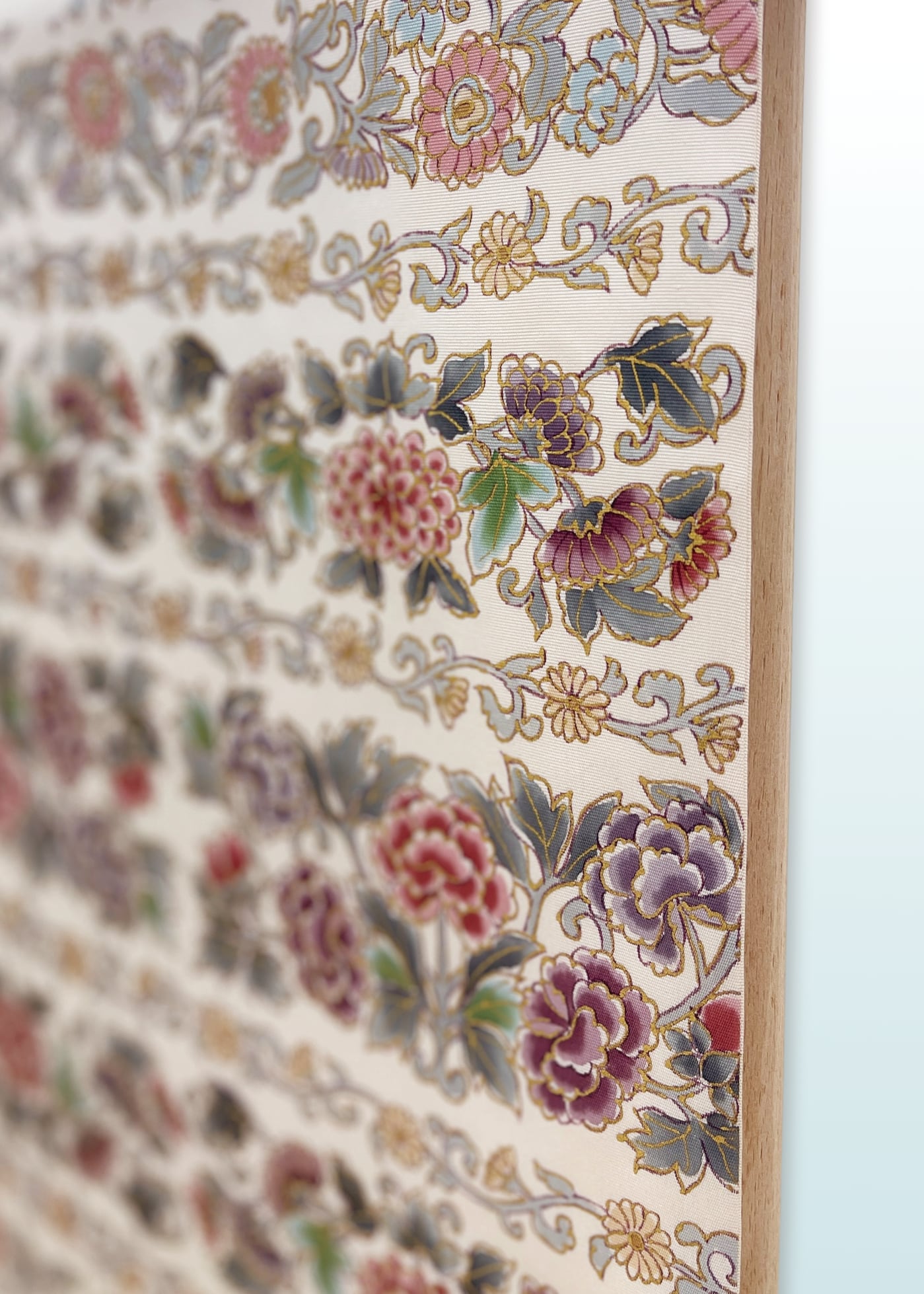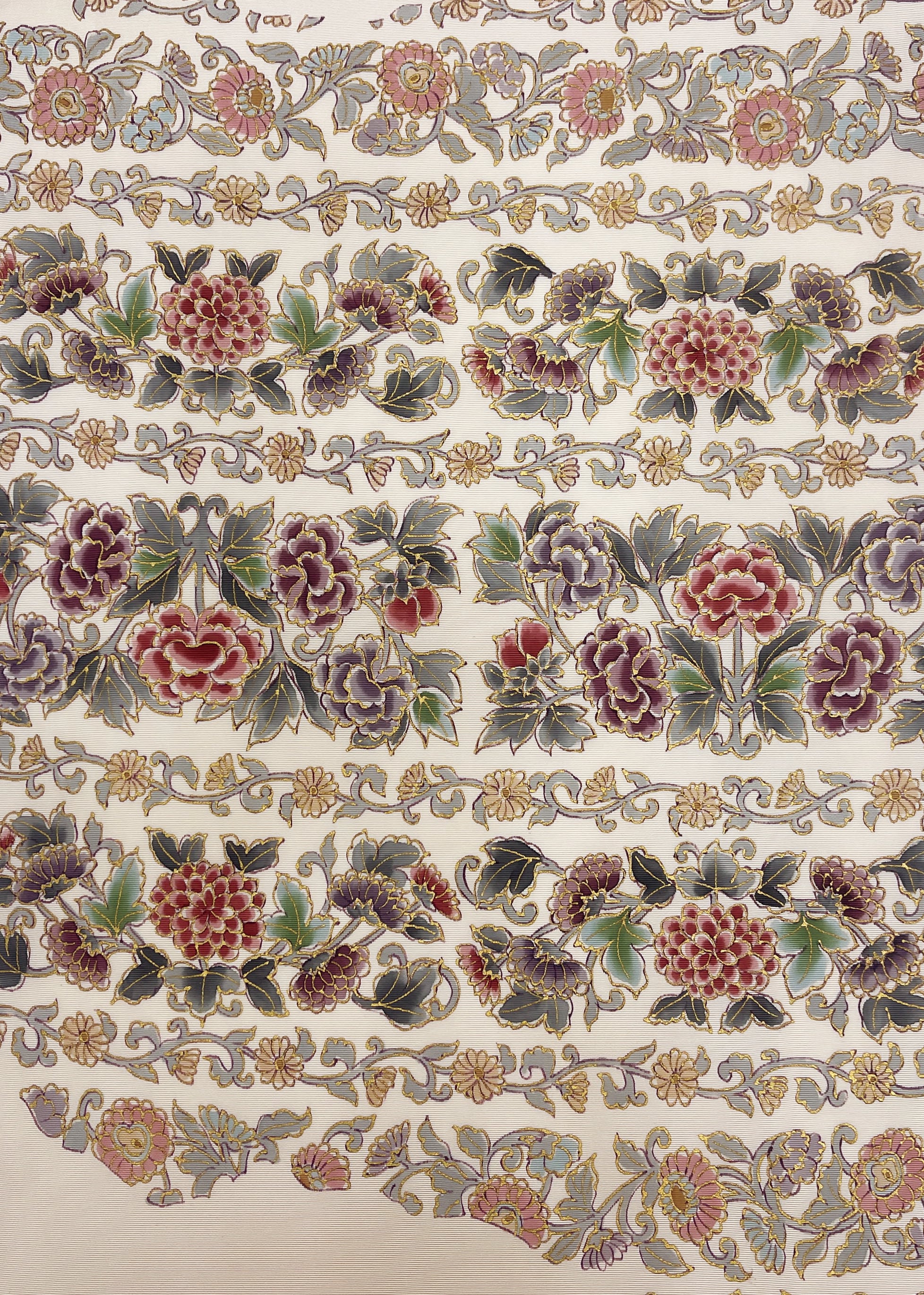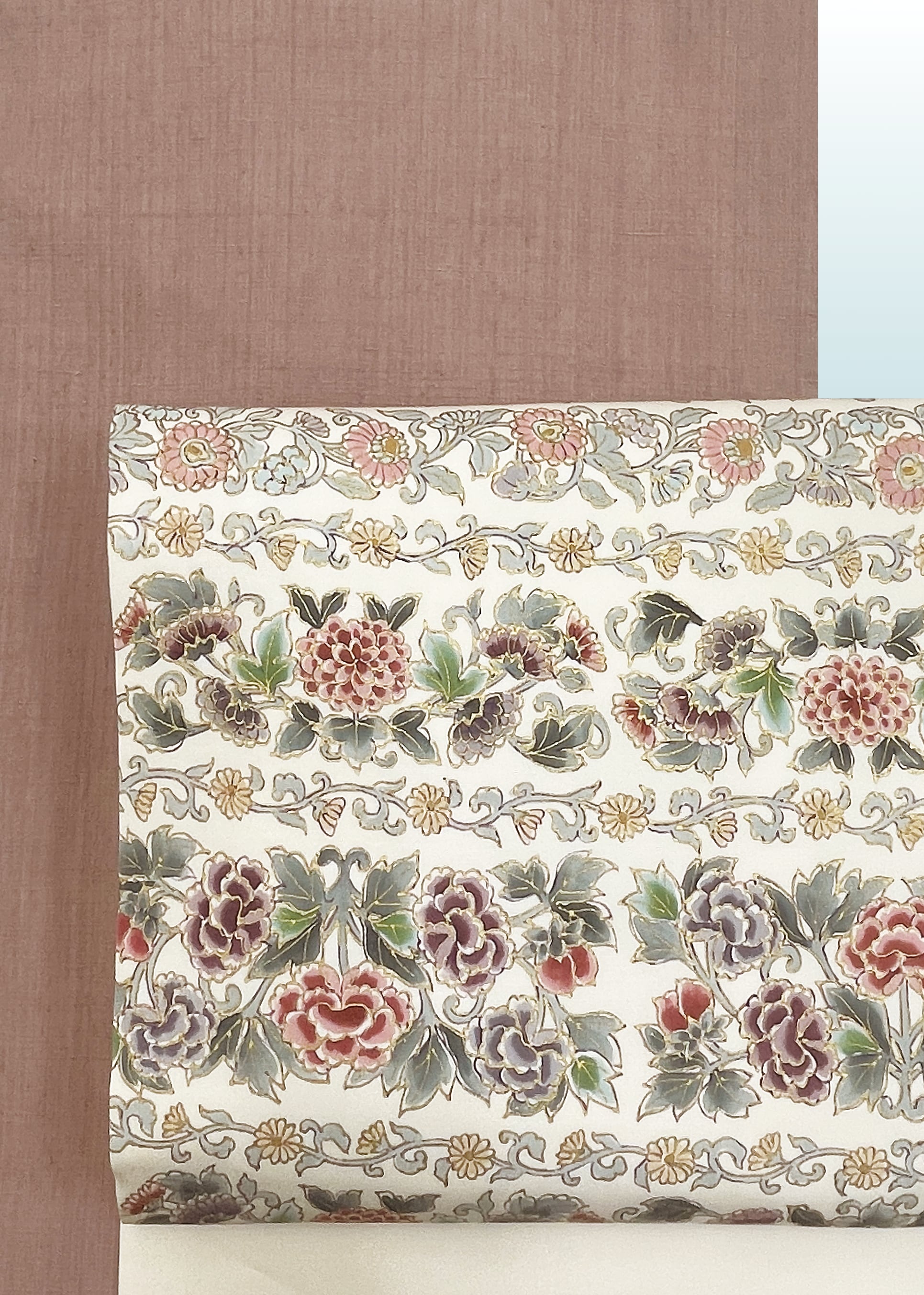 白地に更紗を連想させる花唐草が染められその上に金更紗風の染の本加工がなされています。染られた柄の輪郭を金で描き出しています。更紗には特別に定義はないようですが、主にはインドが起源で、木綿地に多色で文様を染めた布を指して呼ばれました。塩瀬の帯とは塩瀬羽二重という生地を使った染め帯でしなやかで光沢がありながらも表面に横畝(よこうね)があるのが特徴です。軽くて締めやすく季節の柄も豊富でお洒落着から付下げまで幅広く合わせることができる表情豊かな優れた気品漂う一品です。