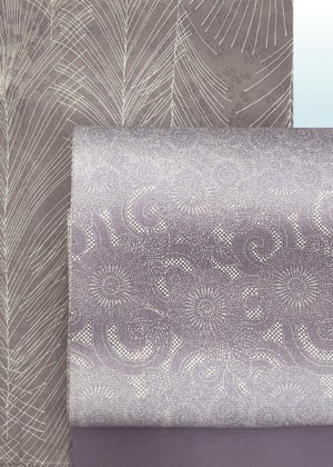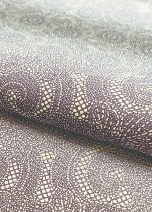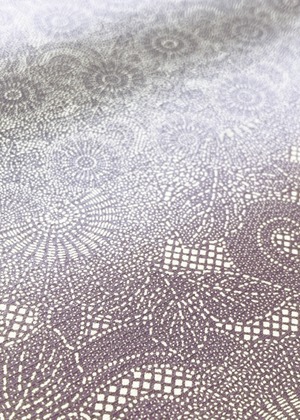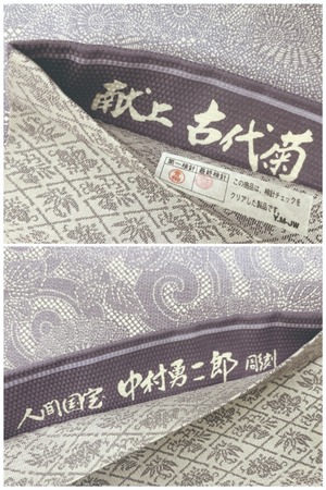 伊勢型紙道具彫の人間国宝・中村勇二郎さんの型を用いた袋帯です。こちらは菊花と唐草をモチーフとした極めて繊細な型で、中村さんの代表作として良く知られる「古代菊」。斬新に何種類の型を正確に連続させた豪華な逸品です。同じ型を2種の色で染め分けて重厚感もはっきりと表現しています。
