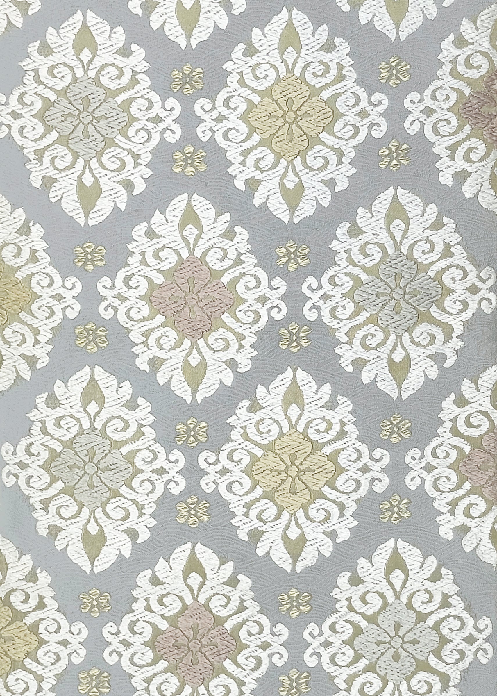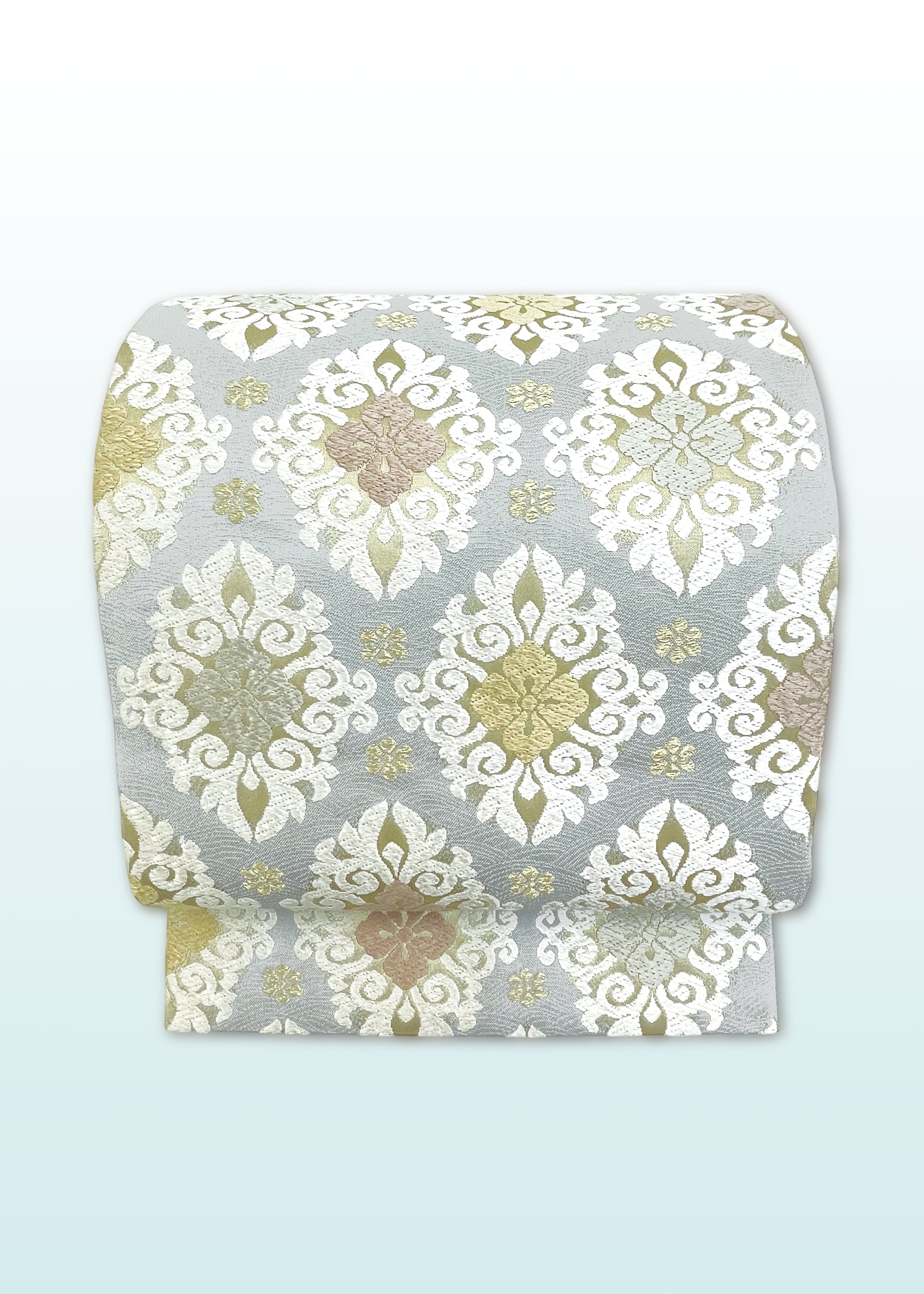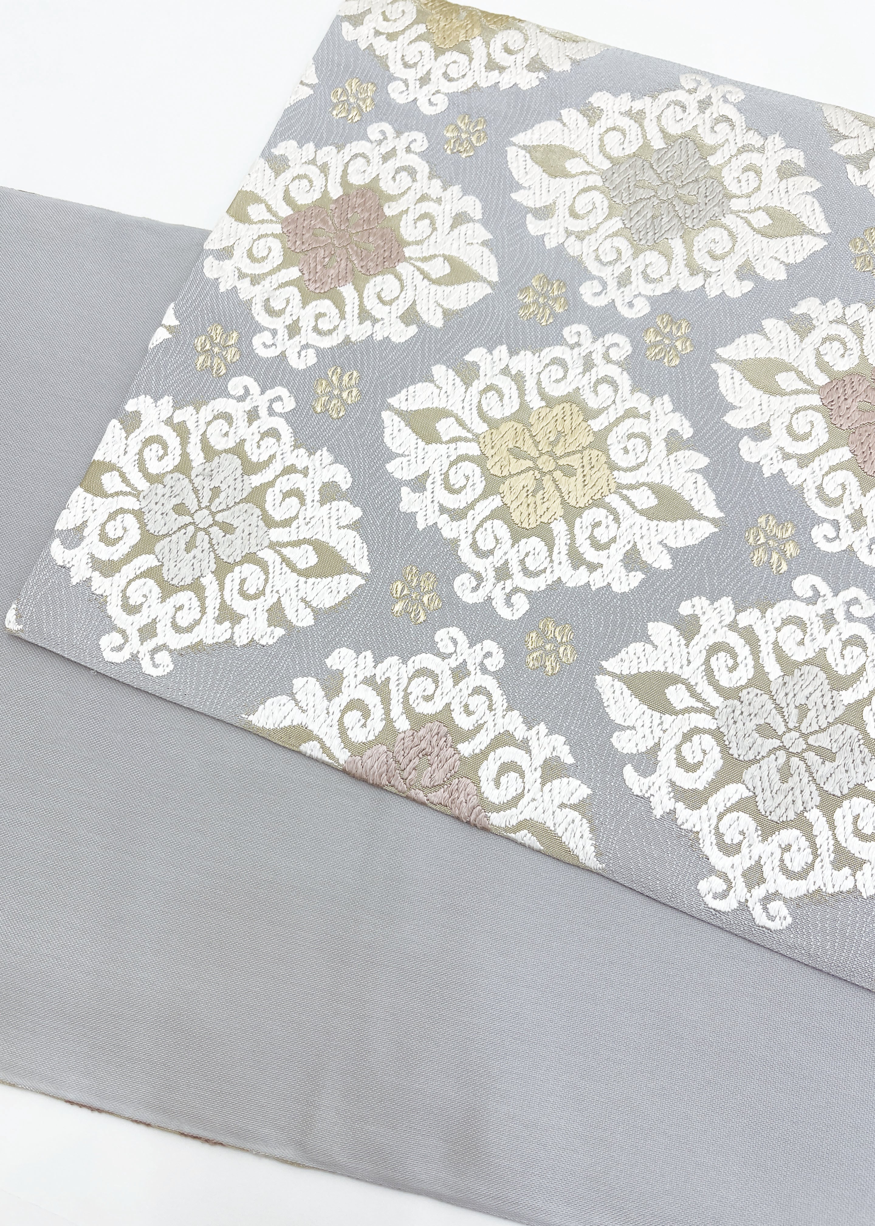 (袋帯)薄雲鼠色地 変わり花菱文唐織 LUOGO−055(リユース品)