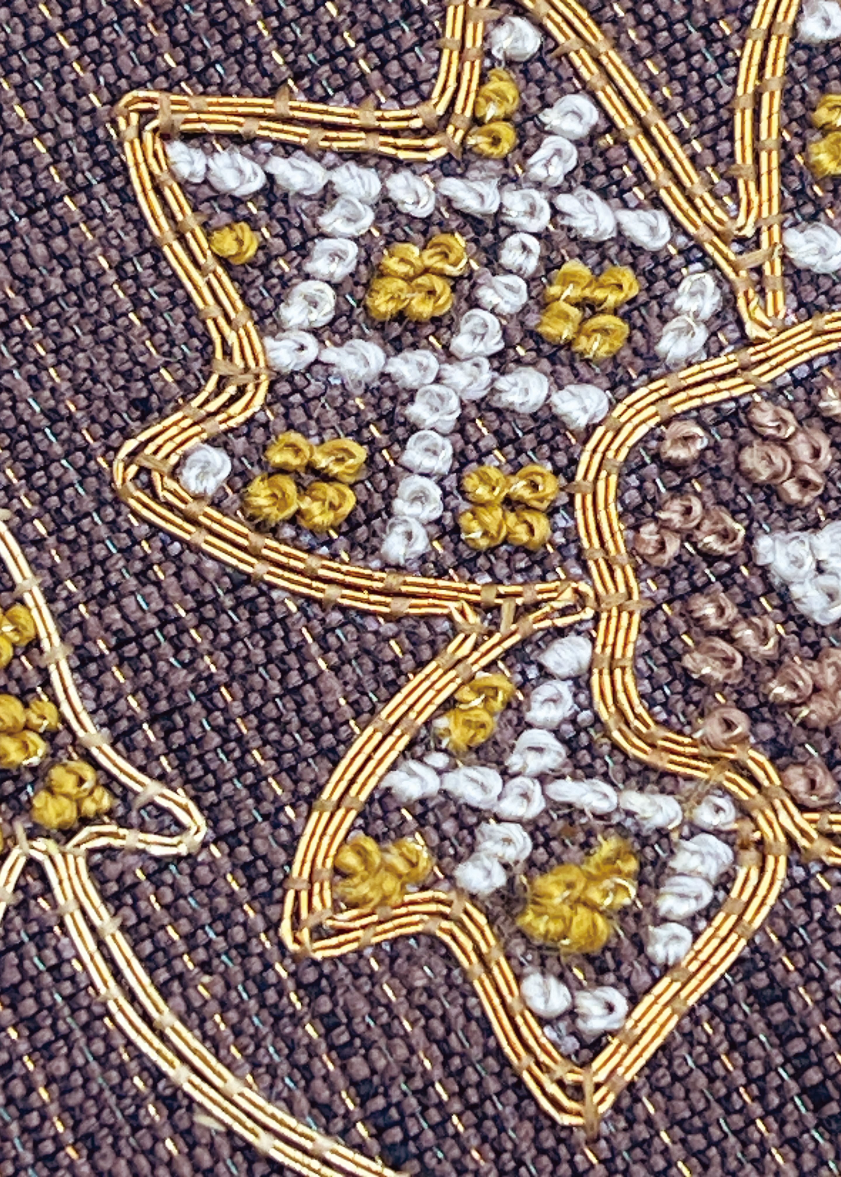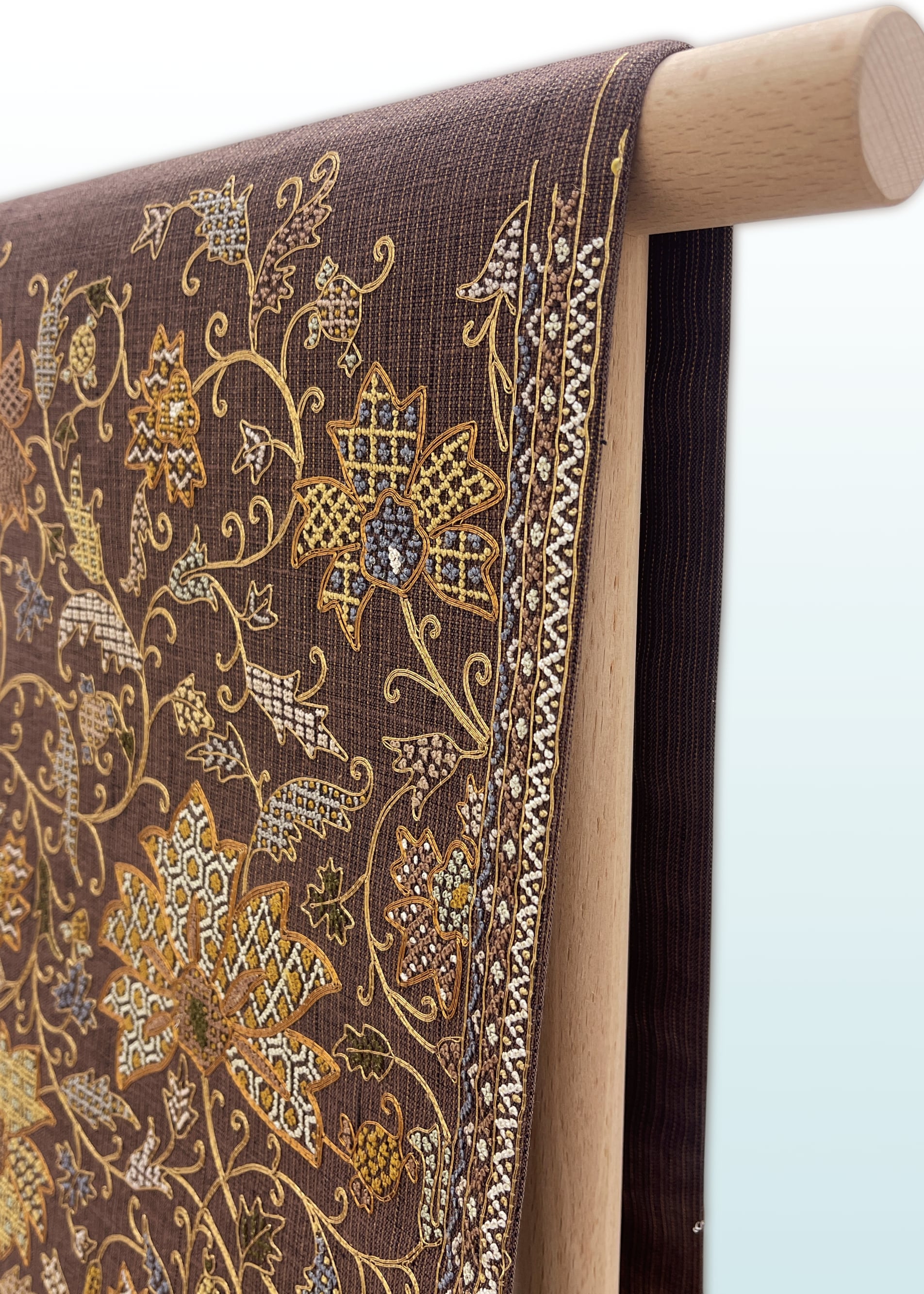 相良刺繍(さがらししゅう)は、かぎ状の針で糸をすくい上げて「玉(こぶ)」を作るように縫い、立体的な模様を表現する刺繍技法でその歴史は古く中国にまで遡ります。