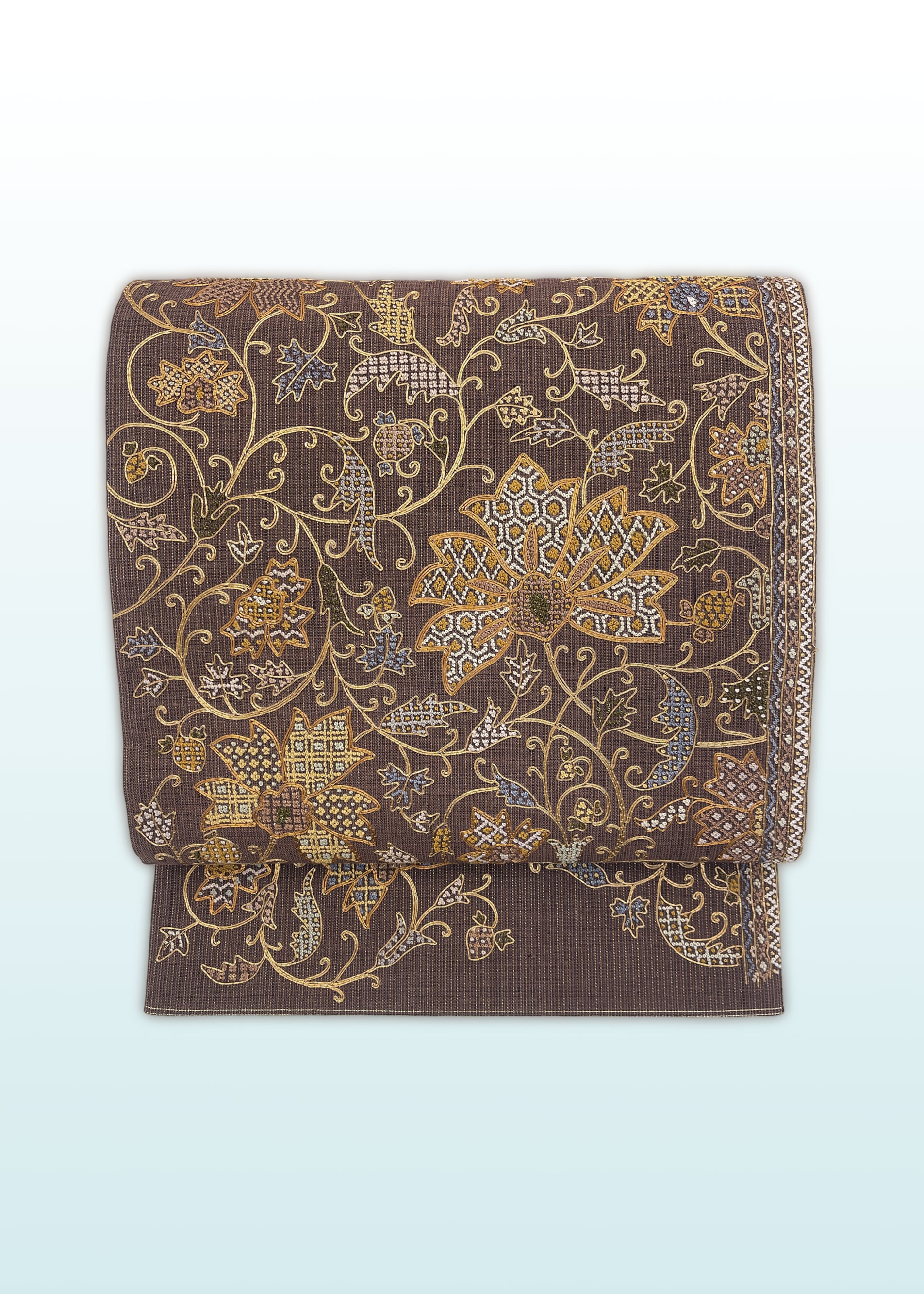 金通し地に相良刺繍で花唐草模様を表現した上品な袋帯です。