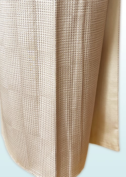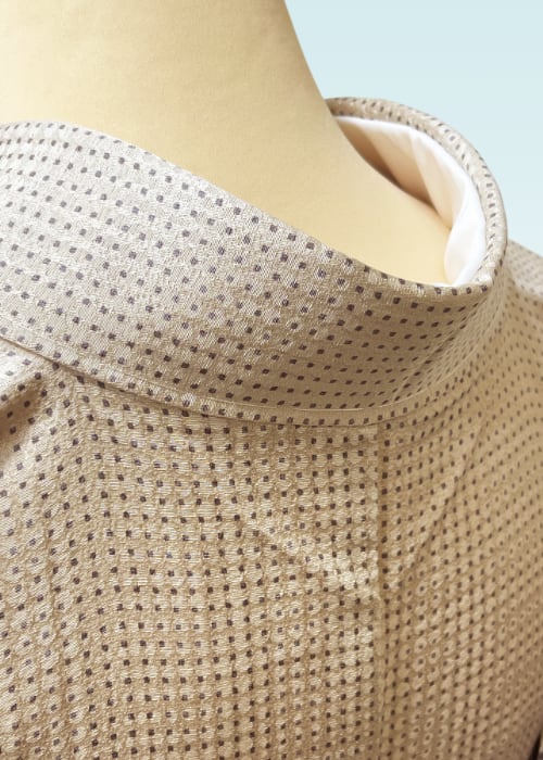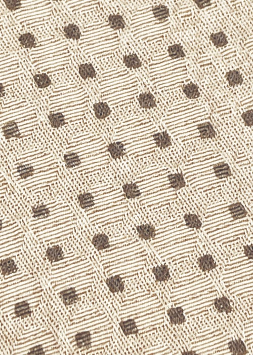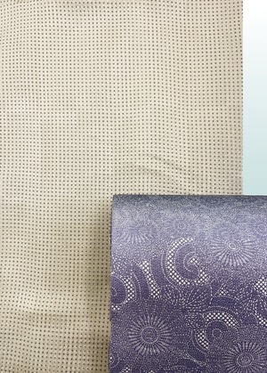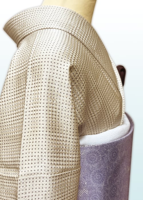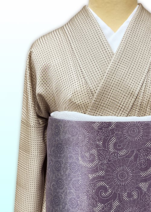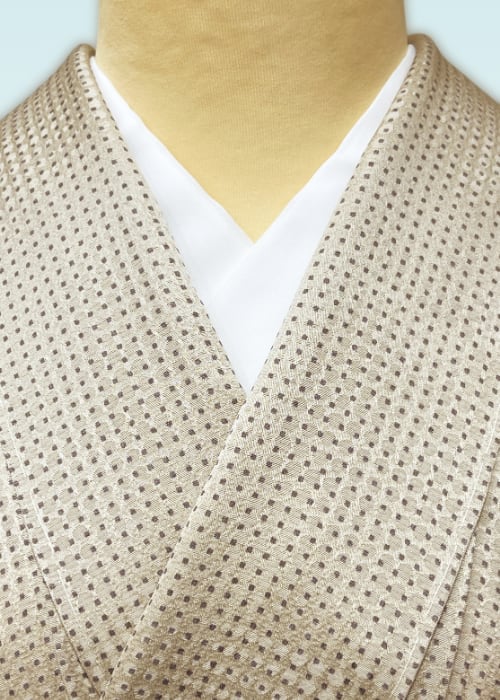 丹後ちりめん地に小さな丸ドットを織り出し、その上に小さな角ドットを染めた小紋です。