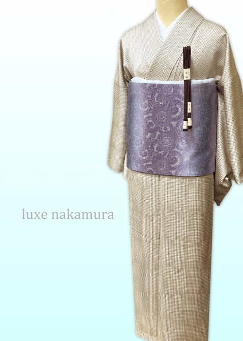 今回は江戸小紋の人間国宝中村勇二郎さんの袋帯をあわせてみました。幅広いコーディネートに活躍すると思います。
