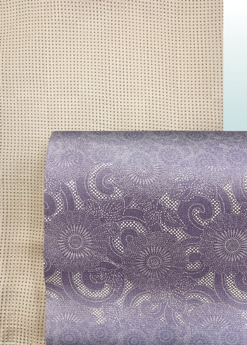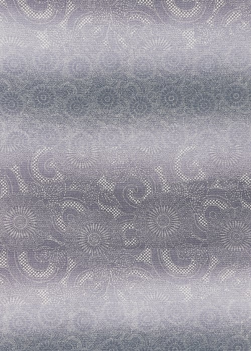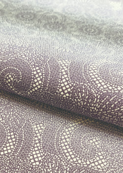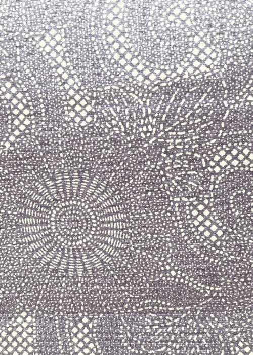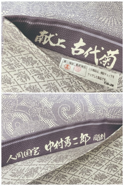 伊勢型紙道具彫の人間国宝・中村勇二郎さんの型を用いた袋帯です。こちらは菊花と唐草をモチーフとした極めて繊細な型で、中村さんの代表作として良く知られる「古代菊」。斬新に何種類もの型を正確に連続させた豪華な逸品です。同じ型を2種の色で染め分けて重厚感が感じられます。