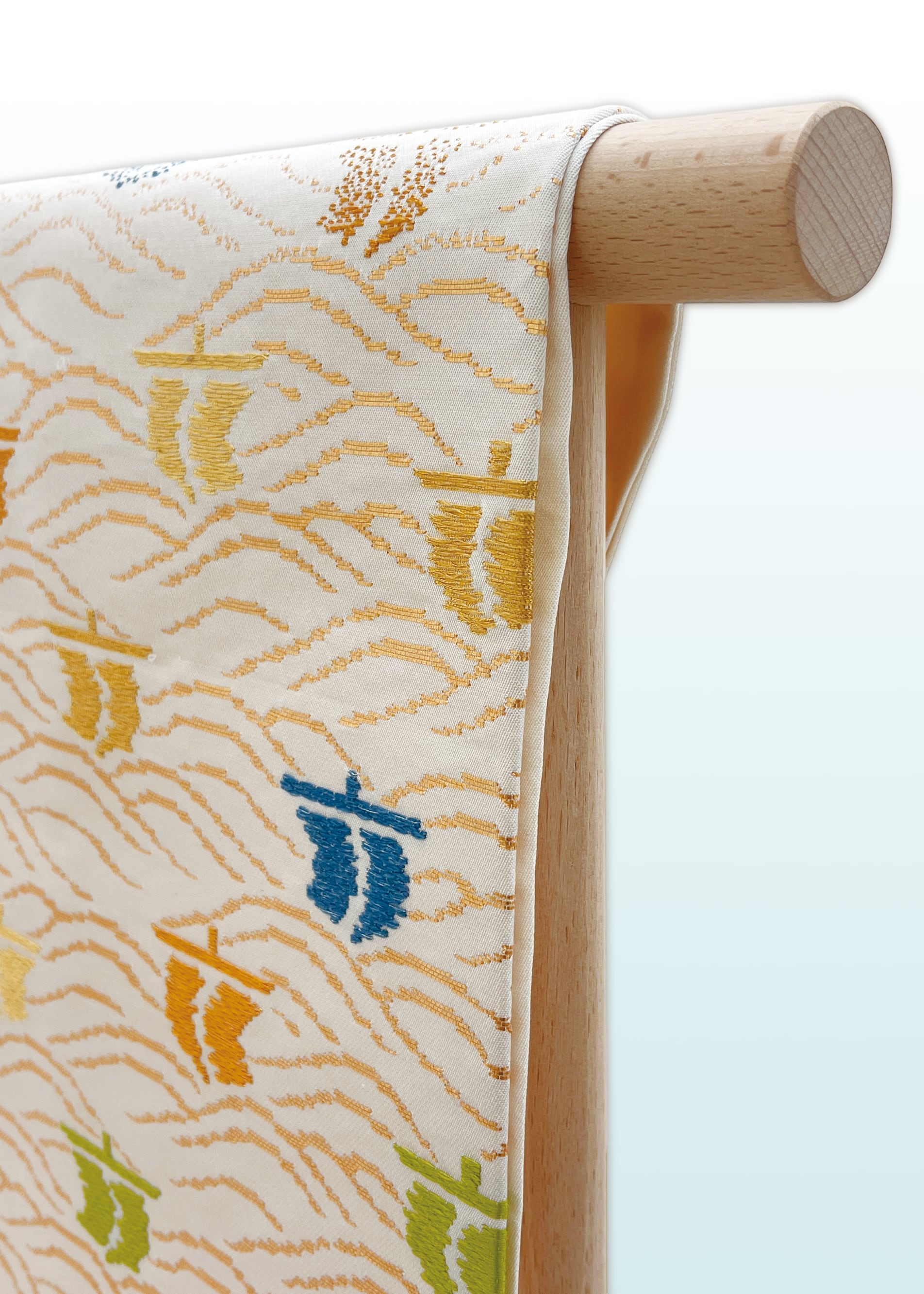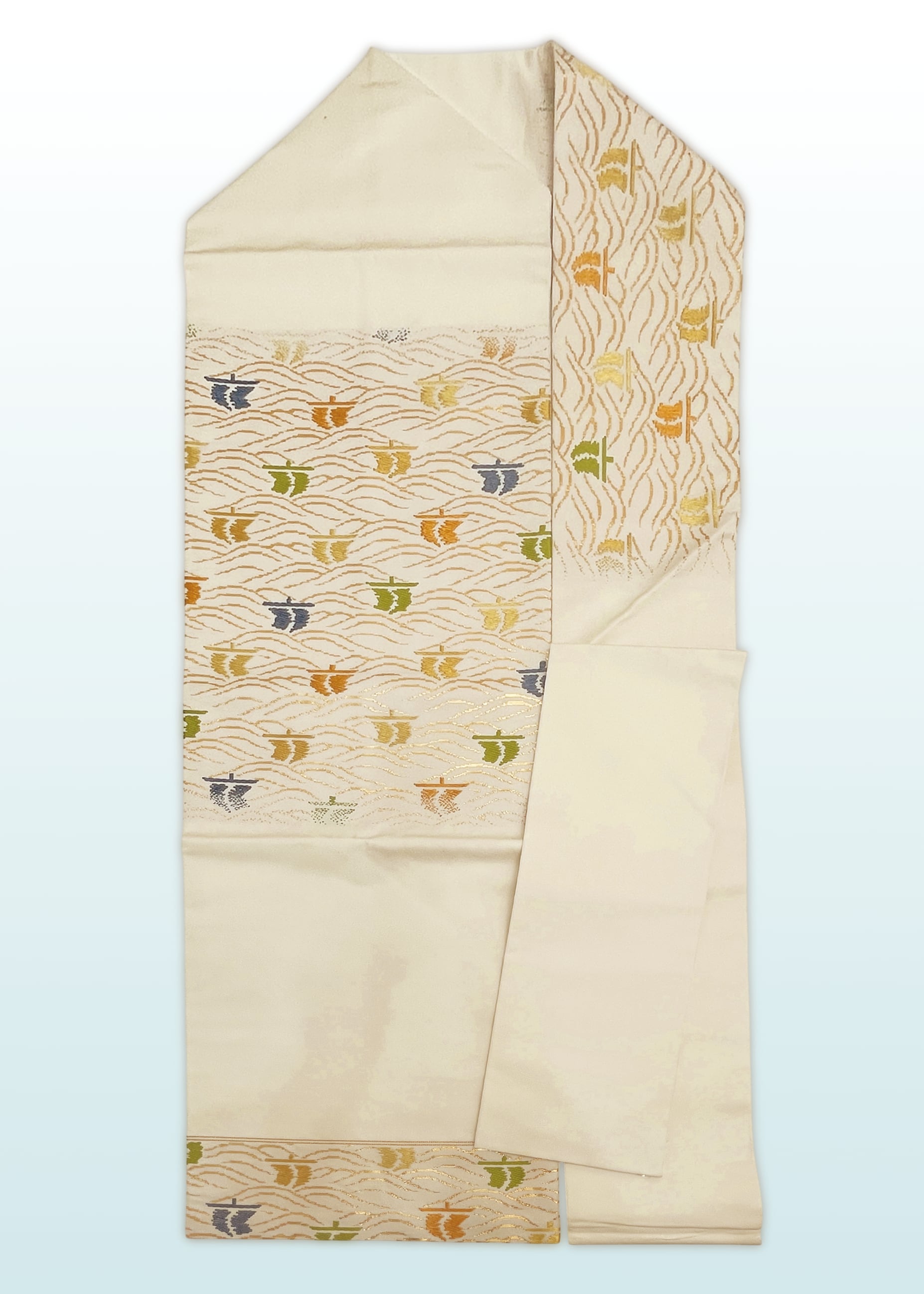波にほかけ(帆掛け舟)」の図柄は、日本の伝統的な吉祥模様(縁起の良い柄)であり主に以下の意味や願いが込められ順風満帆・未来永劫・平安な暮らし・商売繁盛・大願成就、家内安全・夫婦円満などの意味が込められています。