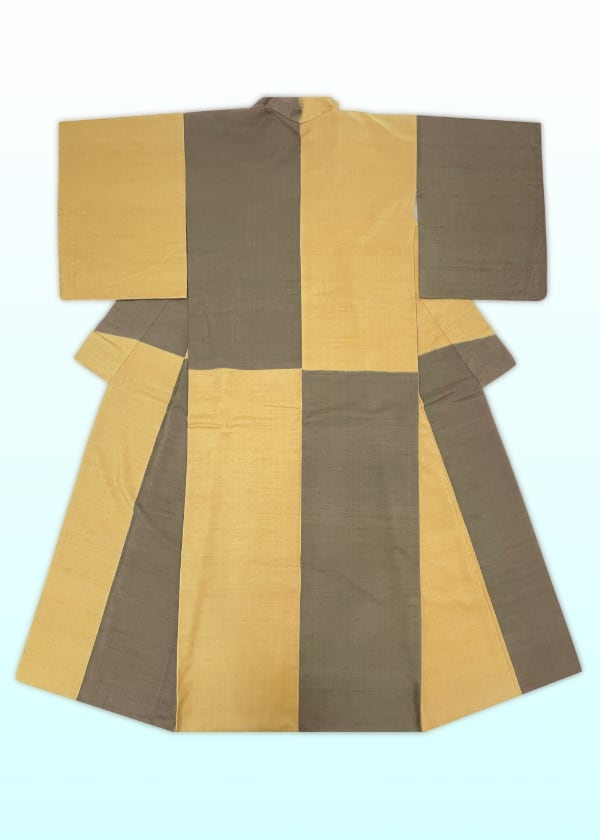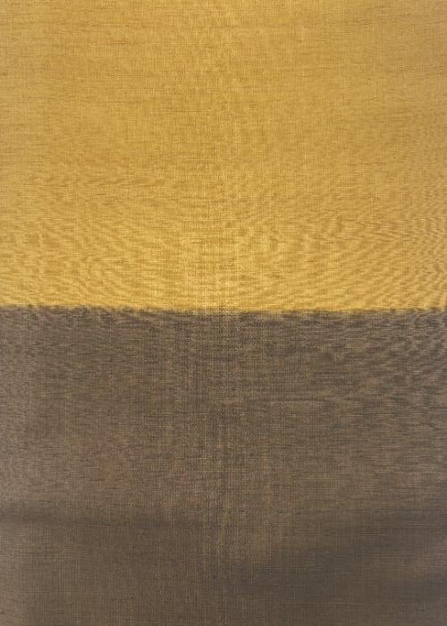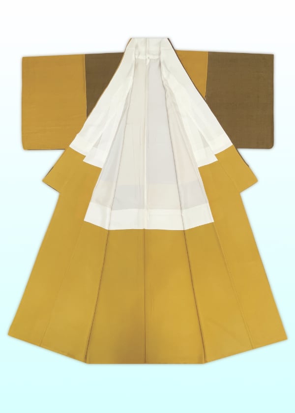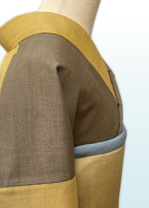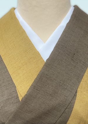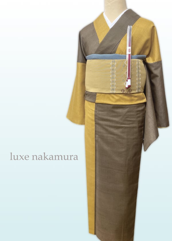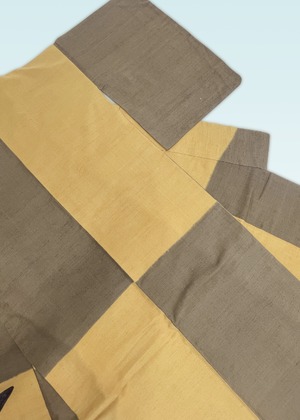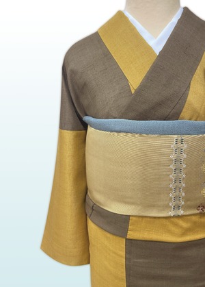 なんとも手触りのよい、柔らかでしっとりとした染紬です。枯茶色と山吹茶色の2色に染め分け、それぞれの色の配置や分量が絶妙なかっこよくモダンな一枚です。