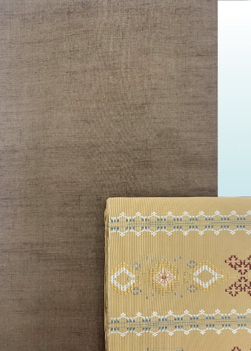 今回は綴地に琉球花織を施した八寸名古屋帯を合わせてみました。綴地の花織はたいへん珍しいものです。凛としたデザイン、素材感を持つこの帯を合わせる事で深みのあるコーディネートとなりました。