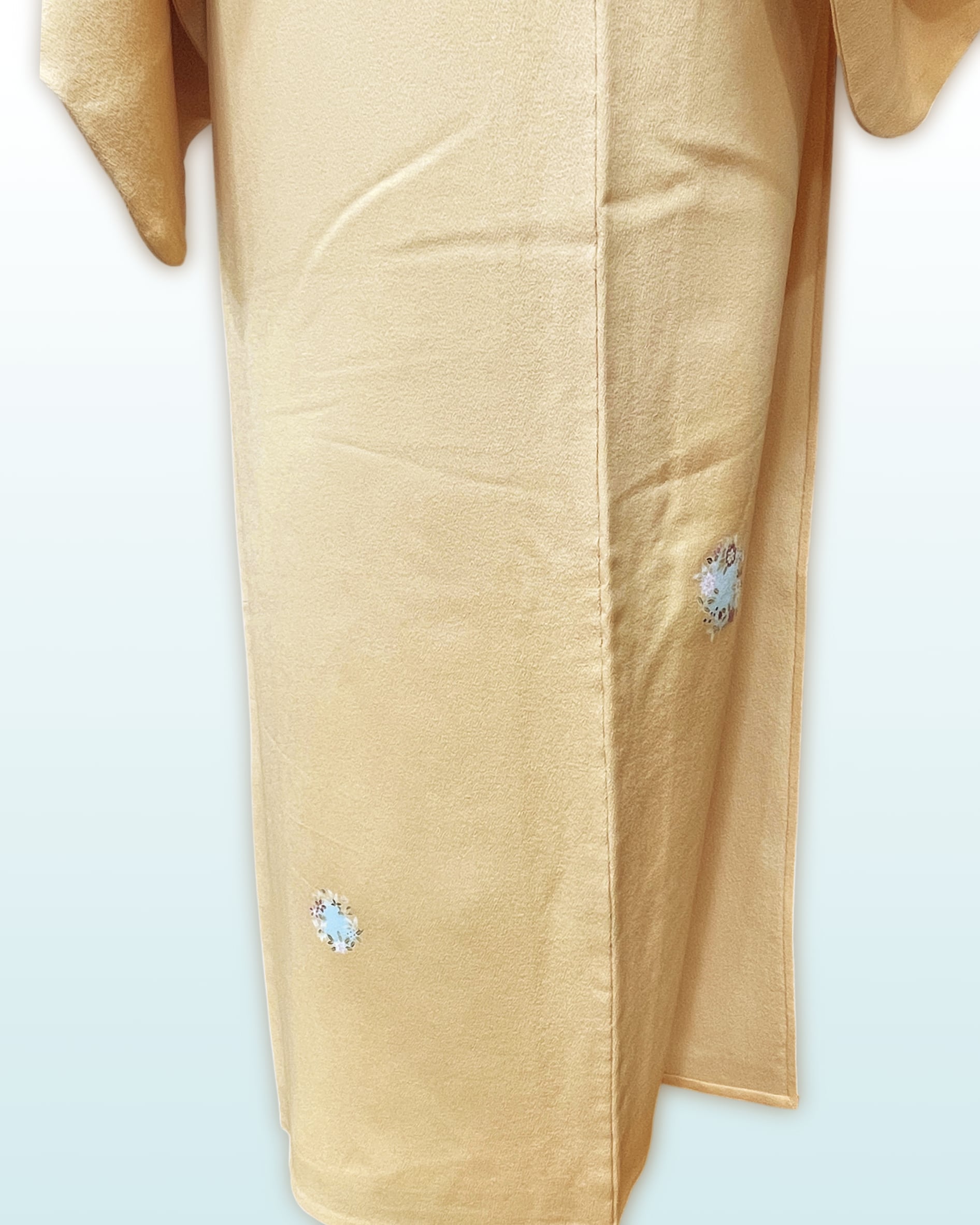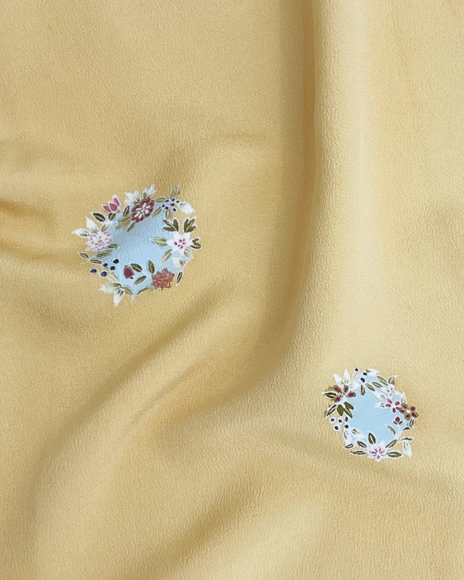 今回ご紹介させていただくお単衣は、淡い黄色に愛らしい小花丸文が散りばめられた付け下げです。