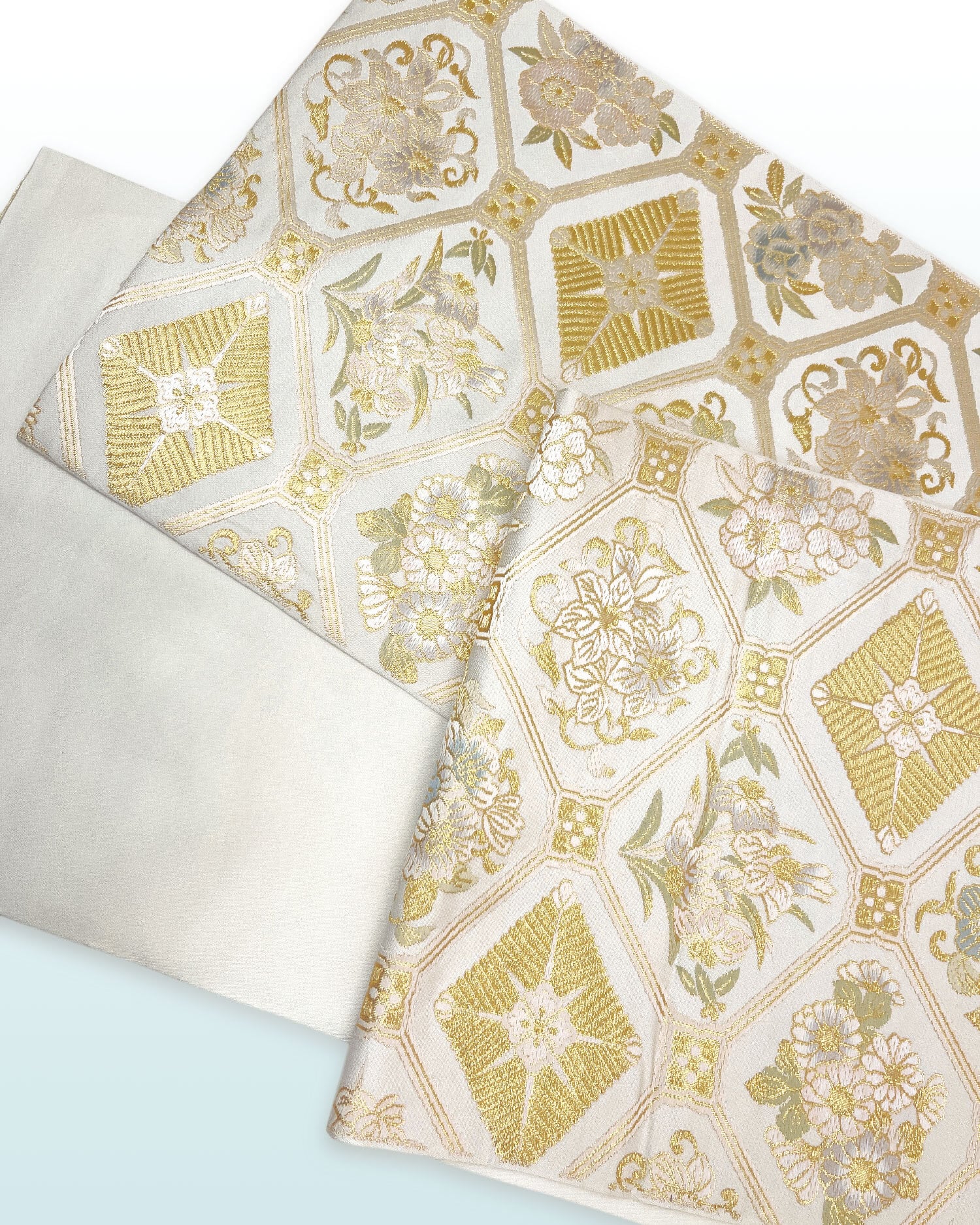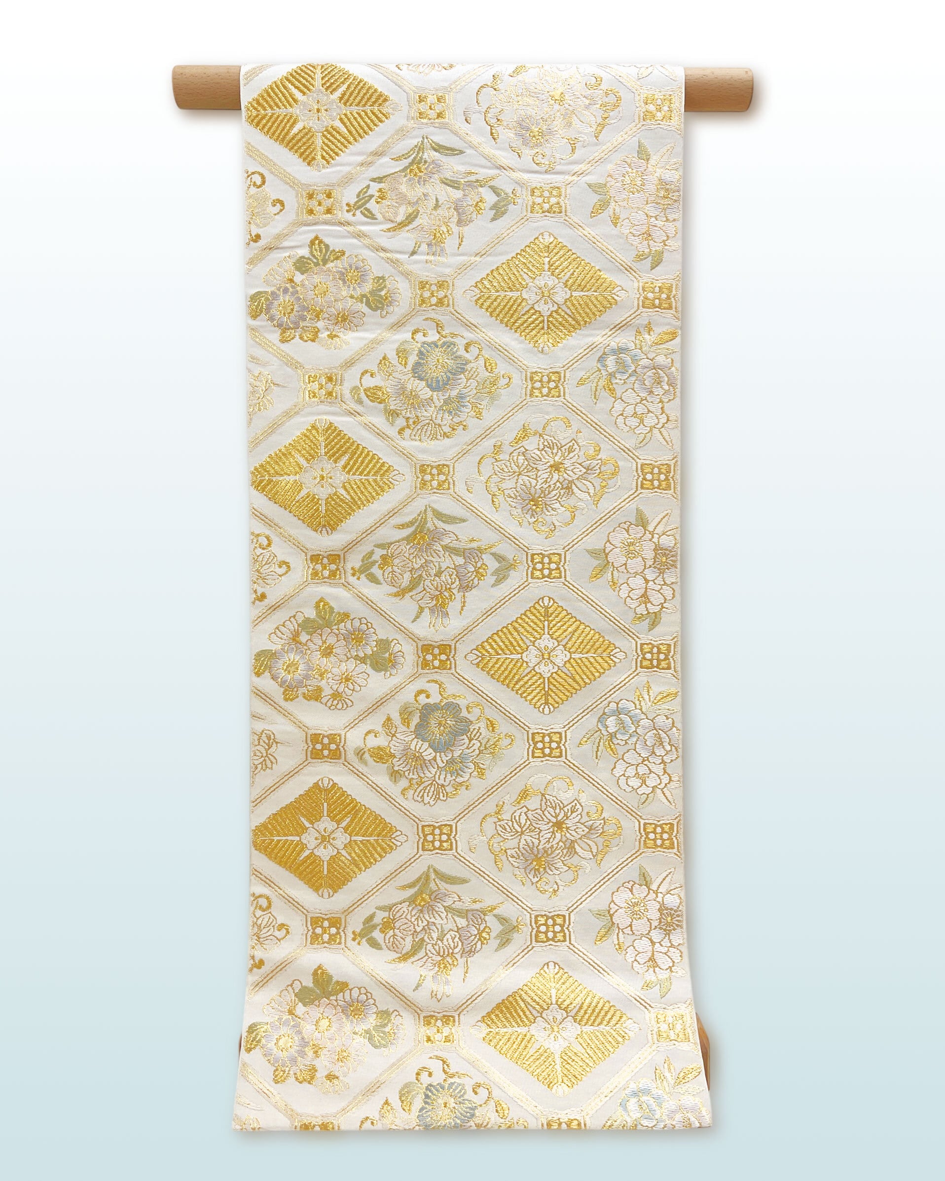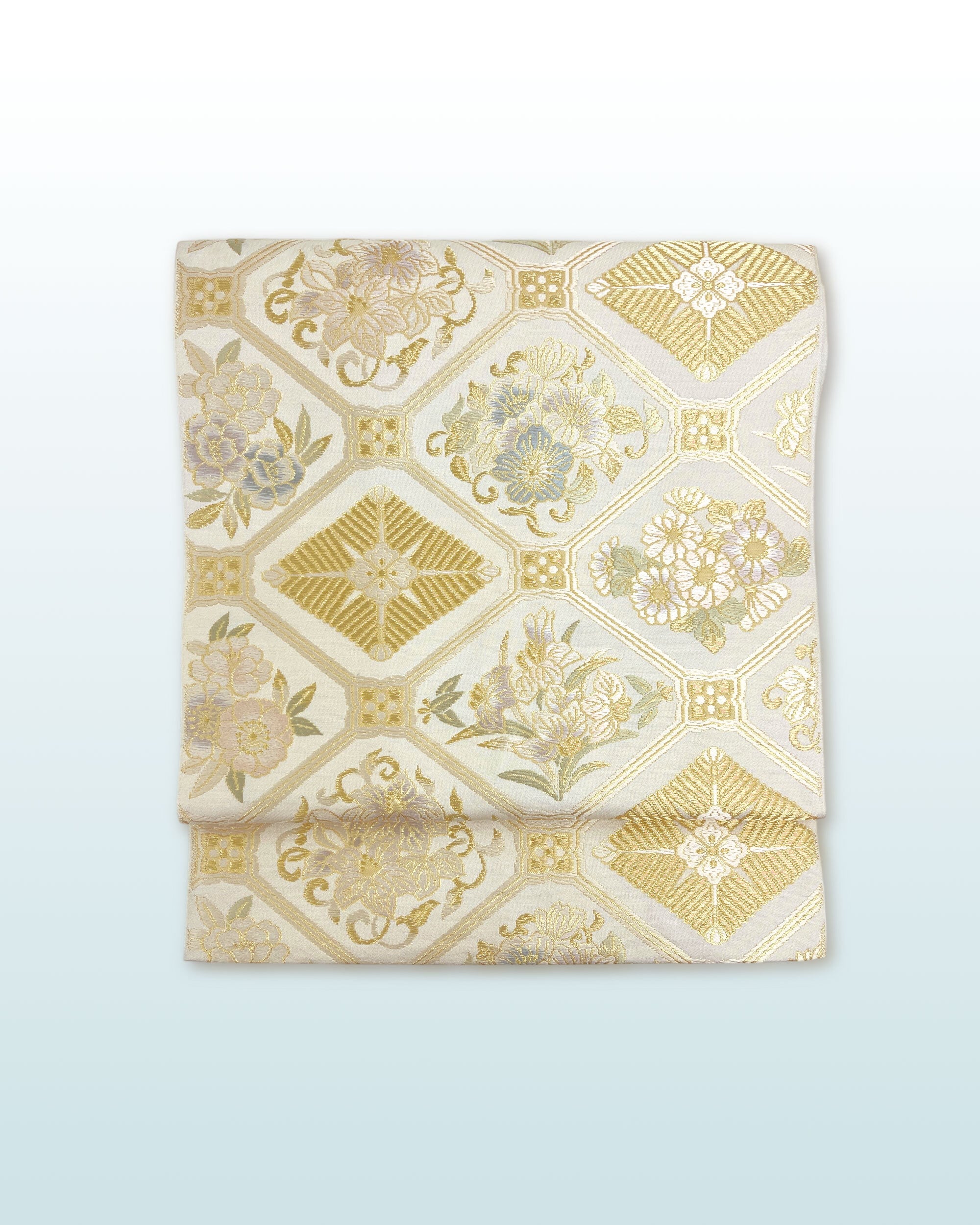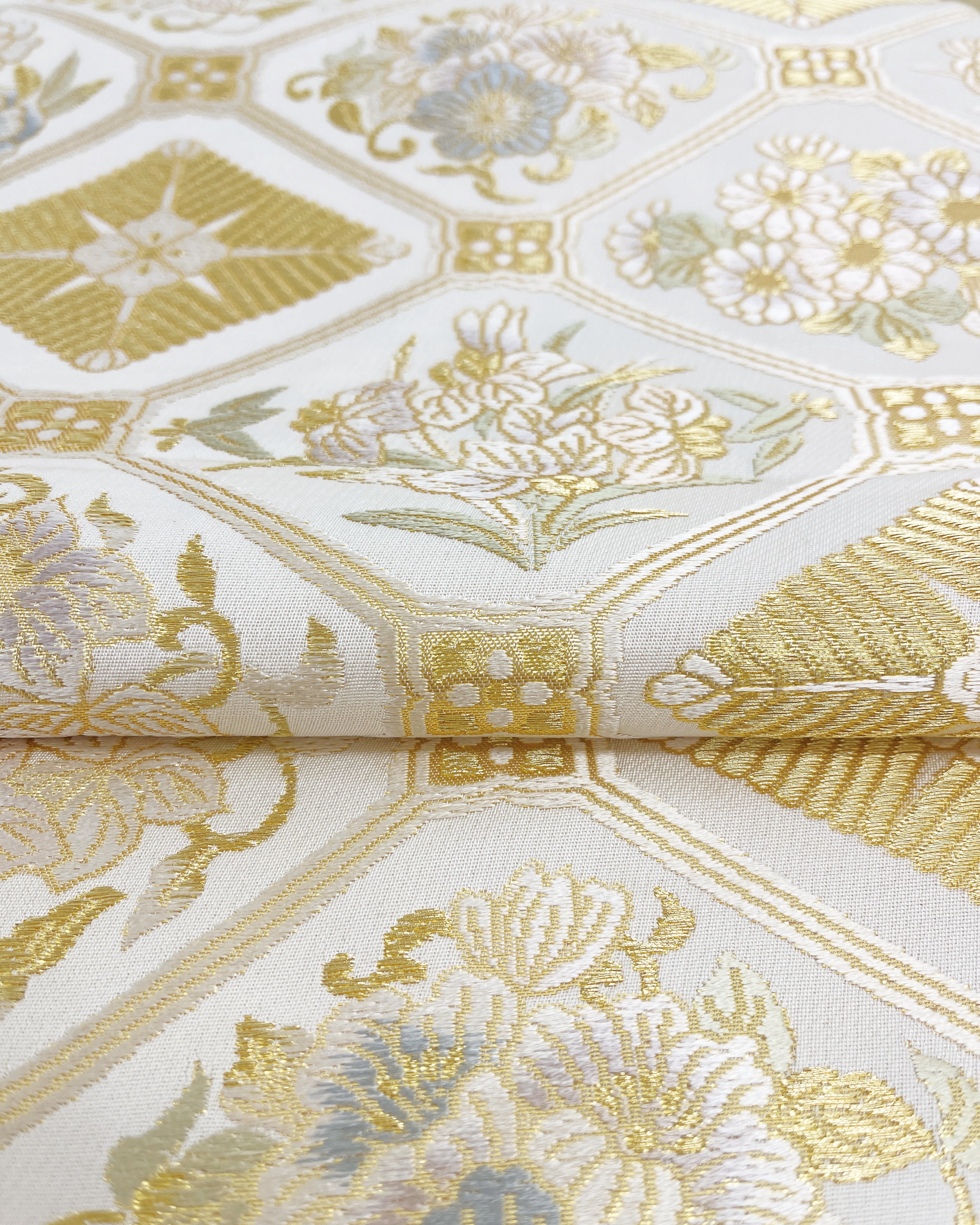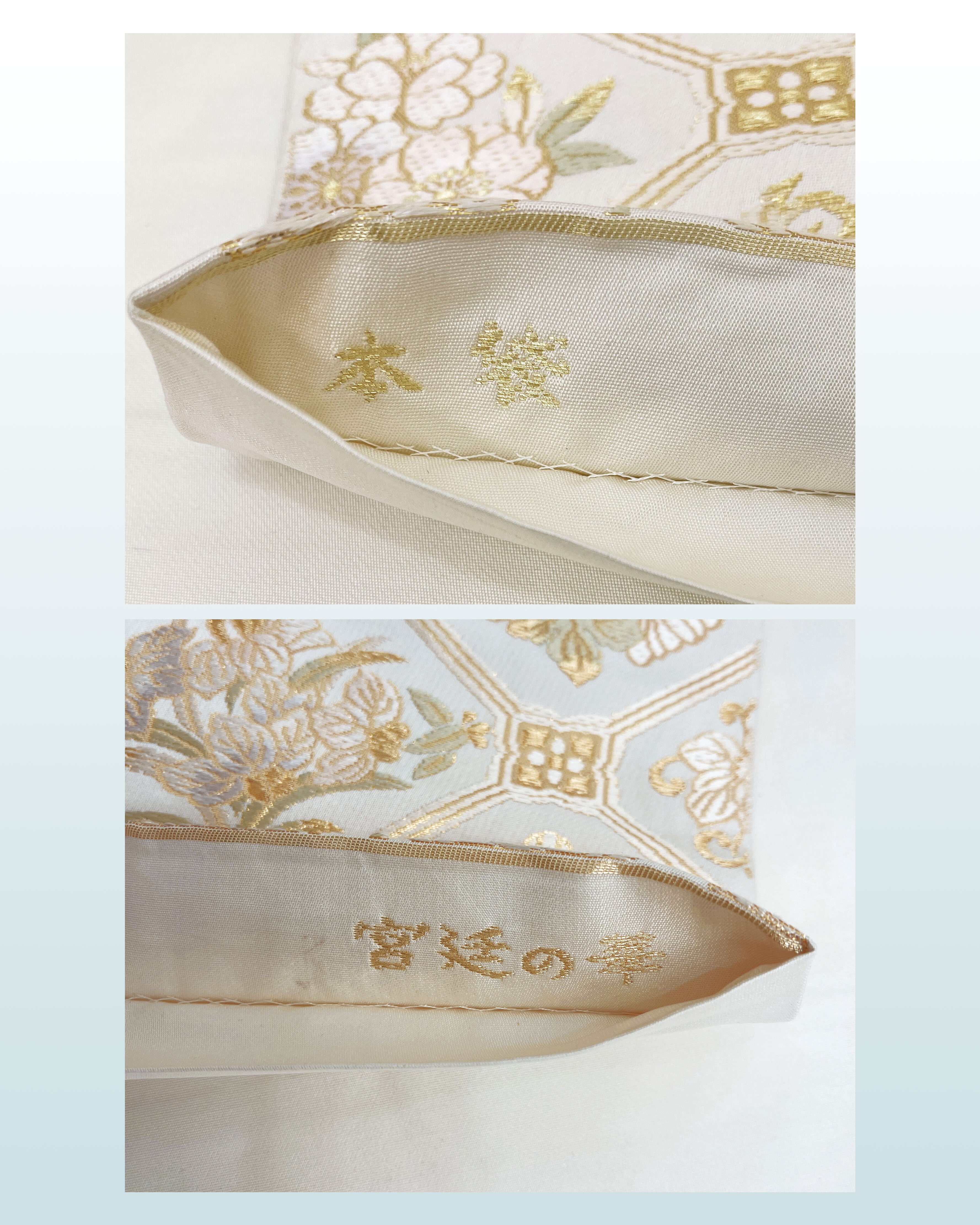 金糸をふんだんに用い菱や花菱、四季の草花を織り込んだ意匠は、華やかさの中にも気品を感じさせます。