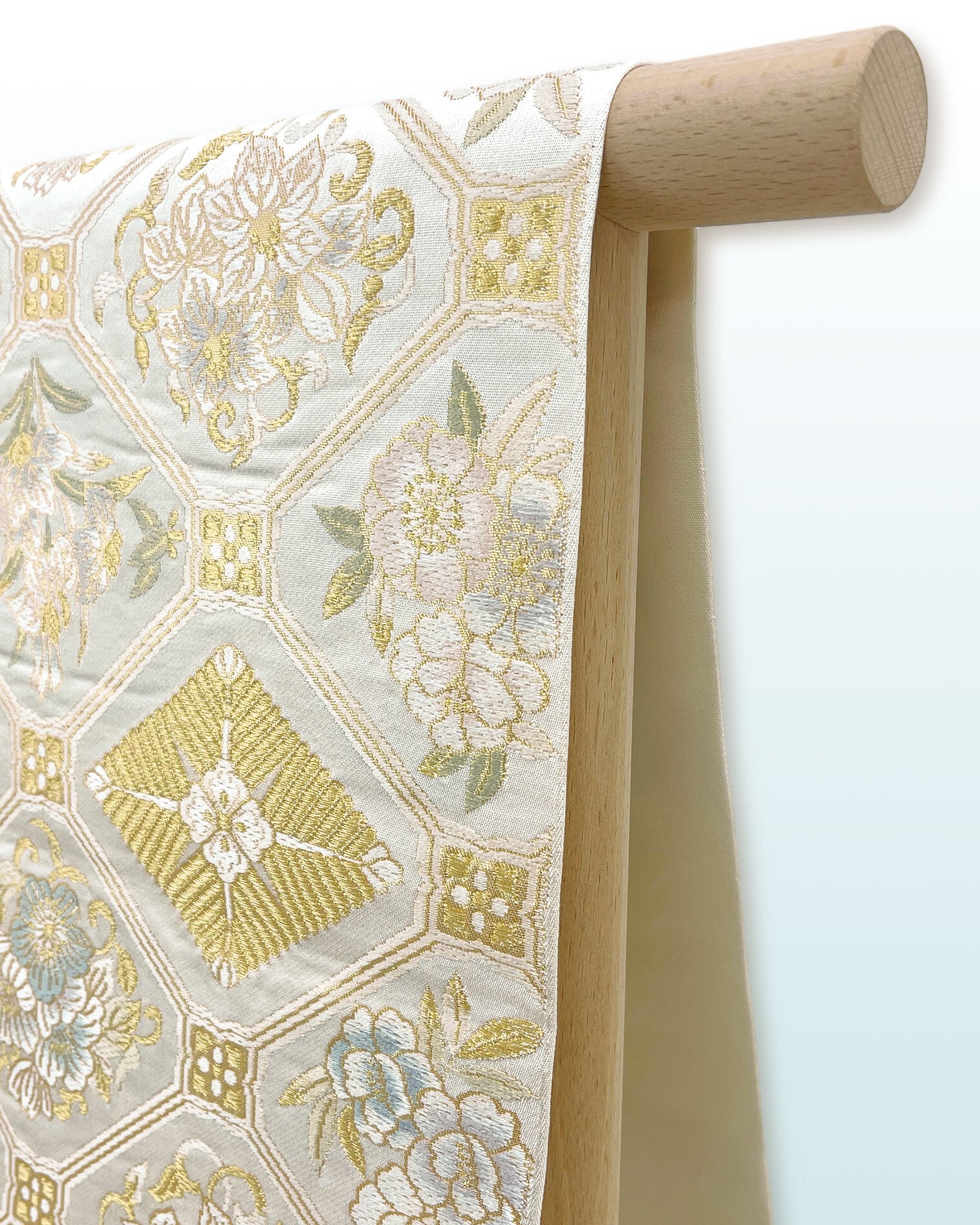 やわらかな色調の中に金の輝きが映え、訪問着や付下げ、色無地などに合わせて、結婚式や式典、パーティーなどフォーマルな場に好ましい一枚です。
